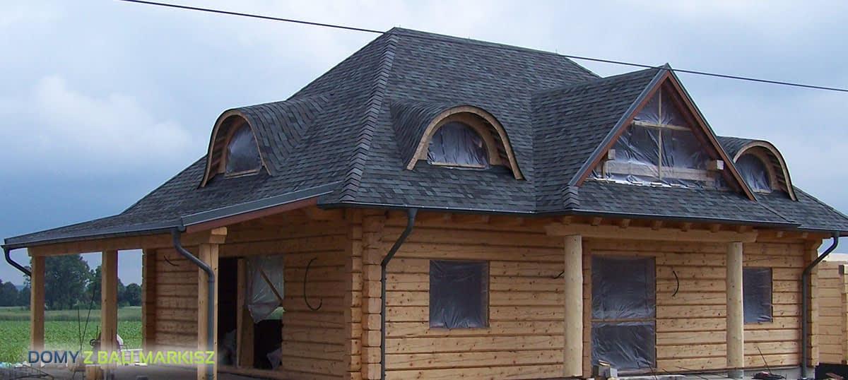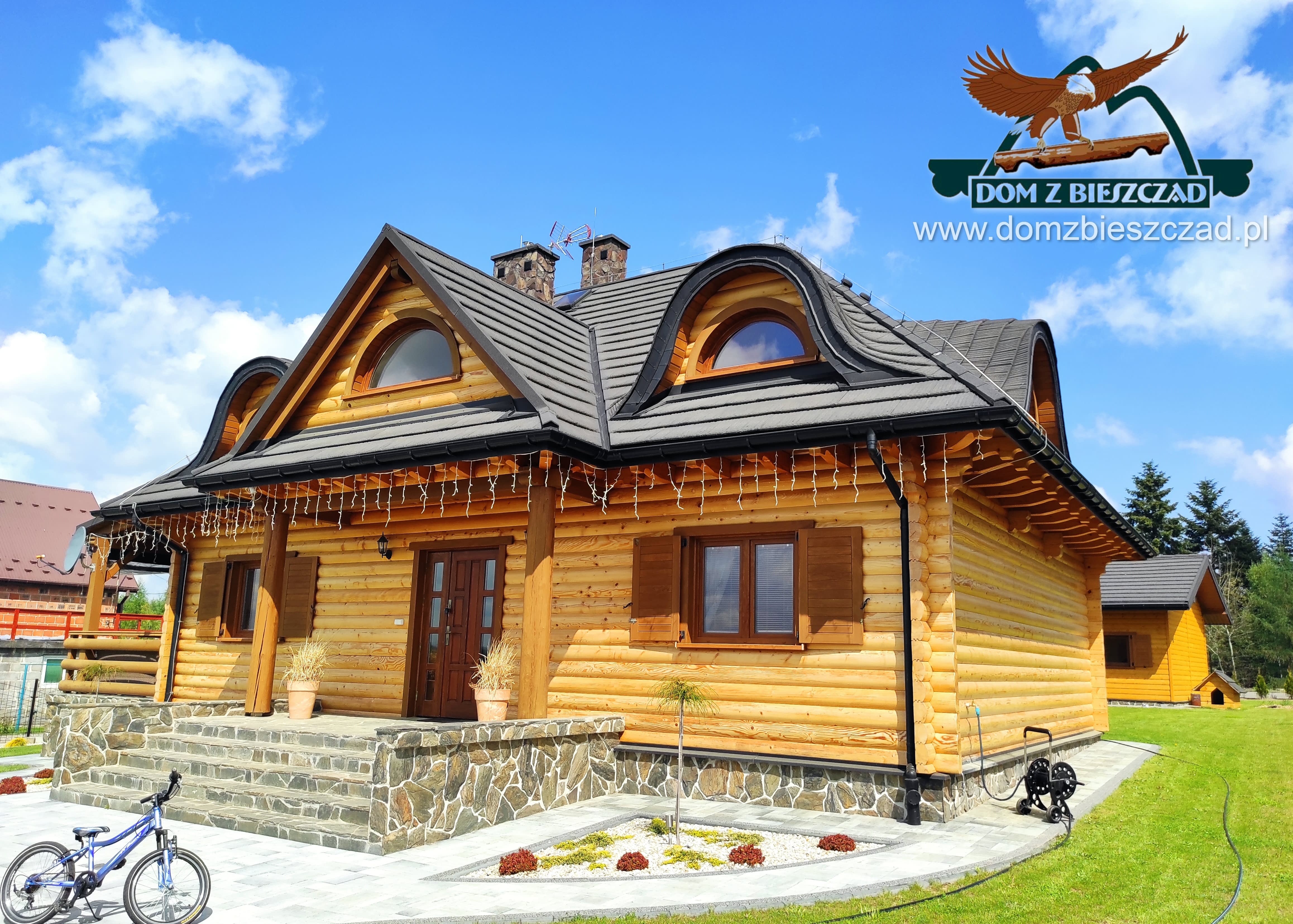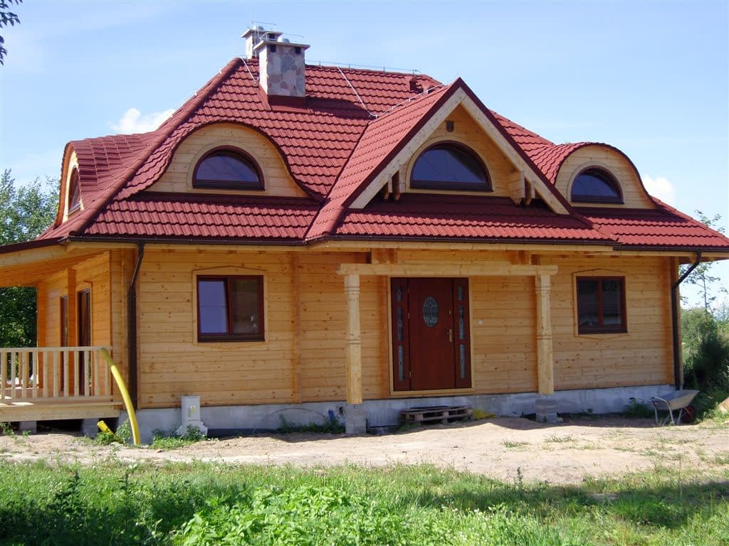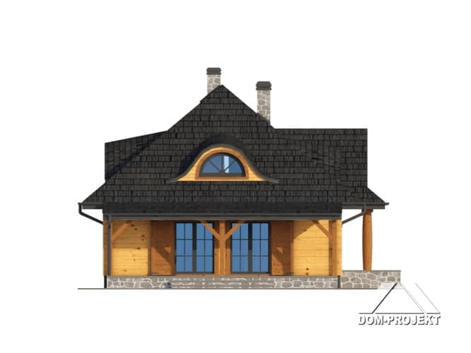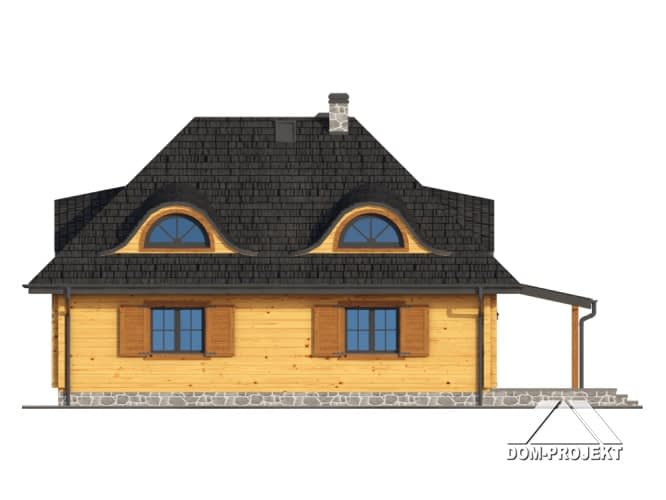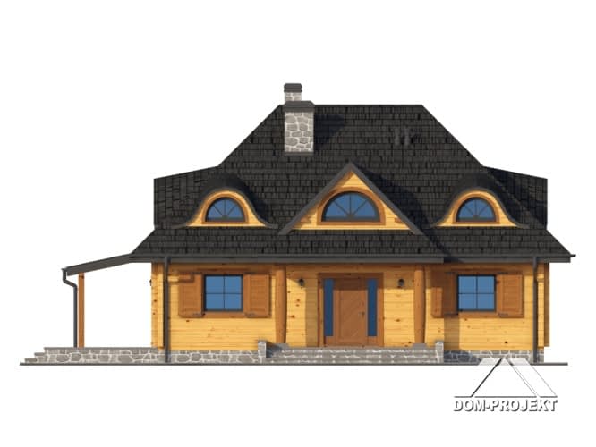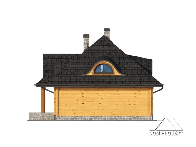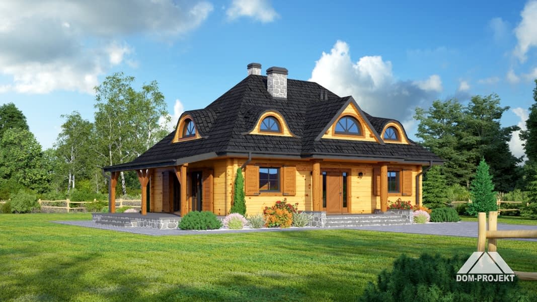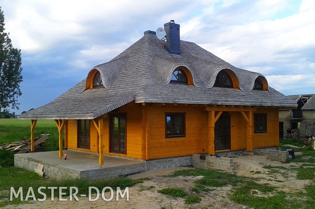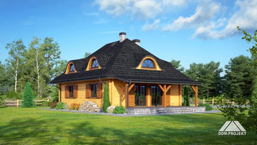 Dom z bali drewnianych. Architektura budynku nawiązuje do tradycji polskiego dworu drewnianego. Duży salon z aneksem kuchennym, kominkiem i wyjściem na zadaszony taras. Pokój, łazienka, wiatrołap, komunikacja, kotłownia. Na poddaszu trzy pokoje, antresola i pustka nad częścią salonu, łazienka i komunikacja.Rzuty