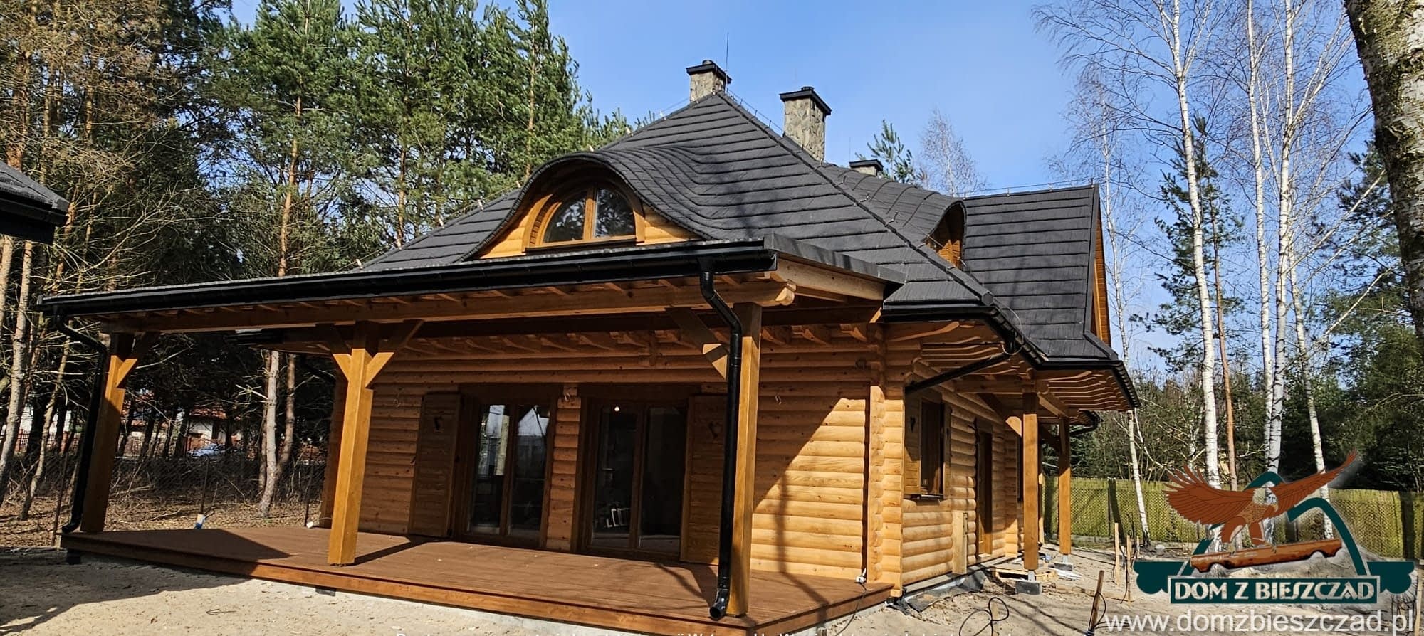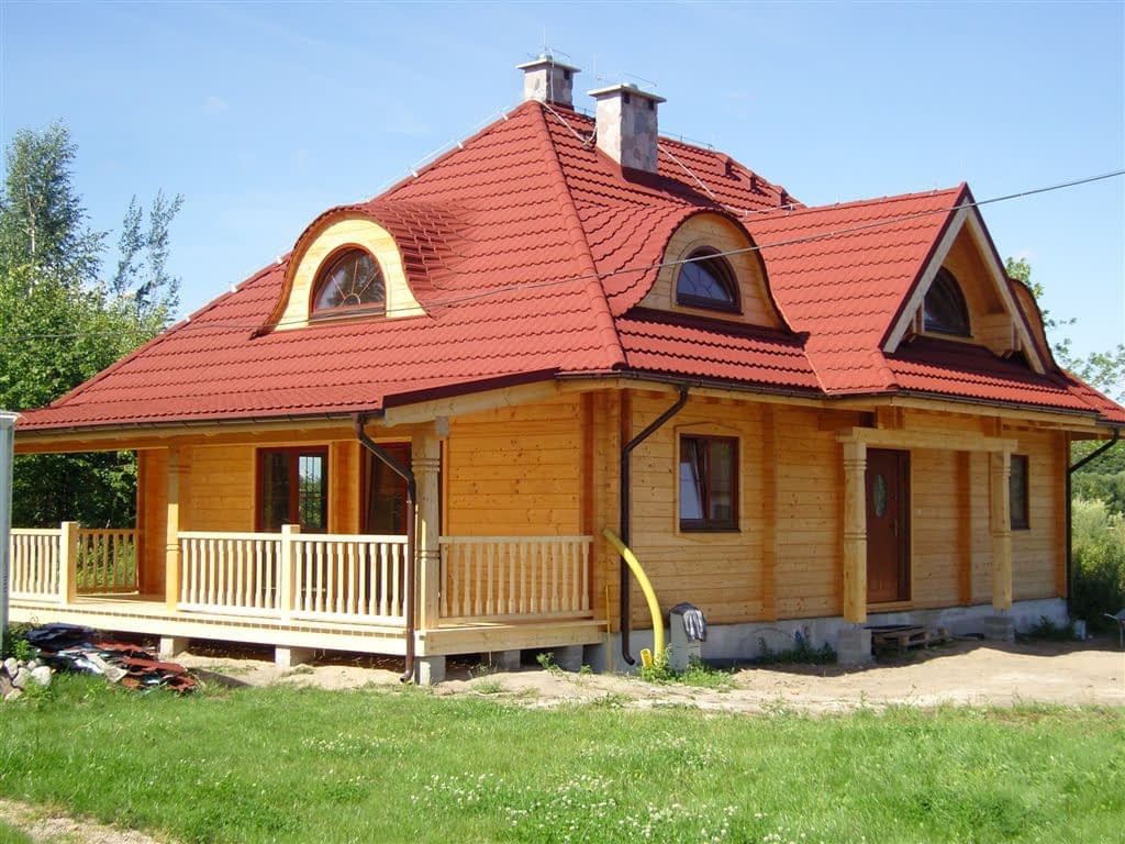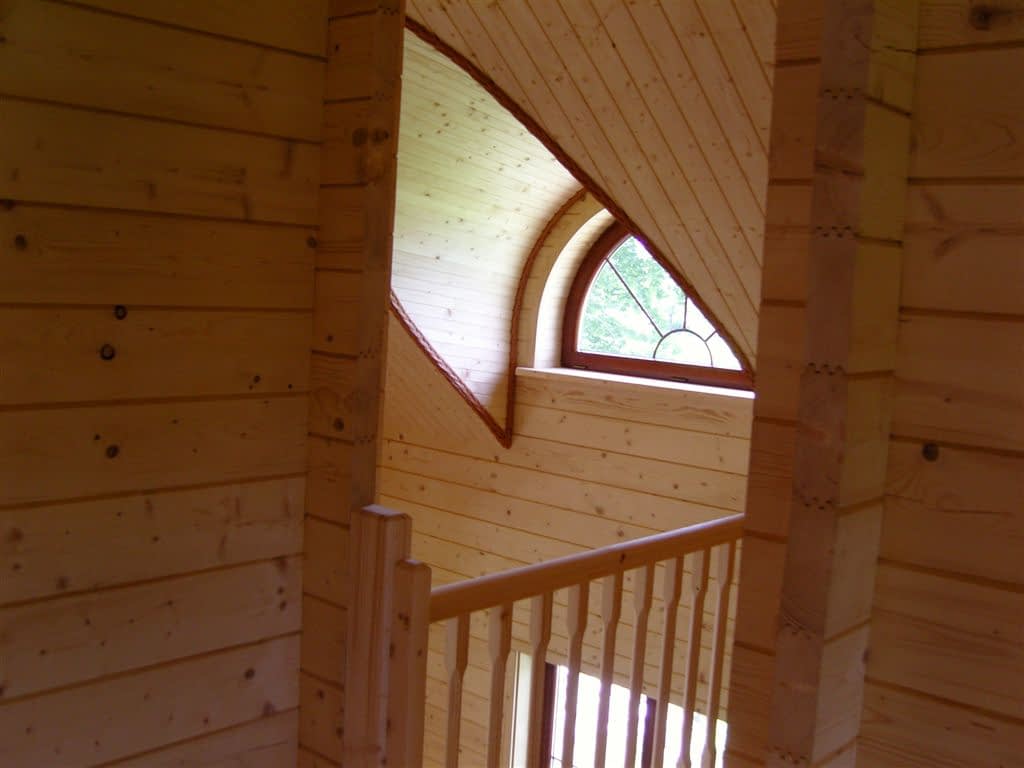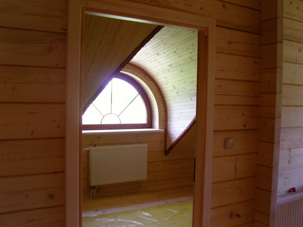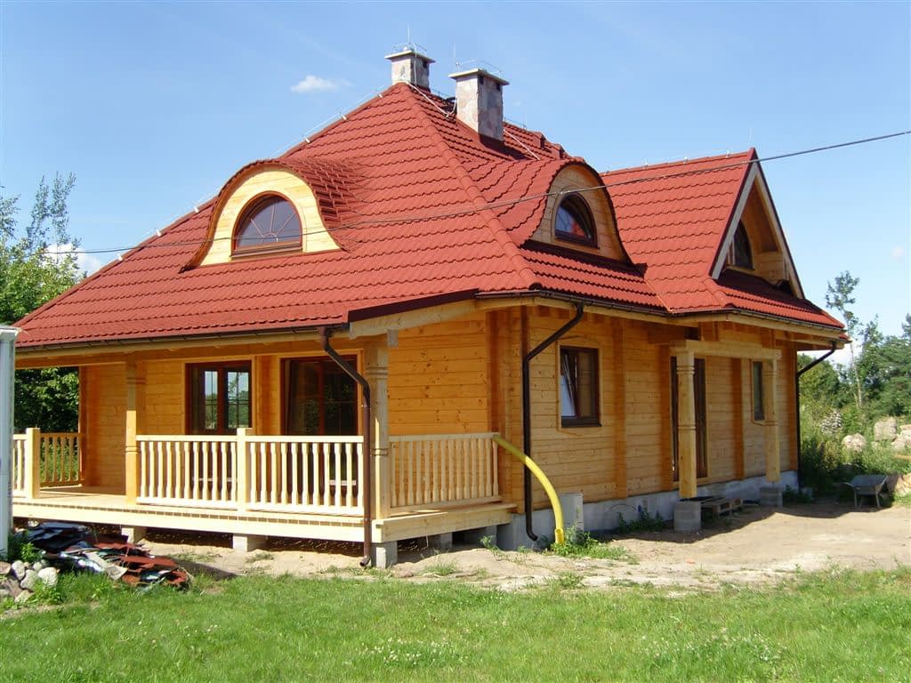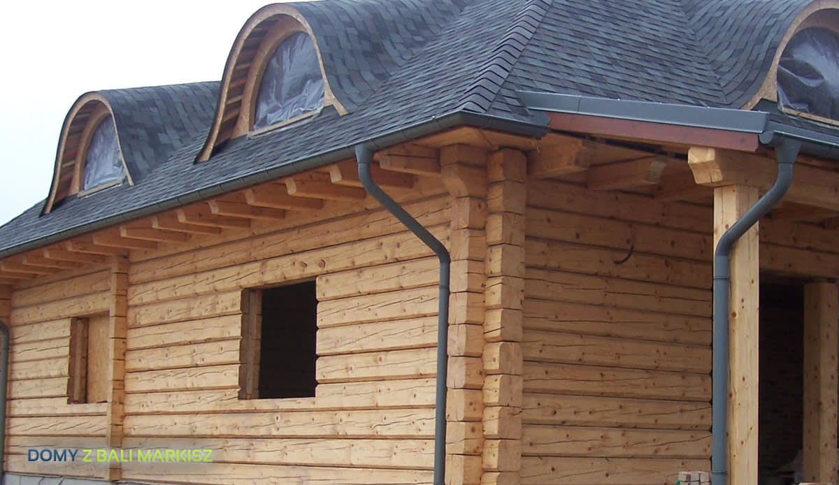 Dom z bali drewnianych. Architektura budynku nawiązuje do tradycji polskiego dworu drewnianego. Duży salon z aneksem kuchennym, kominkiem i wyjściem na zadaszony taras. Pokój, łazienka, wiatrołap, komunikacja, kotłownia. Na poddaszu trzy pokoje, antresola i pustka nad częścią salonu, łazienka i komunikacja.Rzuty