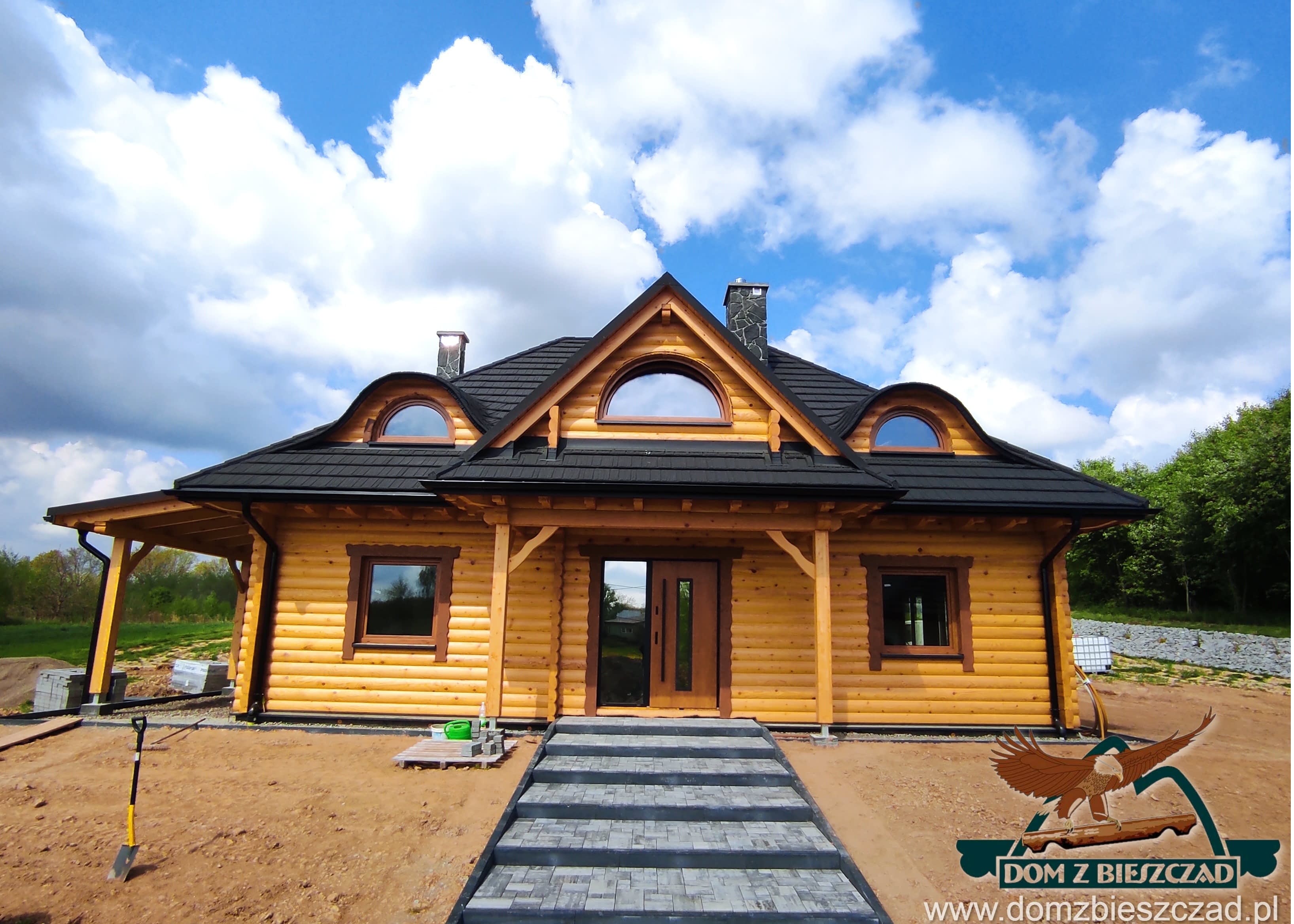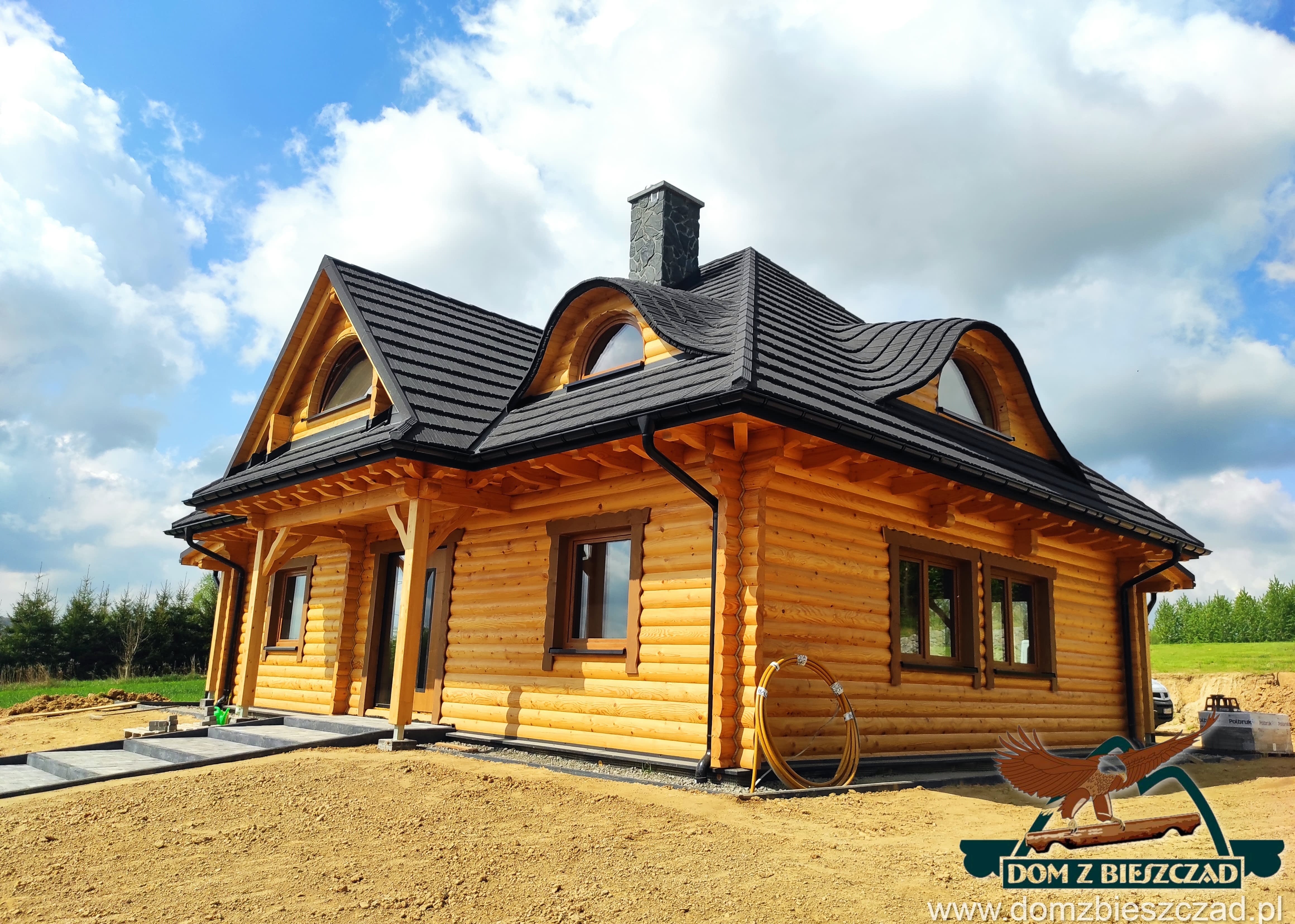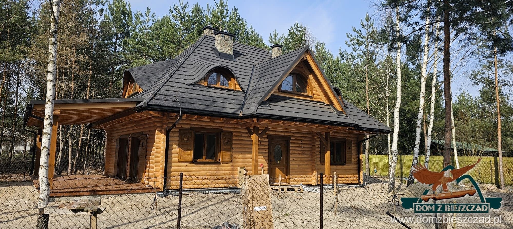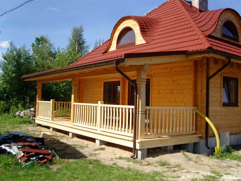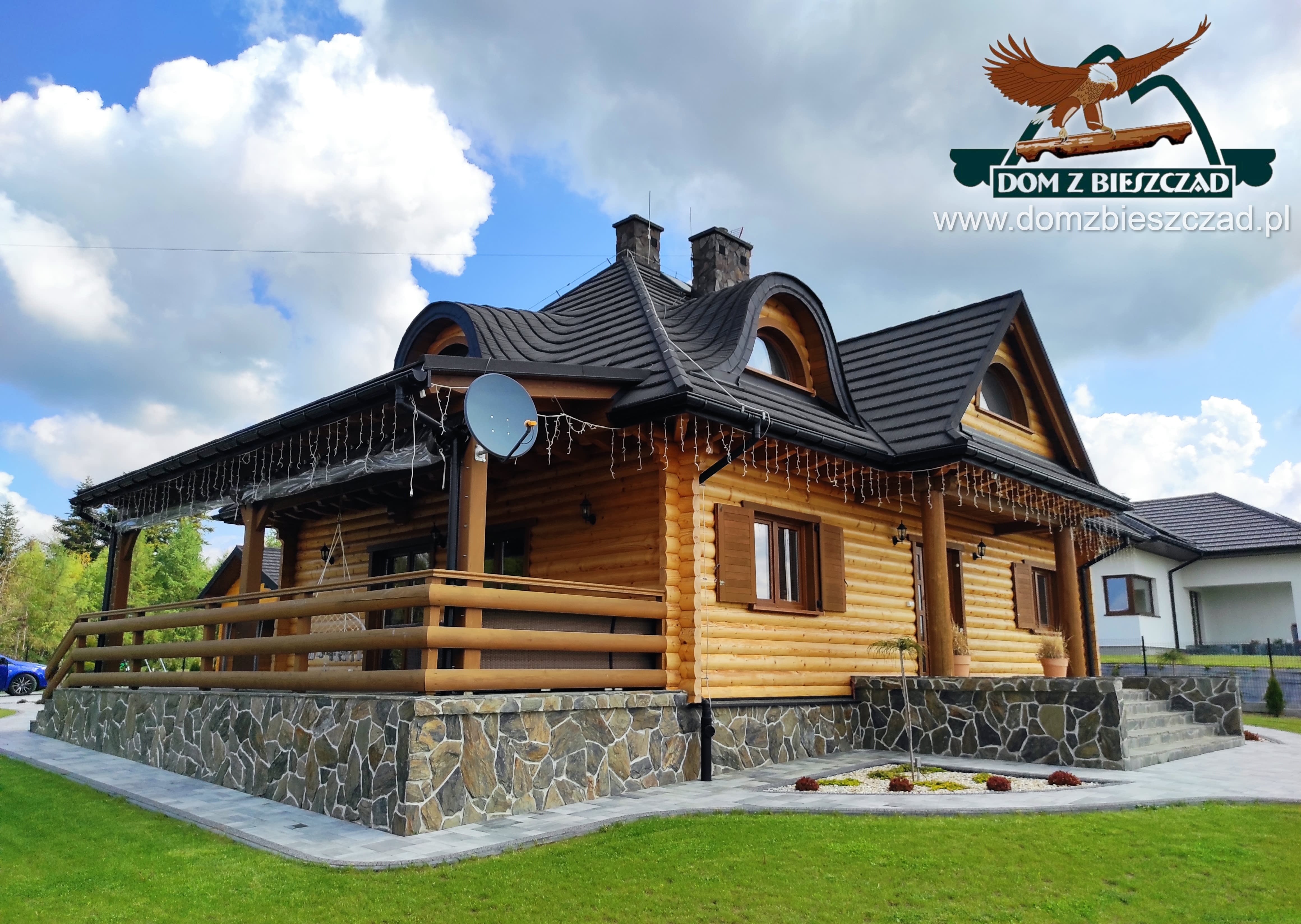 Dom z bali drewnianych. Architektura budynku nawiązuje do tradycji polskiego dworu drewnianego. Duży salon z aneksem kuchennym, kominkiem i wyjściem na zadaszony taras. Pokój, łazienka, wiatrołap, komunikacja, kotłownia. Na poddaszu trzy pokoje, antresola i pustka nad częścią salonu, łazienka i komunikacja.Rzuty