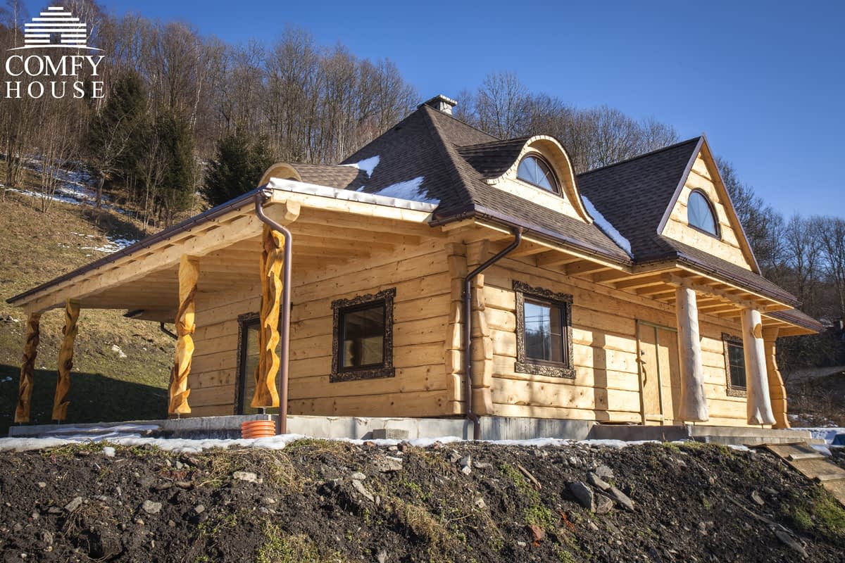 Dom z bali drewnianych o ciekawej architekturze. cztery pokoje, dwie łazienki, spiżarka, pralnia, wc. Duży salon z aneksem kuchennym, kominkiem i wyjściem na taras. Nad częścią salonu antresola. Na parterze funkcje dzienne, na poddaszu funkcje nocne. Zadaszony duży taras i zadaszona wiata garażowa.Rzuty