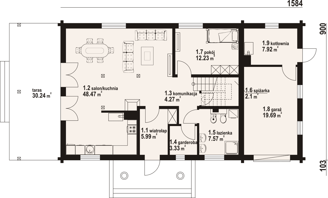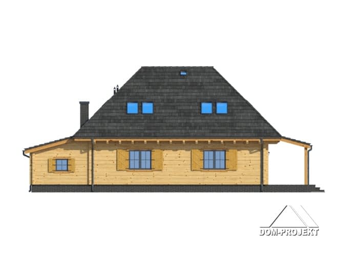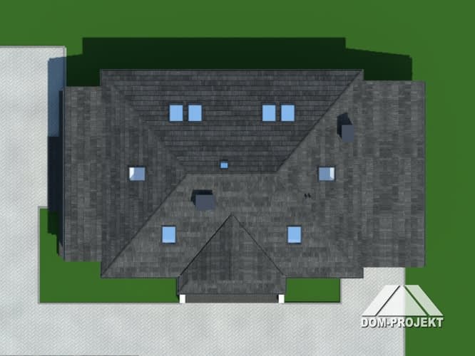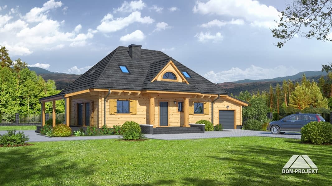Dom z użytkowym poddaszem o bardzo ciekawej architekturze. W strefie dziennej na parterze duży salon z aneksem kuchennym, ponadto dodatkowy pokój, łazienka i garderoba. W strefie nocnej na poddaszu znajdują się trzy sypialnie i łazienka. Dobudowany garaż i usytuowana na jego przedłużeniu kotłownia stanowią uzupełnienie programu funkcjonalnego domu.Rzuty