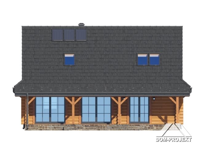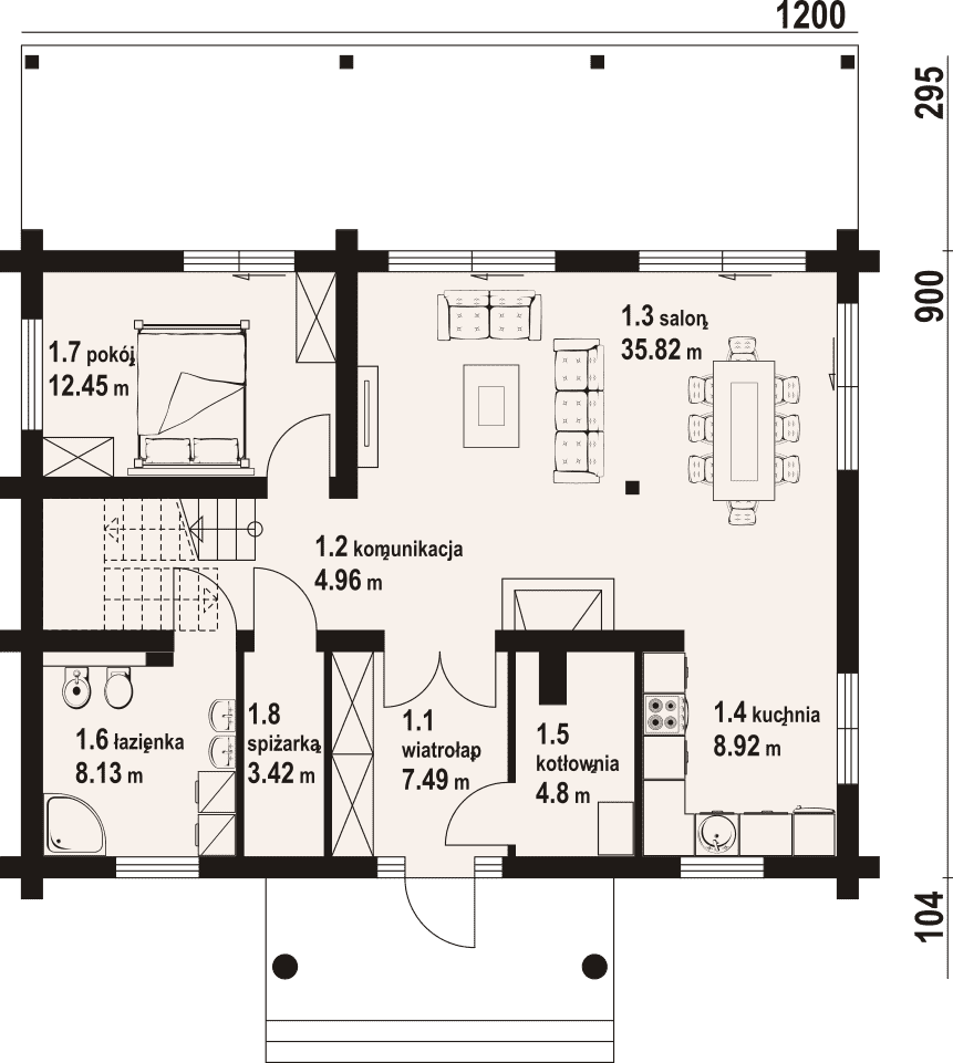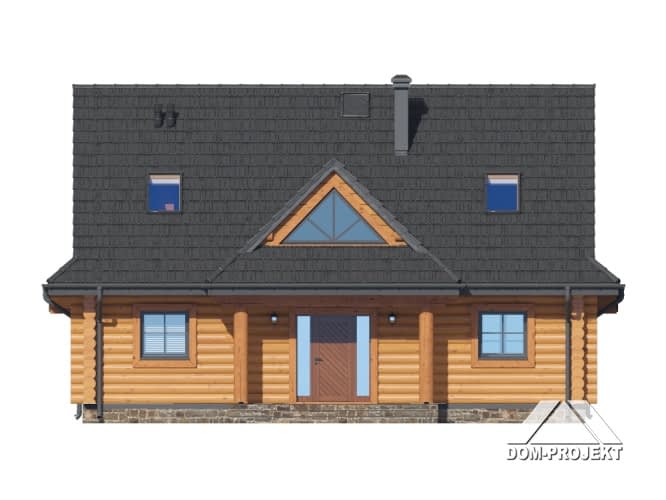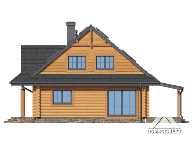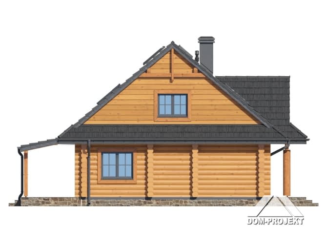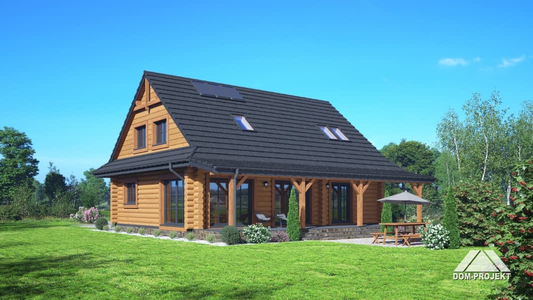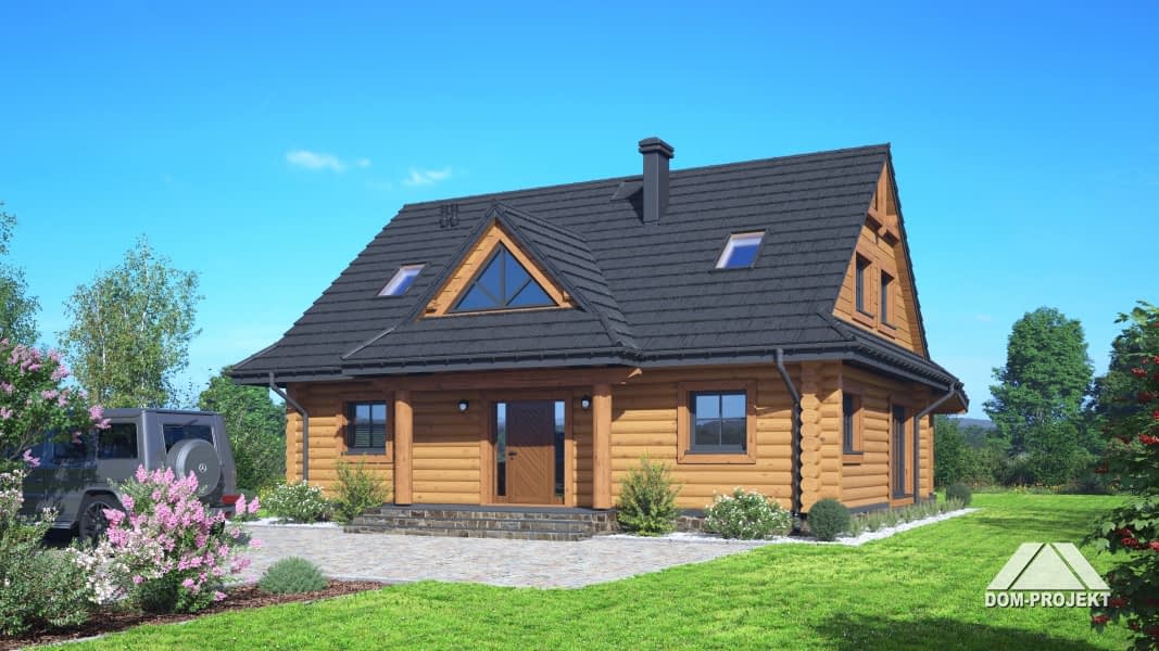 Dom z bali. Na parterze salon z kuchnią, kominkiem oraz wyjściem na duży, zadaszony taras. Komunikacja, pokój, łazienka, spiżarka, wiatrołap, kotłownia. Cztery pokoje, łazienka, komunikacja. Zwarta bryła budynku oraz dach dwuspadowy sprzyjają szybkiej i taniej budowie oraz niskim kosztom eksploatacji.Rzuty