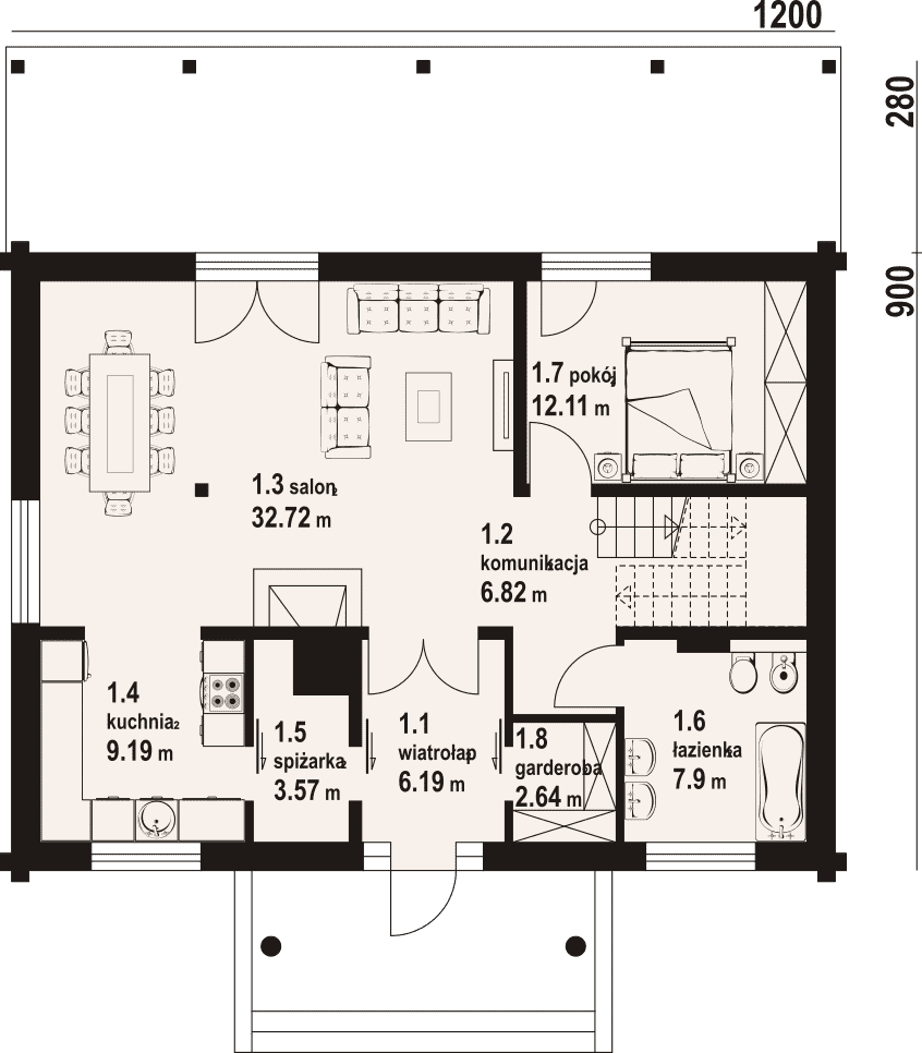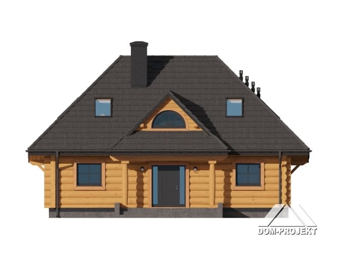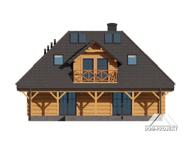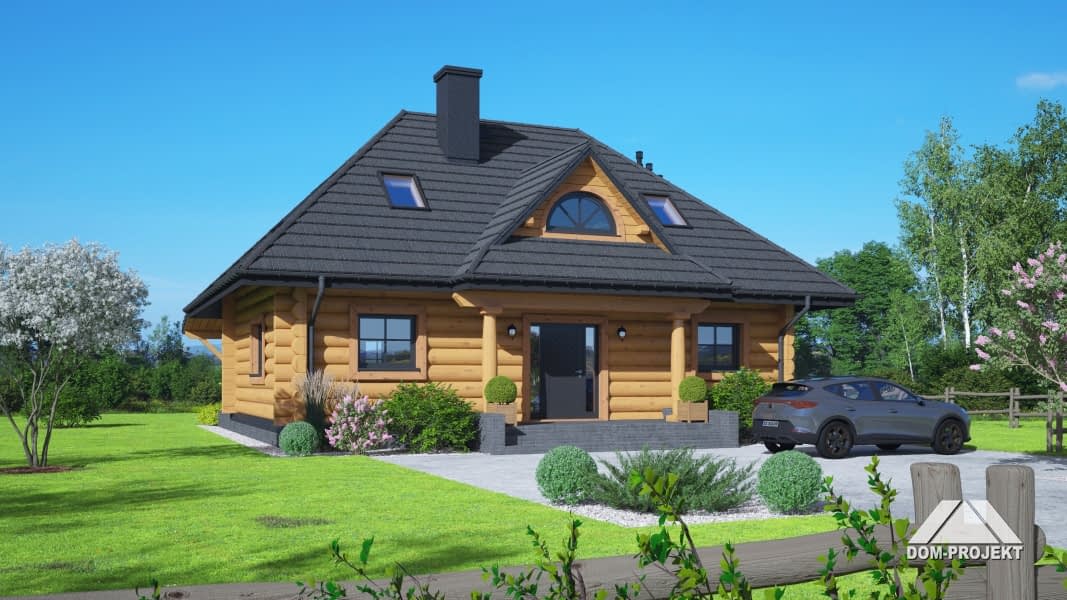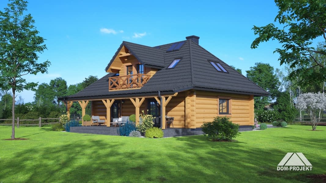 Dom z bali. Podpiwniczony. Na parterze salon z kominkiem, wyjściem na taras oraz przejściem do częściowo otwartej kuchni. Pokój, łazienka, garderoba, wiatrołap, spiżarka, komunikacja. Na poddaszu cztery pokoje, łazienka, komunikacja. W podpiwniczeniu pomieszczenie gospodarcze, piwnica, pralnia, komunikacja, wc, kotłownia.Rzuty
