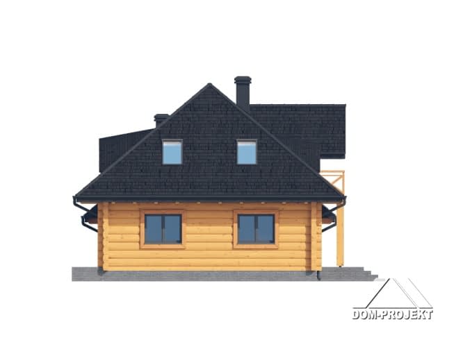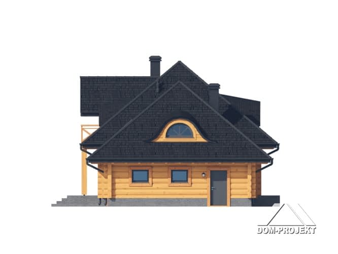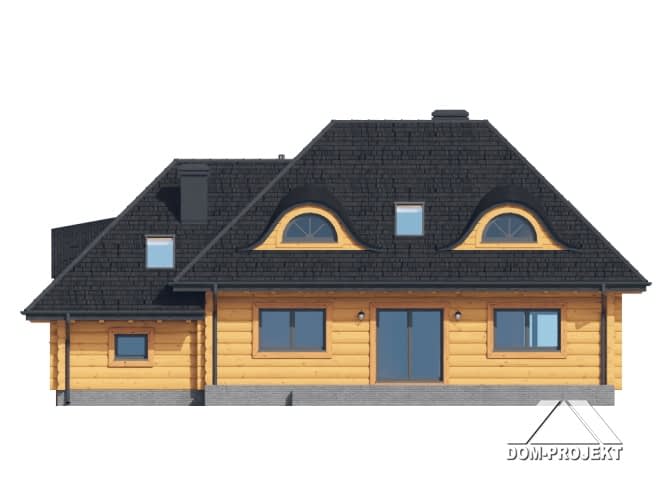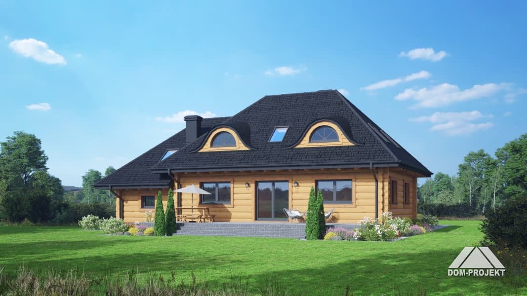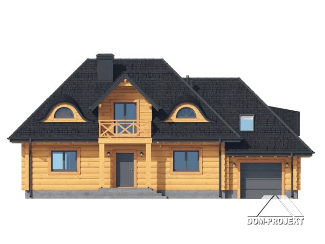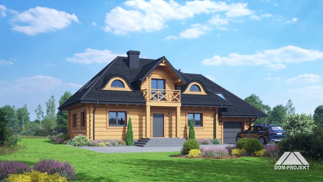 Dom z bali. Na parterze salon z kuchnią, kominkiem oraz wyjściem na taras. Spiżarka, pokój, komunikacja, łazienka, korytarz, wiatrołap, garderoba, pomieszczenie gospodarcze oraz garaż. Na poddaszu pięć pokoi, garderoba, łazienka, komunikacja oraz balkon.Rzuty