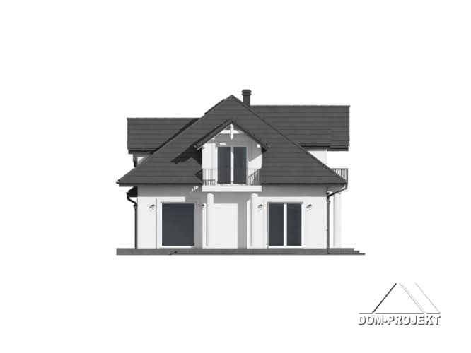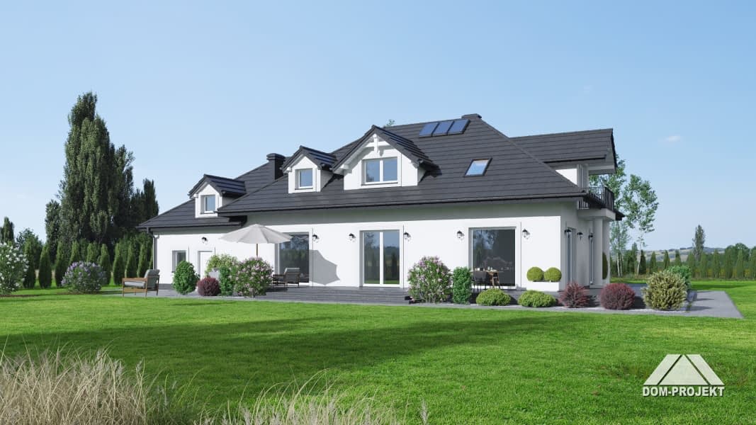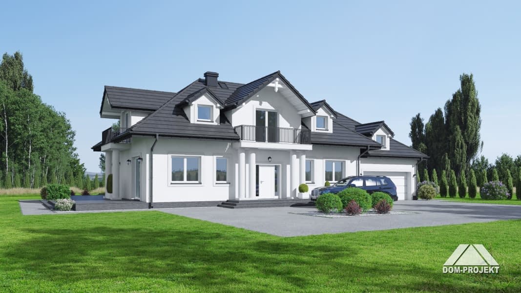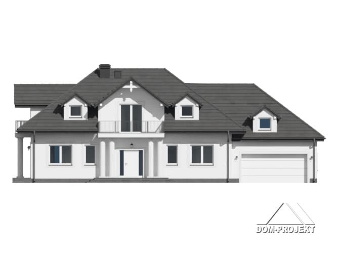 Duży dom z poddaszem użytkowym. Na parterze duży salon z kominkiem oraz wyjściem na taras. Duża kuchnia. Dwa pokoje, łazienka, wiatrołap, komunikacja, garaż na dwa samochody oraz kotłownia. Na poddaszu cztery pokoje, garderoba, łazienka, komunikacja, pralnia oraz dwa balkony.Rzuty