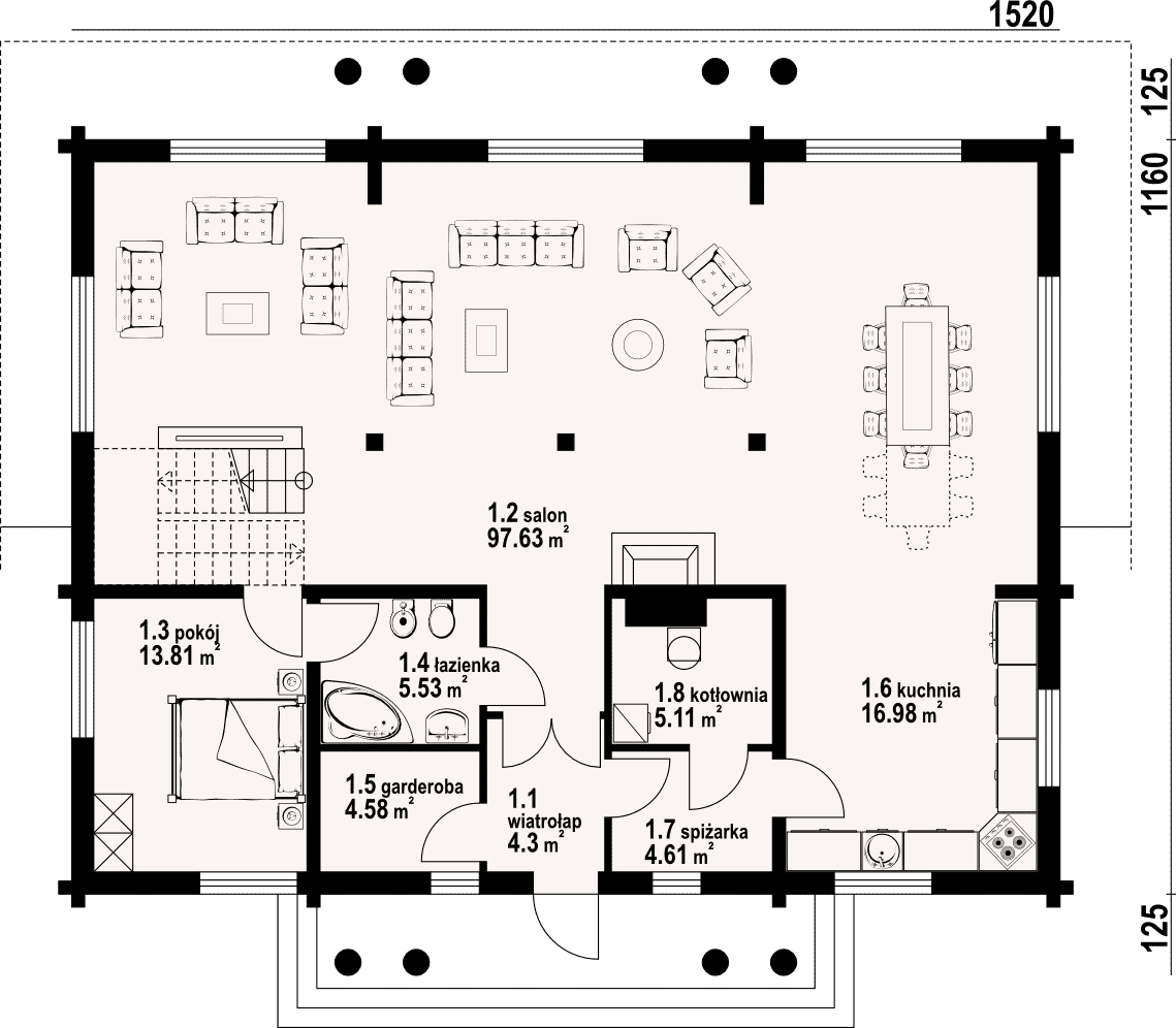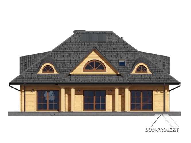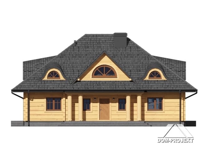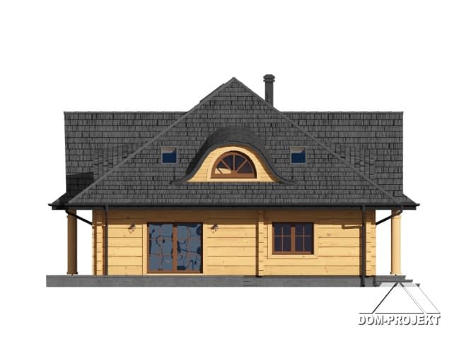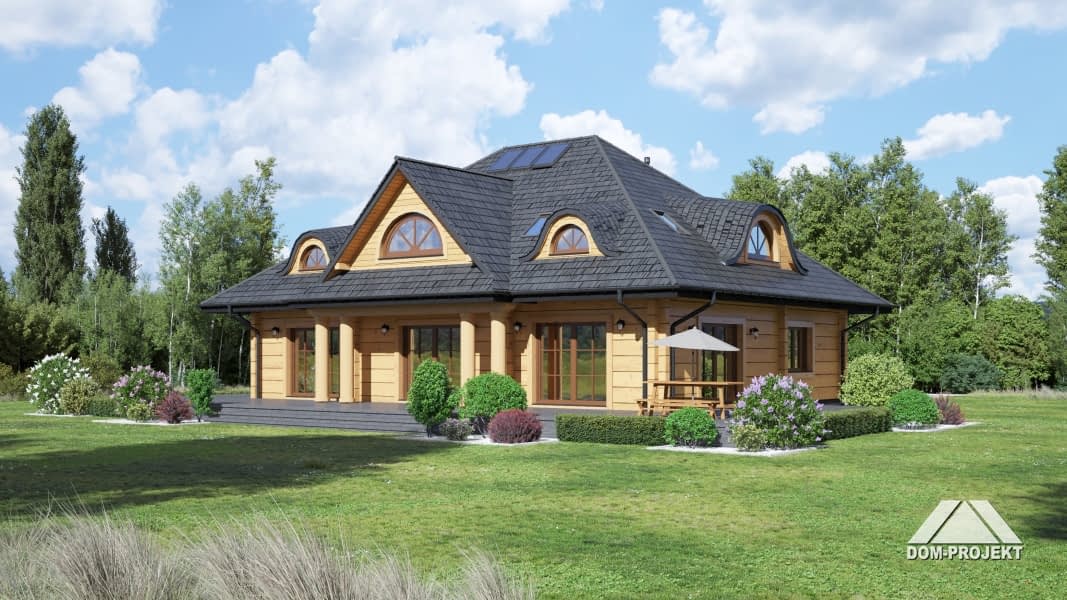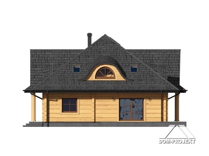 Dom z bali drewnianych. Na parterze bardzo duży salon z kominkiem oraz wyjściami na taras. Duża i otwarta na salon kuchnia. Pokój, łazienka, garderoba, wiatrołap, spiżarka, kotłownia. Na poddaszu trzy pokoje, dwie duże łazienki i komunikacja.Rzuty