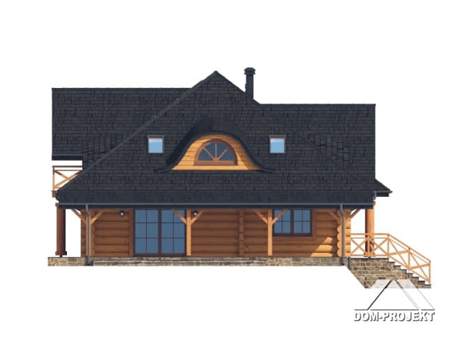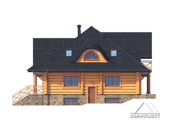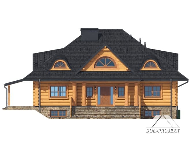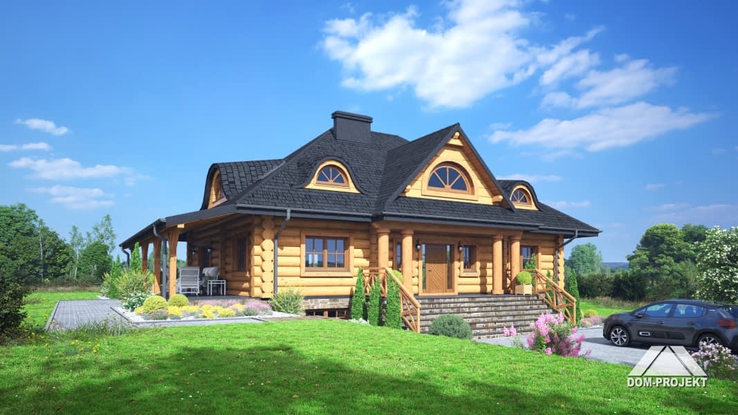 Dom z bali. Podpiwniczony. Na parterze salon z kominkiem, wyjściem na duży, zadaszony taras oraz przejściem do otwartej kuchni. Dwa pokoje, wc, łazienka, komunikacja, wiatrołap, garderoba, spiżarka. Na poddaszu cztery pokoje, komunikacja i łazienka. W podpiwniczeniu pokój hobby, pomieszczenie gospodarcze, kuchnia gospodarcza, komunikacja, kotłownia, pralnia i wc.Rzuty
