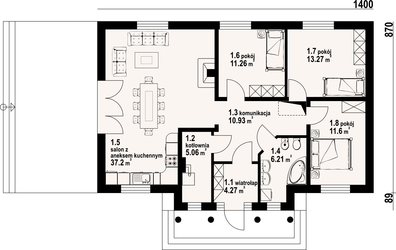 - 1.5 - salon z aneksem kuchennym37.2 m²