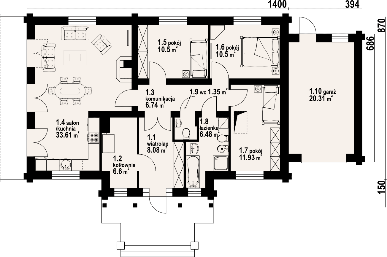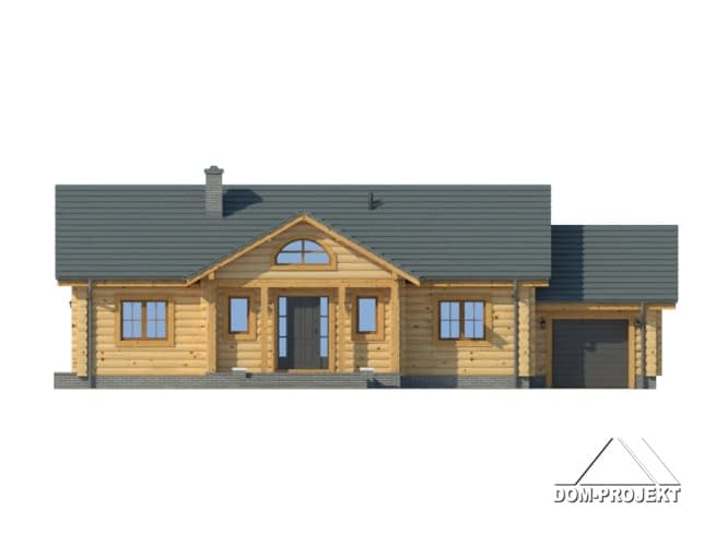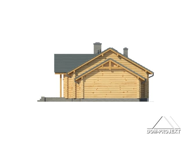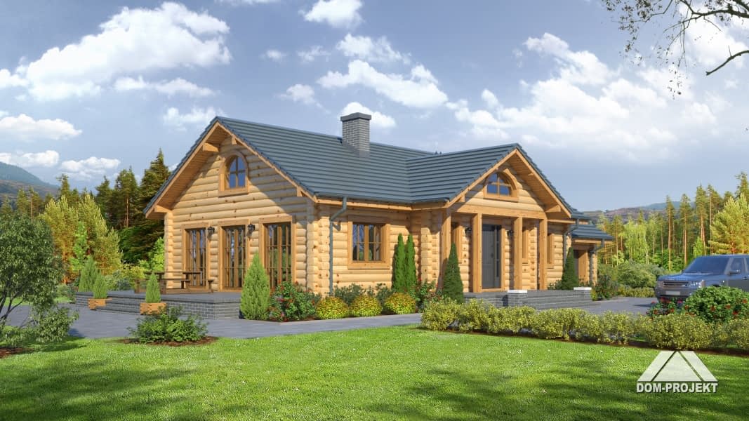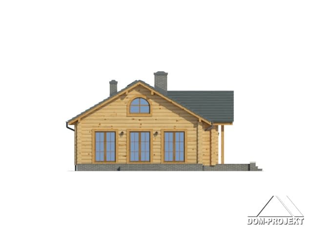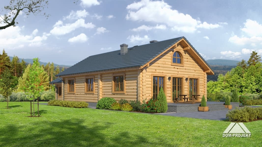 Dom z bali drewnianych. Parterowy. Duży salon z aneksem kuchennym, kominkiem i wyjściami na taras. Trzy pokoje, łazienka, wc, komunikacja, wiatrołap, kotłownia i garaż. Prosta bryła i dwuspadowy dach sprzyjają szybkiej budowie i niskim kosztom eksploatacji.Rzuty