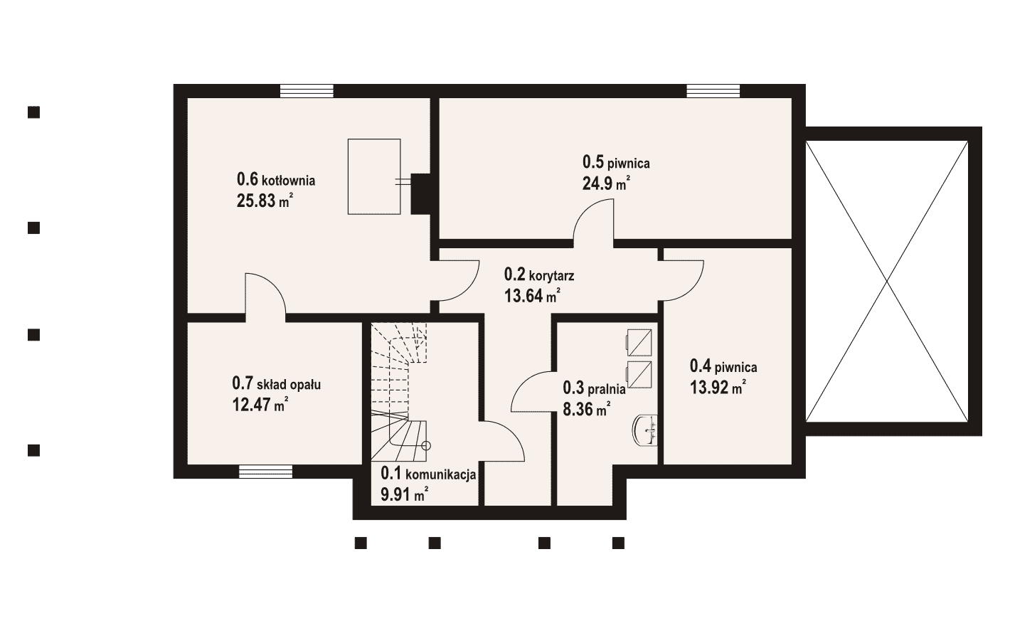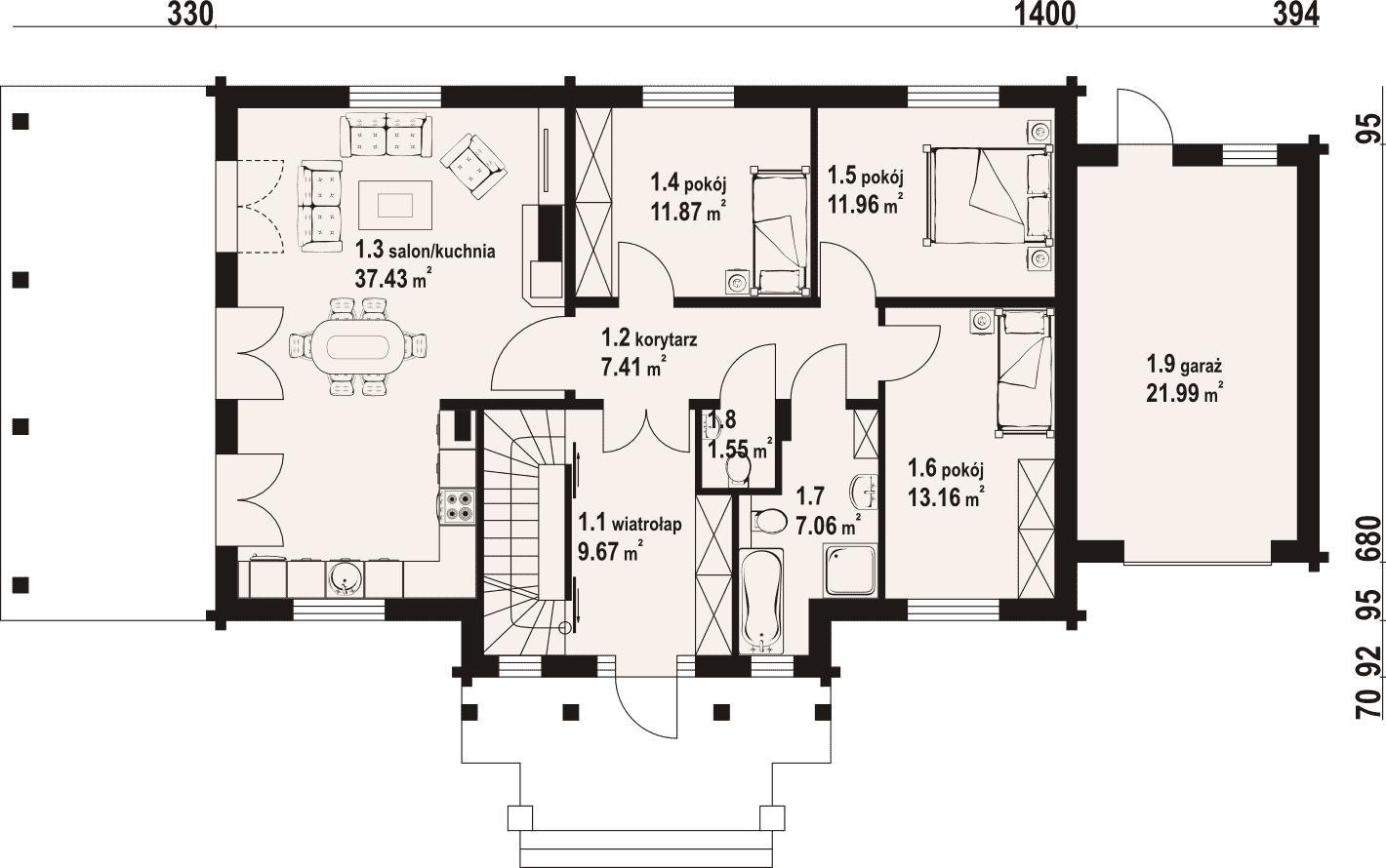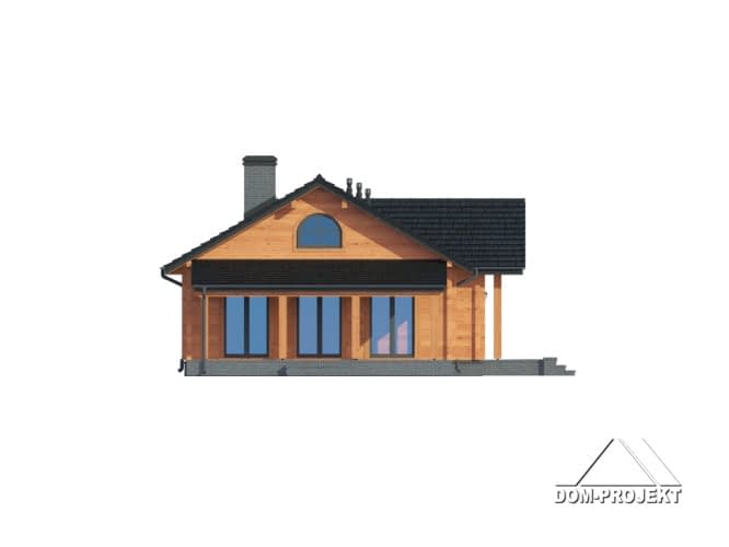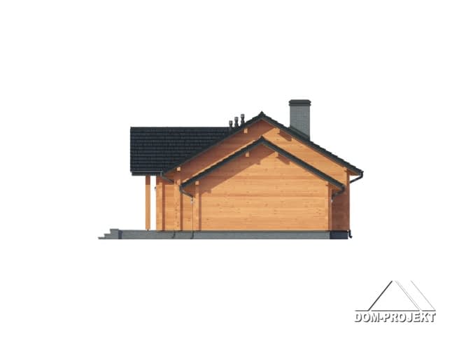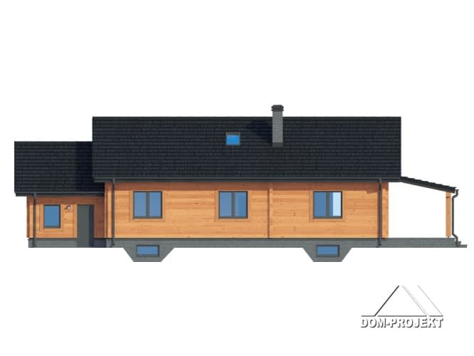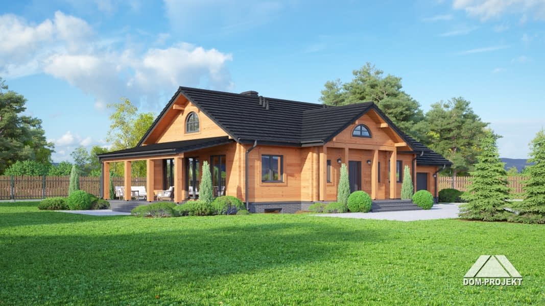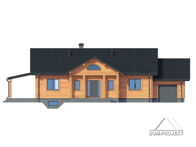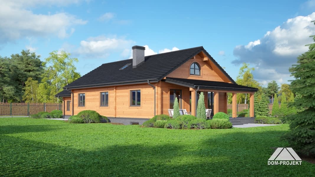 Dom z bali drewnianych. Duży salon z aneksem kuchennym, kominkiem i wyjściem na zadaszony taras. Trzy pokoje, łazienka, wc, korytarz, wiatrołap ze schodami na poddasze i garaż. Poddasze nieużytkowe. W piwnicach: pralnia, kotłownia, skład opału, piwnice, korytarz i komunikacja. Zwarta bryła budynku i dach dwuspadowy sprzyjają szybkiej i taniej budowie i niskim kosztom eksploatacji.Rzuty