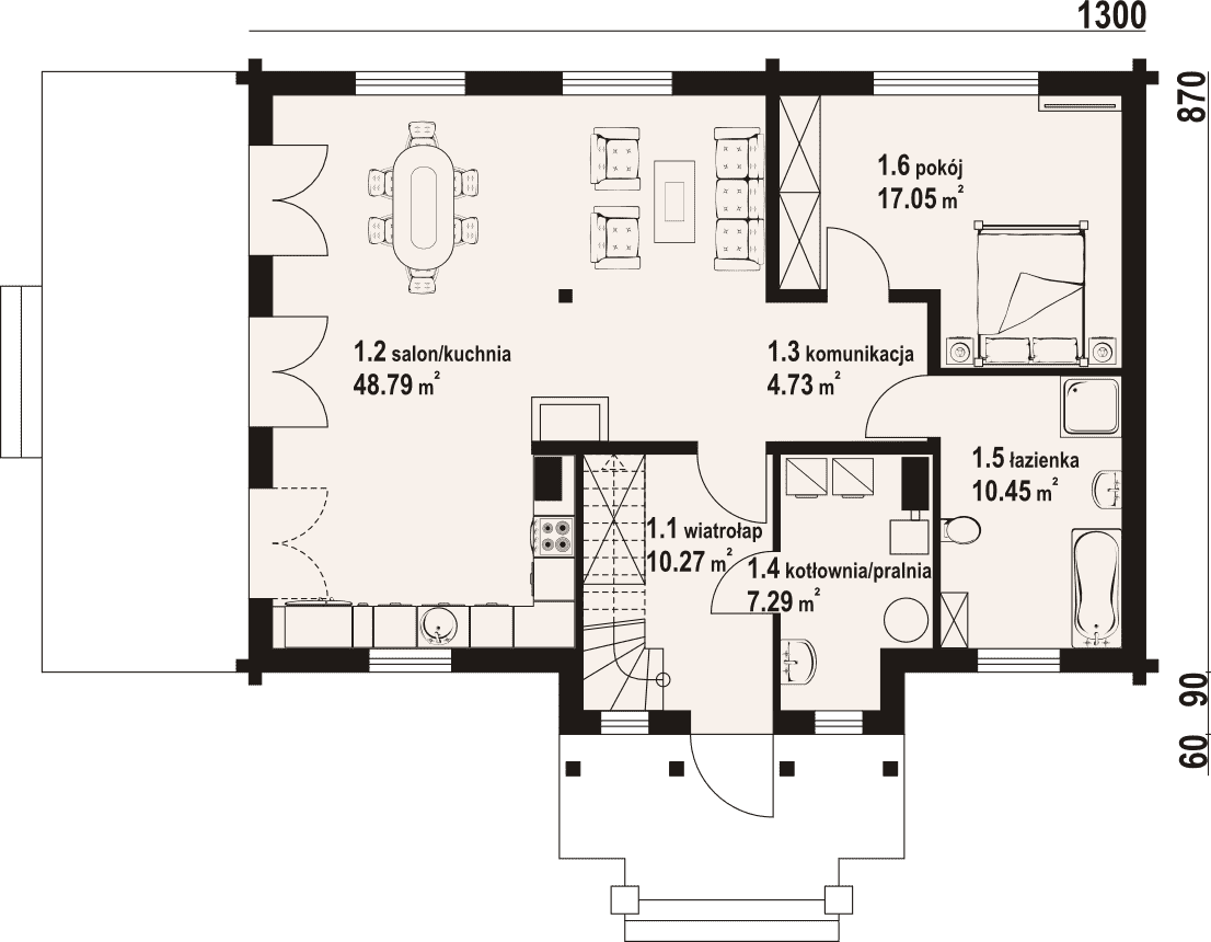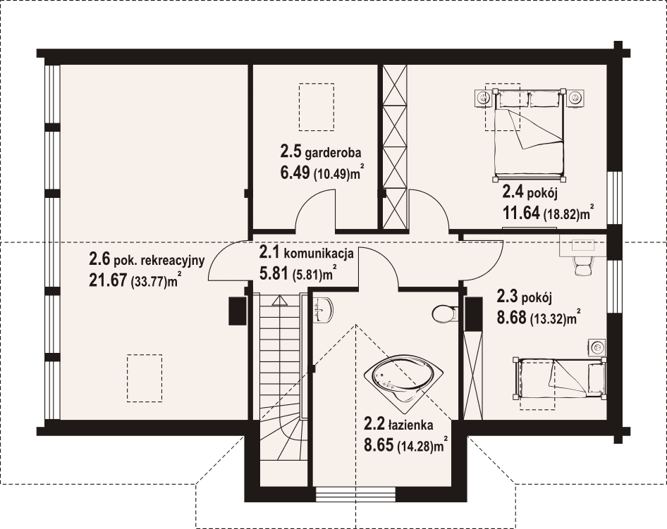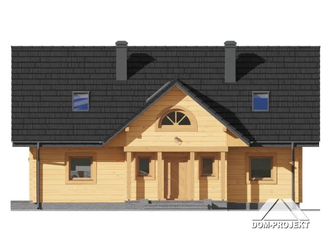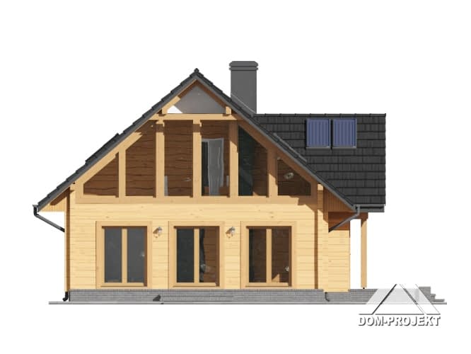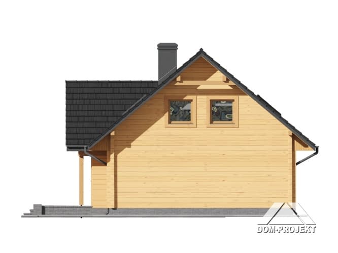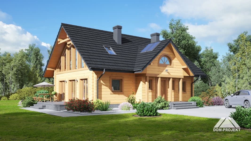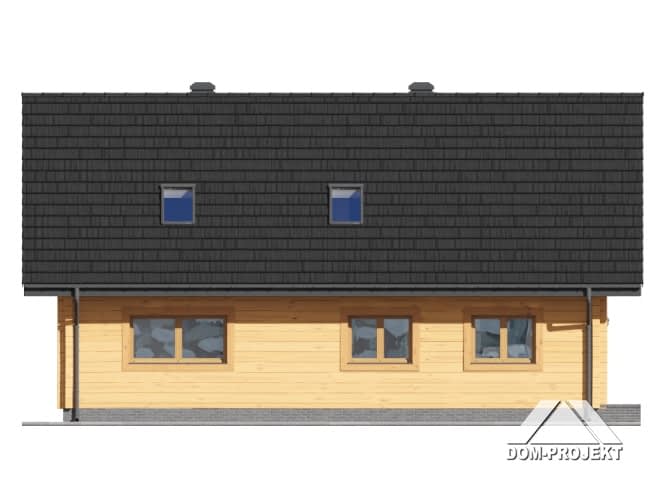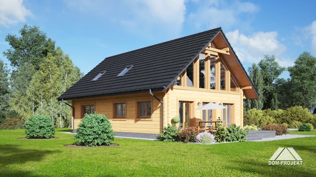 Dom z bali drewnianych. Duży salon z aneksem kuchennym, kominkiem i wyjściem na taras. Pokój, łazienka, wiatrołap, komunikacja i kotłownia/pralnia. Na poddaszu trzy pokoje, łazienka, garderoba i komunikacja.Zwarta bryła budynku i dach dwuspadowy sprzyjają szybkiej i taniej budowie i niskim kosztom eksploatacji.Rzuty