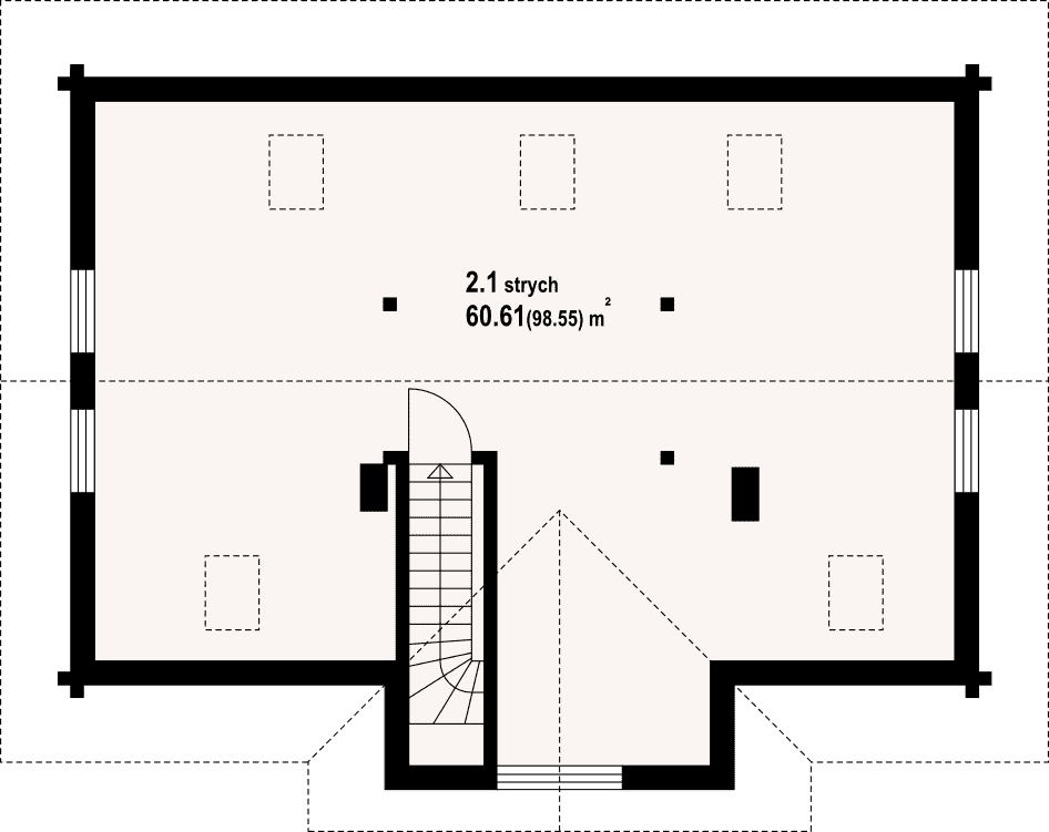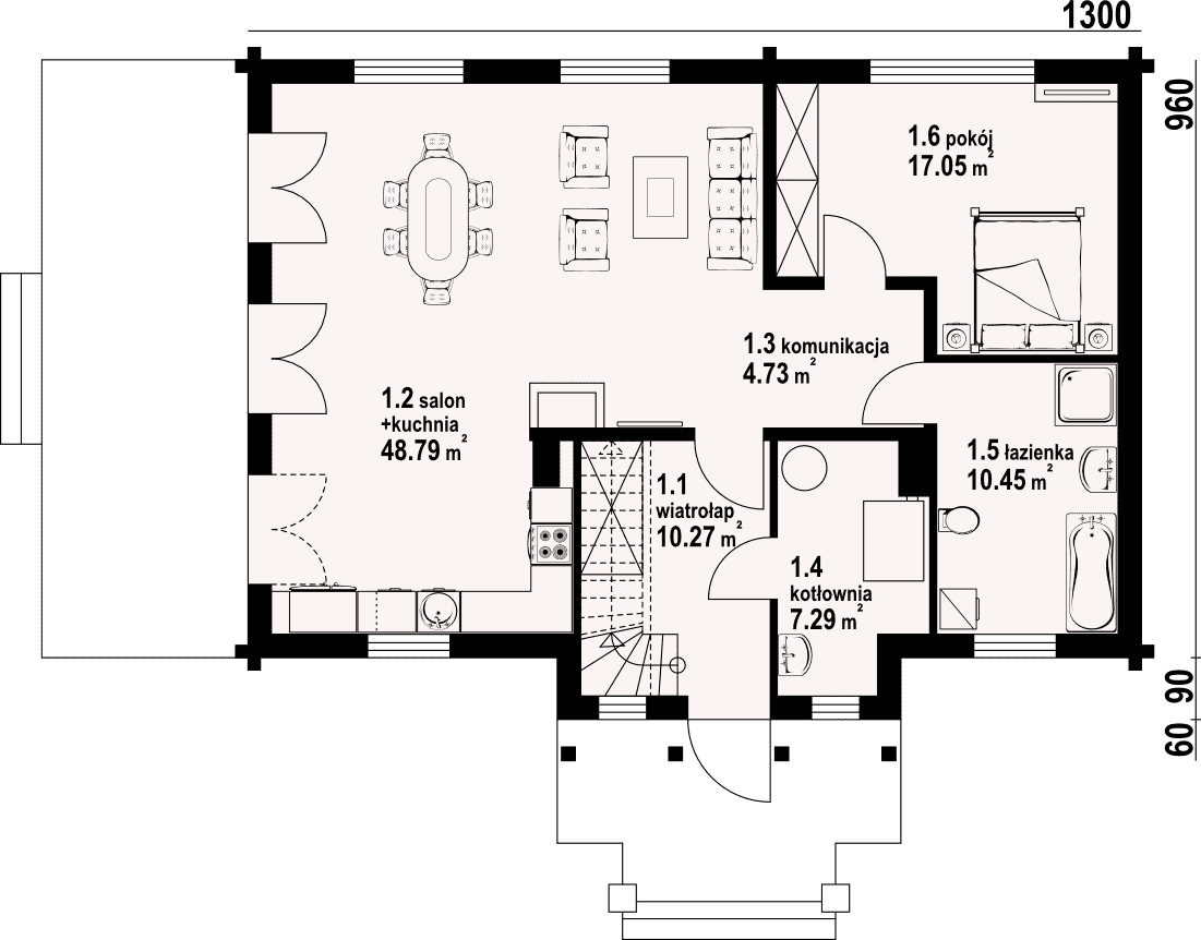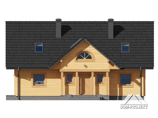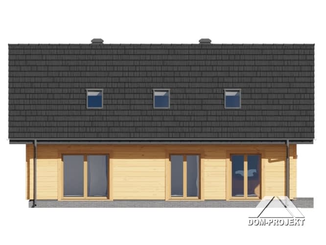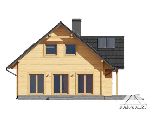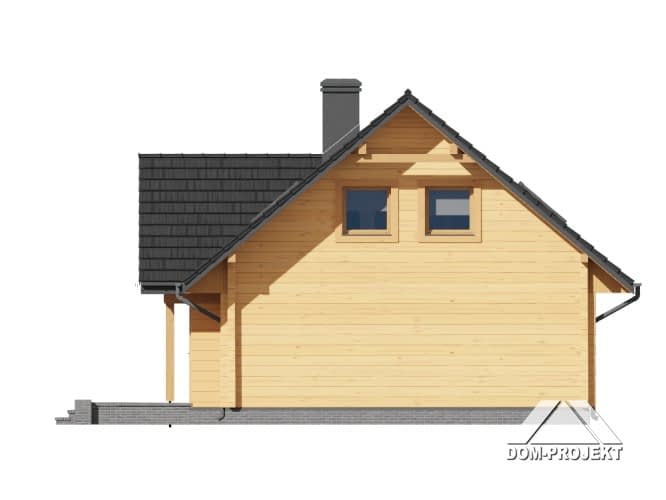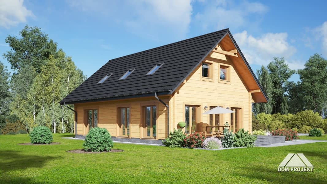 Dom z bali. Parterowy. Duży salon z kuchnią, kominkiem oraz wyjściami na taras. Pokój, łazienka, kotłownia, komunikacja, wiatrołap. Z wiatrołapu schody prowadzące na poddasze. Na poddaszu strych. Zwarta bryła budynku oraz dach dwuspadowy sprzyjają szybkiej i taniej budowie i niskim kosztom eksploatacji.Rzuty