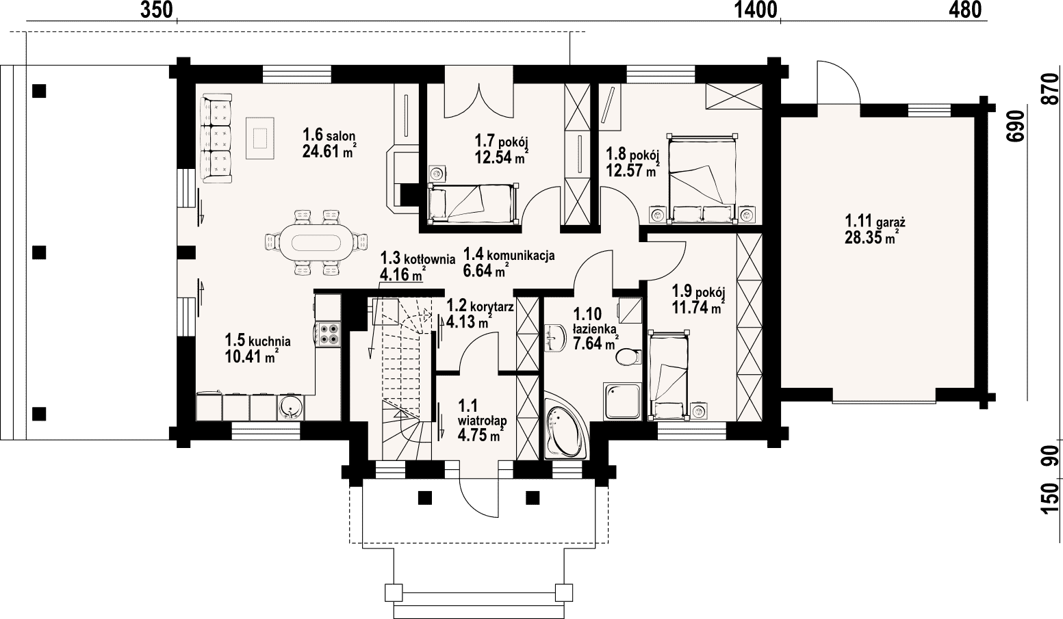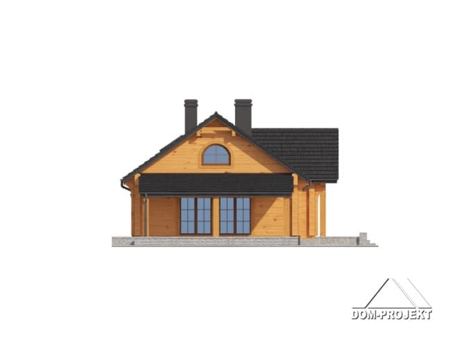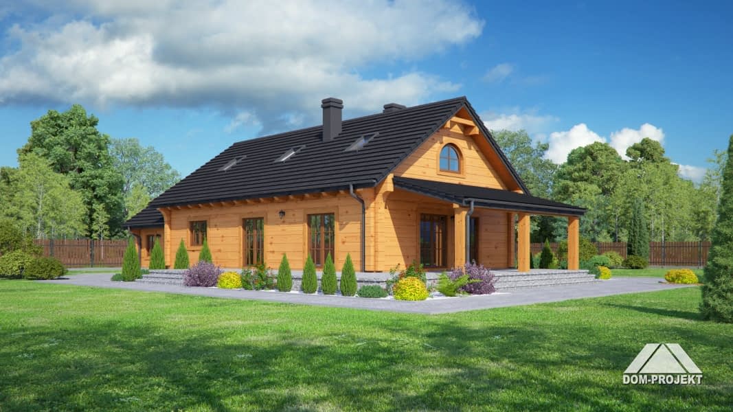 Dom z bali. Parterowy. Duży salon z aneksem kuchennym, kominkiem i wyjściem na zadaszony taras. Trzy pokoje, łazienka, wiatrołap, komunikacja, korytarz, kotłownia i garaż. Wyjście schodami na poddasze. Na poddaszu antresola,pustka nad salonem i strych.Rzuty