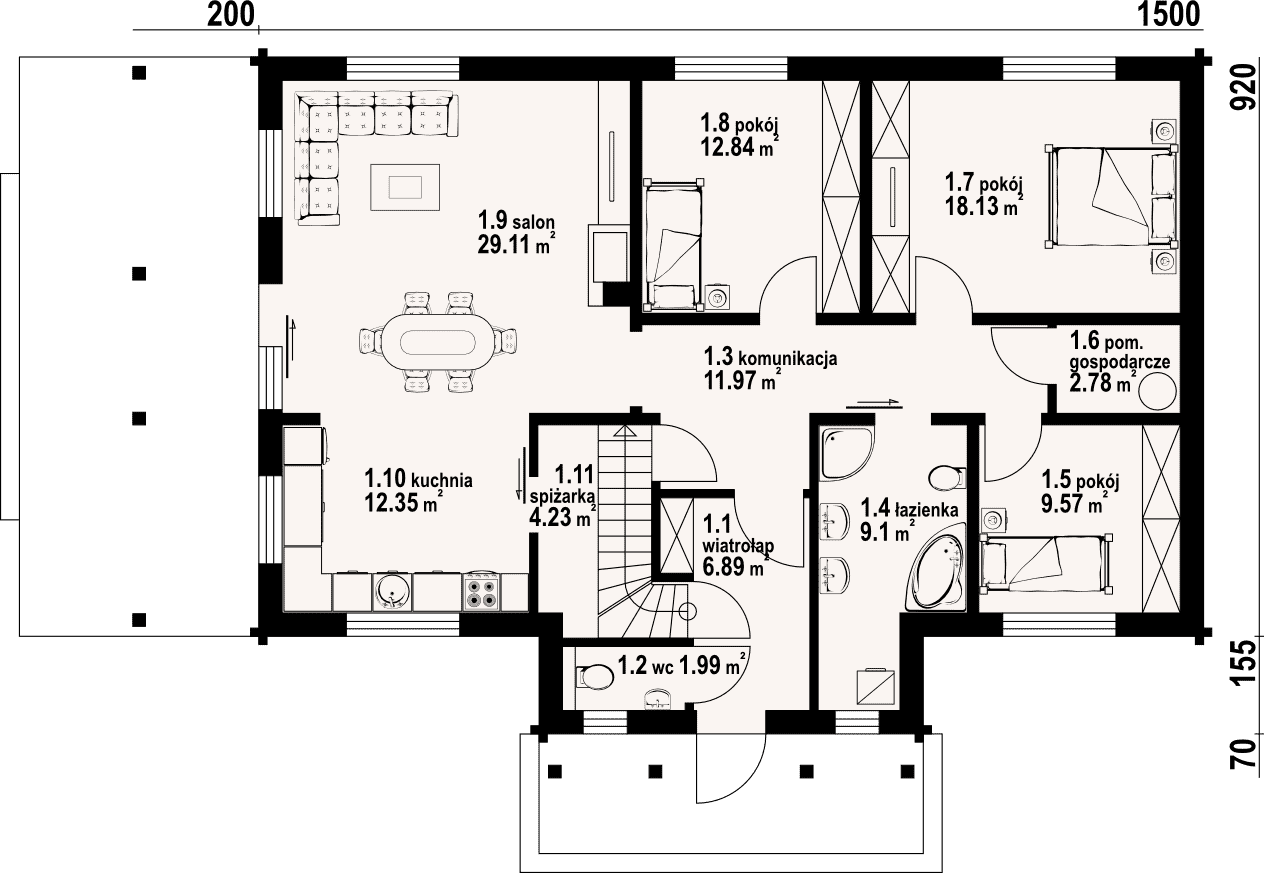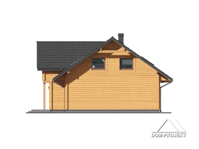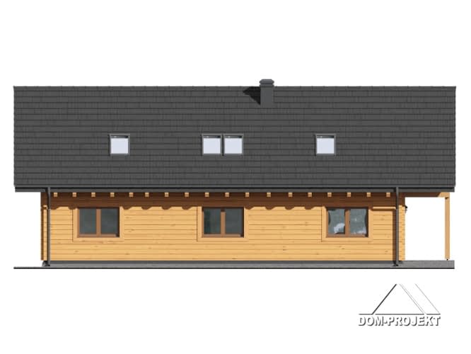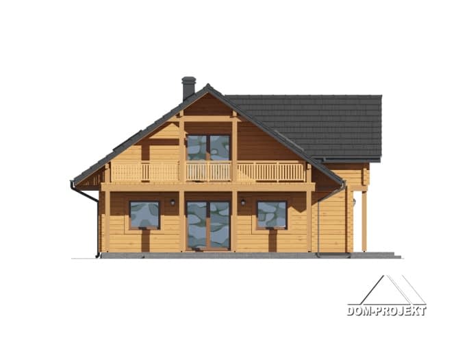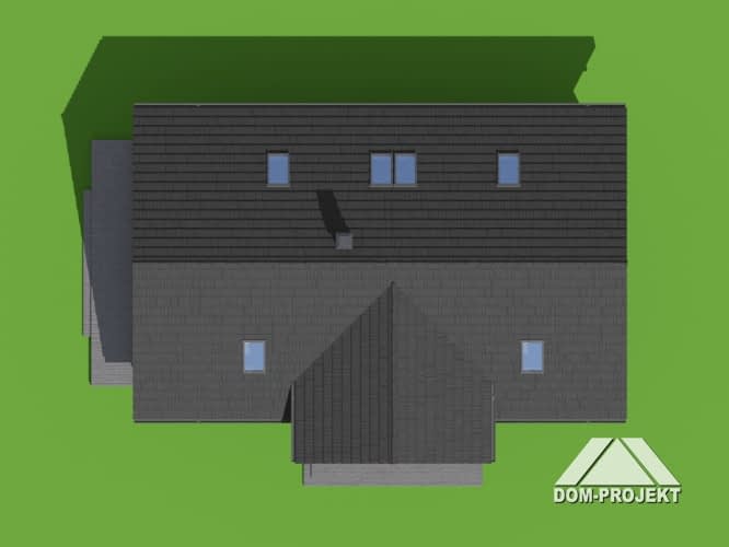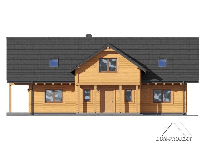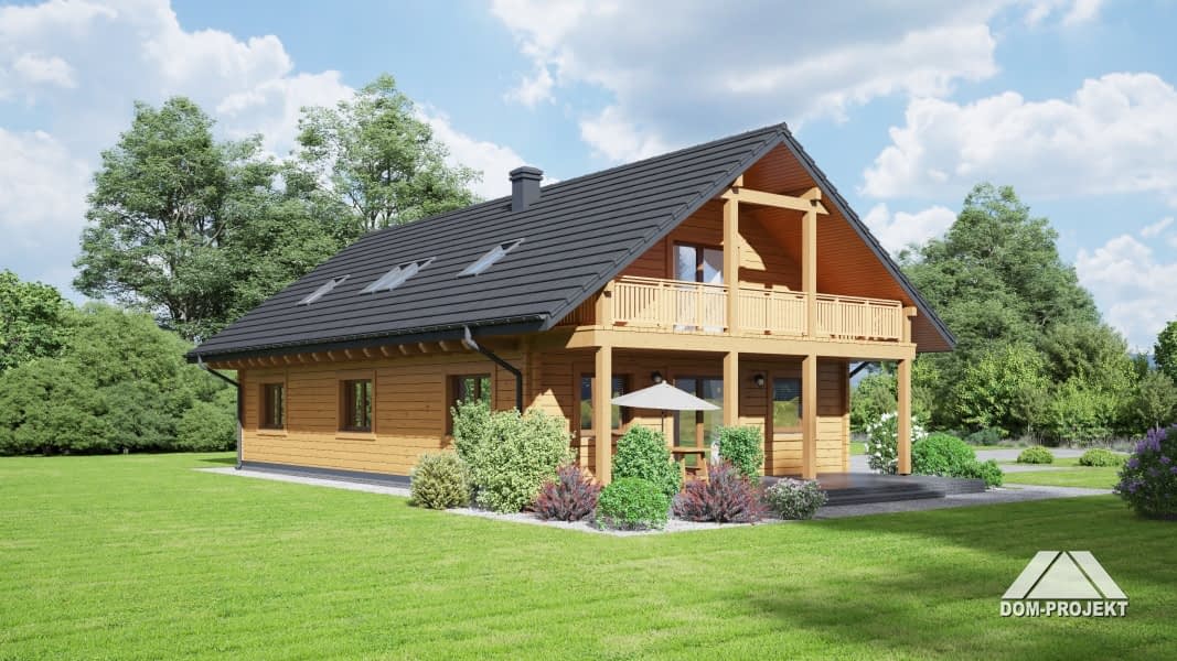 Dom w konstrukcji szkieletu drewnianego. Na parterze duży salon z kominkiem oraz wyjściem na częściowo zadaszony taras. Duża kuchnia otwarta na salon. Trzy pokoje, łazienka, wc, spiżarka, wiatrołap i pomieszczenie gospodarcze. Na poddaszu cztery pokoje, dwie garderoby, duża łazienka, wc, komunikacja i duży balkon przy największym pokoju. Zwarta bryła budynku i dach dwuspadowy sprzyjają szybkiej i taniej budowie i niskim kosztom eksploatacji.Rzuty