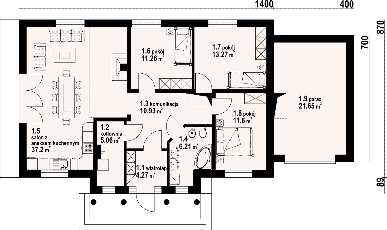 - 1.5 - salon z aneksem kuchennym37.2 m²