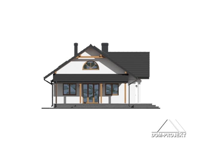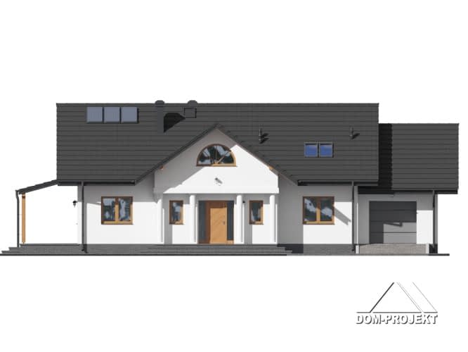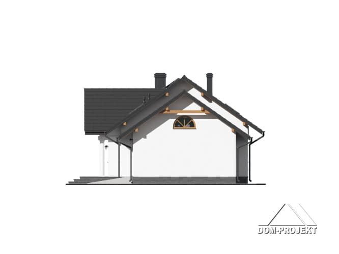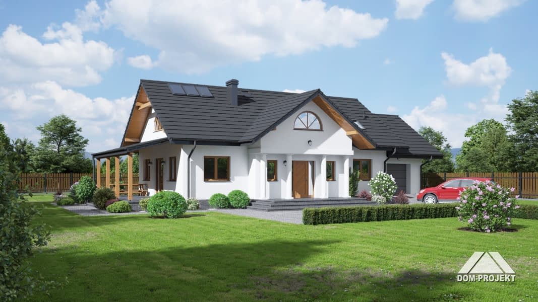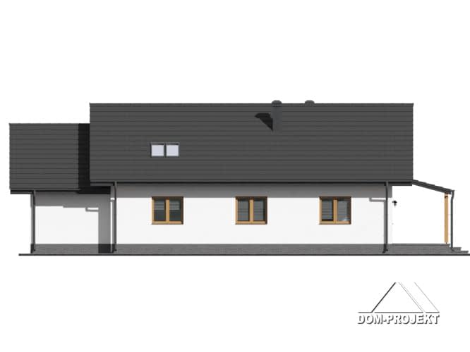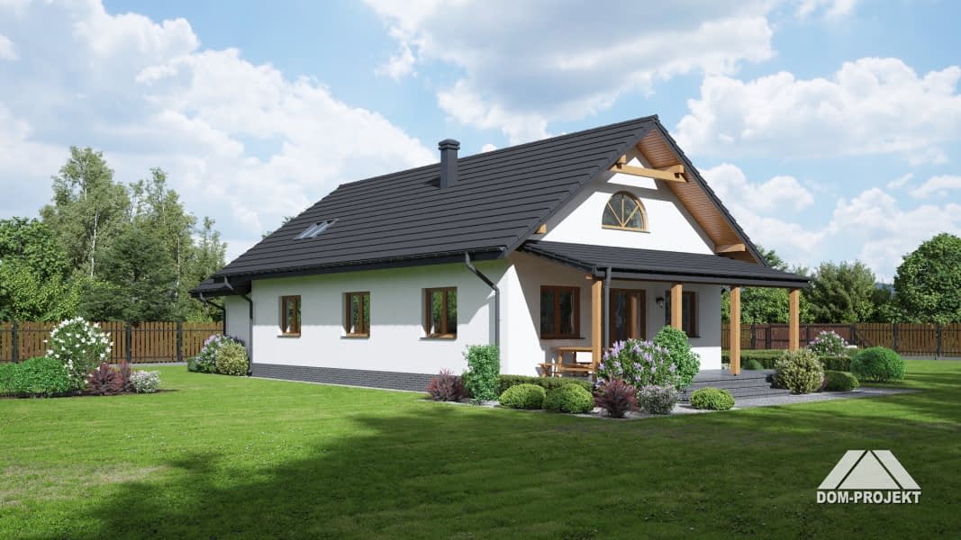 Dom parterowy. Duży salon z aneksem kuchennym, kominkiem i wyjściami na zadaszony taras. Trzy pokoje, łazienka, wc, kotłownia, komunikacja, wiatrołap i garaż. Nad salonem otwarta przestrzeń. Wyjście na poddasze schodami. Na poddaszu strych.Rzuty
