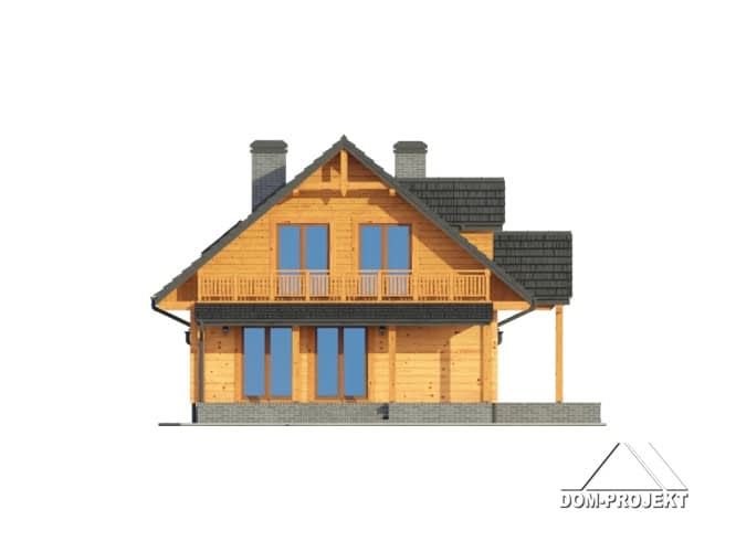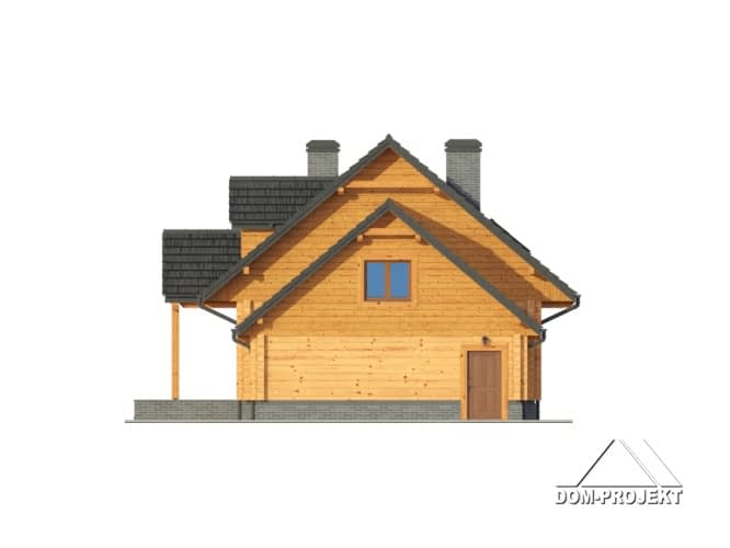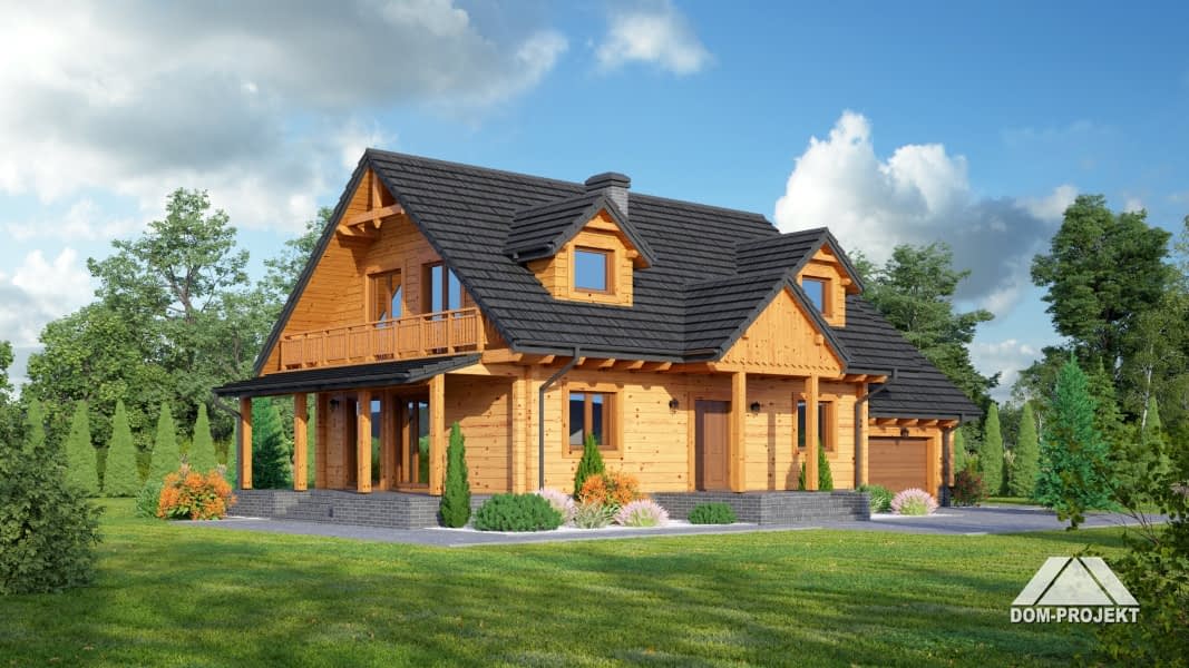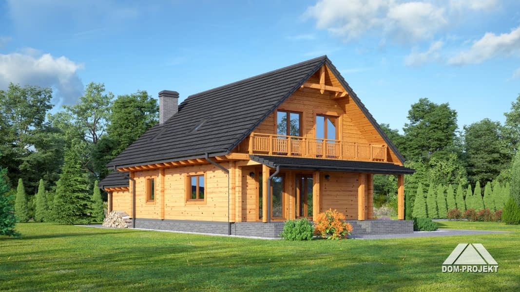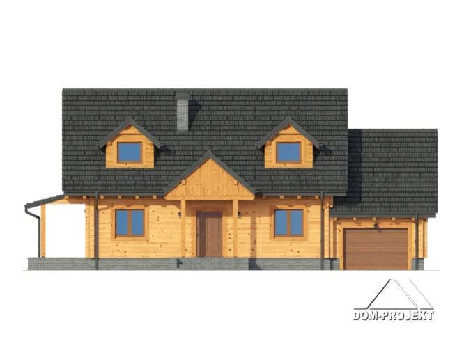 Dom z bali drewnianych. Duży salon z aneksem kuchennym, kominkiem i wyjściem na zadaszony taras. Pokój, łazienka, wiatrołap, komunikacja i pomieszczenie gospodarcze. Garaż i kotłownia. Na poddaszu trzy pokoje, łazienka, garderoba komunikacja i strych. Zwarte bryła budynki i dach dwuspadowy sprzyjają szybkiej i taniej budowie i niskim kosztom eksploatacji.Rzuty