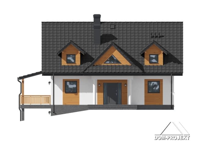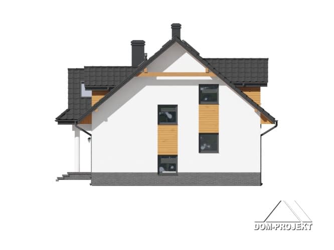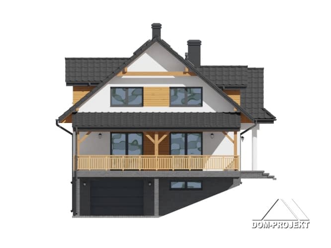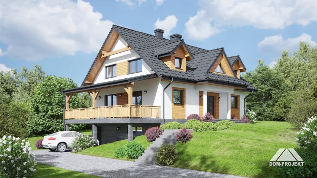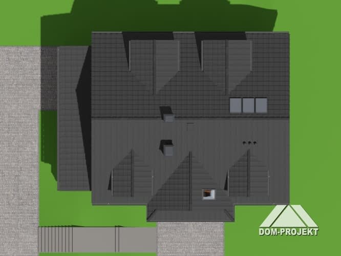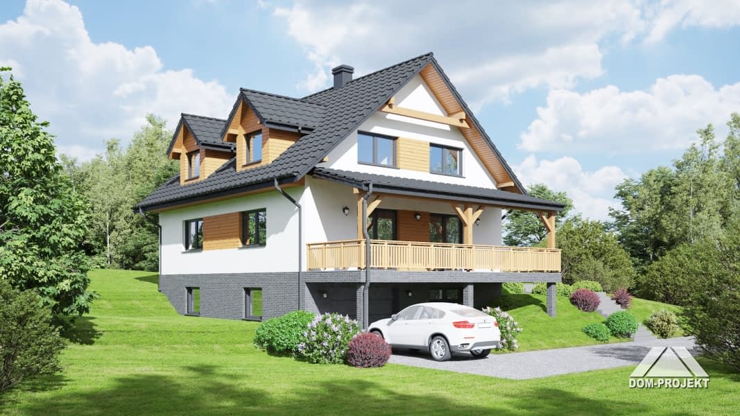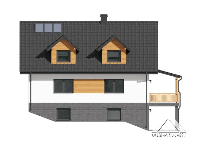 Funkcjonalny dom, doskonały dla osób szukających projektu na działkę ze spadkiem terenu. Na parterze do dyspozycji salon z wygodną kuchnią i spiżarką, dodatkowy pokój , oraz łazienka. Na poddaszu przewidziano cztery dobrze doświetlone sypialnie i łazienkę. Zaplecze gospodarcze domu zlokalizowano w piwnicy.Rzuty