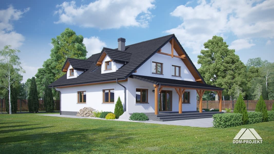 Wygodny dom z 6 pokojami i 2 łazienkami. Duży salon z kominkiem, wyjściem na taras i otwarciem na kuchnię. Kuchnia, pokój, łazienka, komunikacja, wiatrołap, kotłownia, schowek. Na poddaszu cztery pokoje, łazienka, garderoba i komunikacja.Rzuty