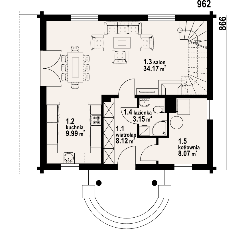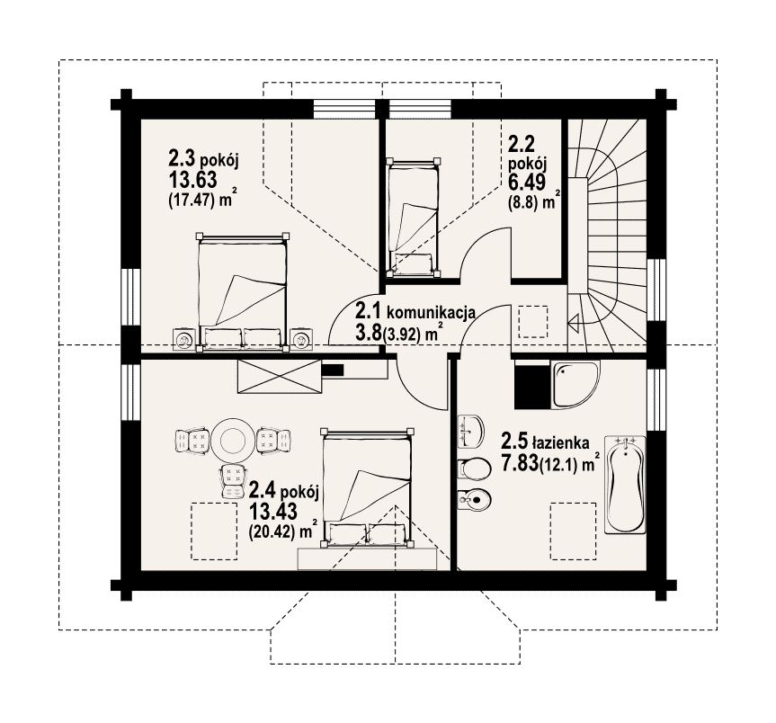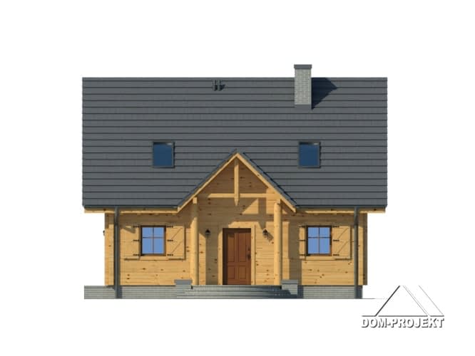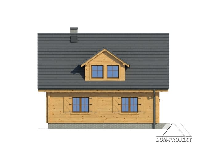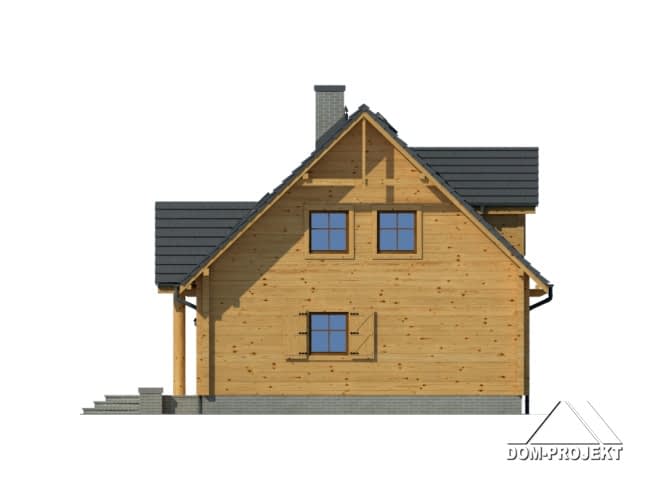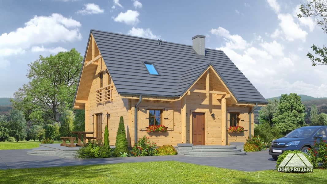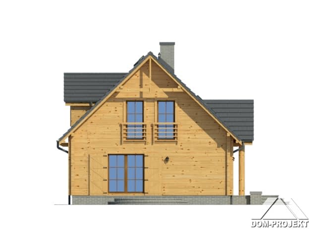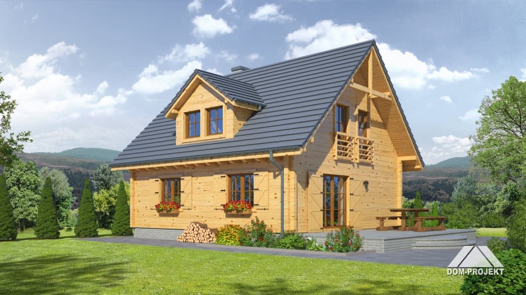 Dom z bali drewnianych. Duży salon z aneksem kuchennym, kominkiem, wyjściem na taras i schodami na poddasze. Wiatrołap, łazienka i kotłownia. na poddaszu trzy pokoje, łazienka i komunikacja Zwarta bryła budynku i dach dwuspadowy sprzyjają szybkiej i taniej budowie oraz niskim kosztom eksploatacji.Rzuty
