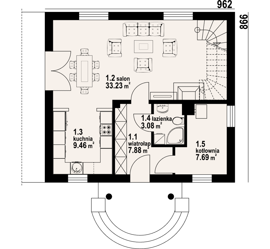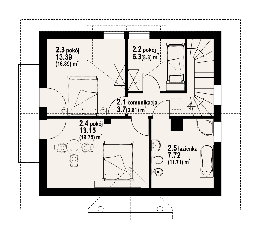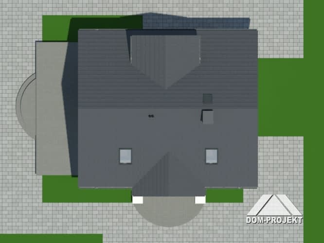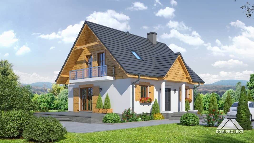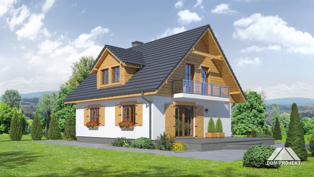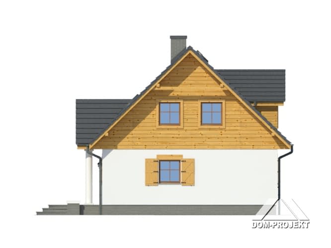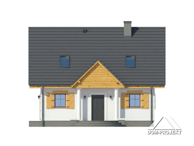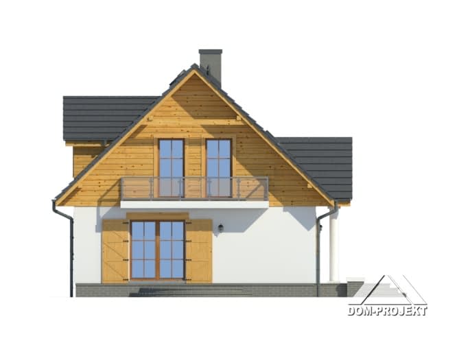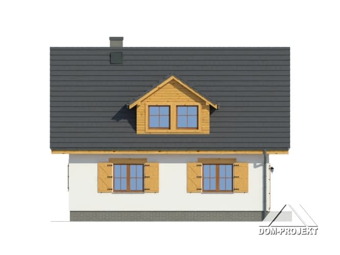 Dom z poddaszem mieszkalnym. Duży salon z aneksem kuchennym, kominkiem, wyjściem na taras i schodami na poddasze. Wiatrołap, łazienka, kotłownia. Na poddaszu trzy pokoje, łazienka i komunikacja. Zwarta bryła budynku i dach dwuspadowy sprzyjają szybkiej i taniej budowie oraz niskim kosztom eksploatacji.Rzuty