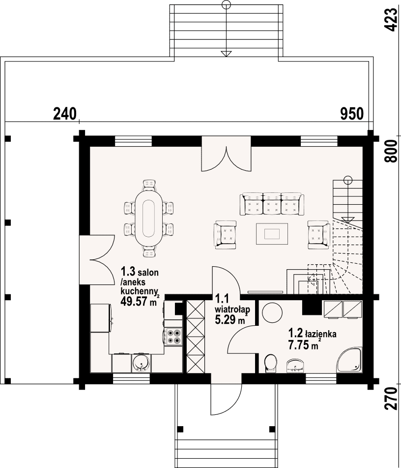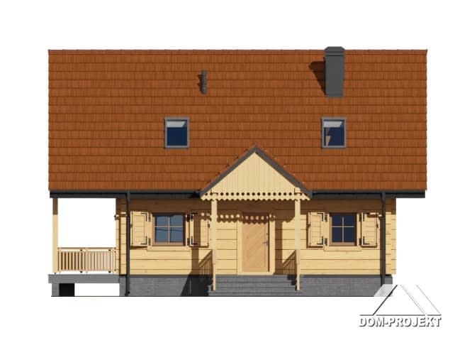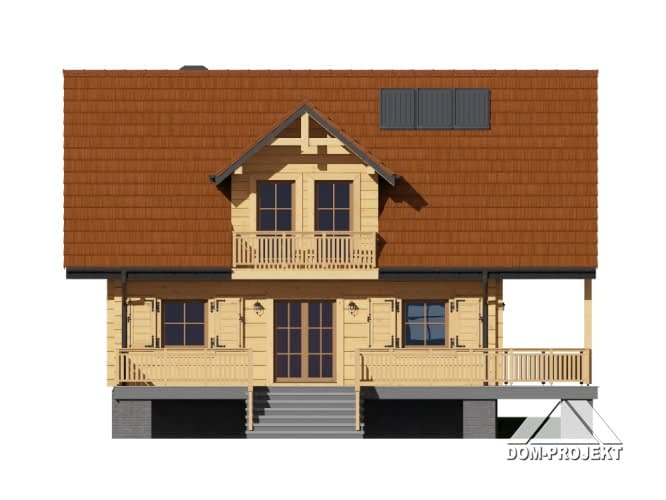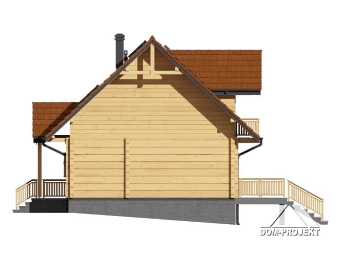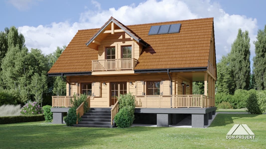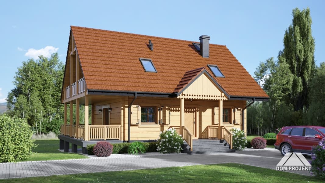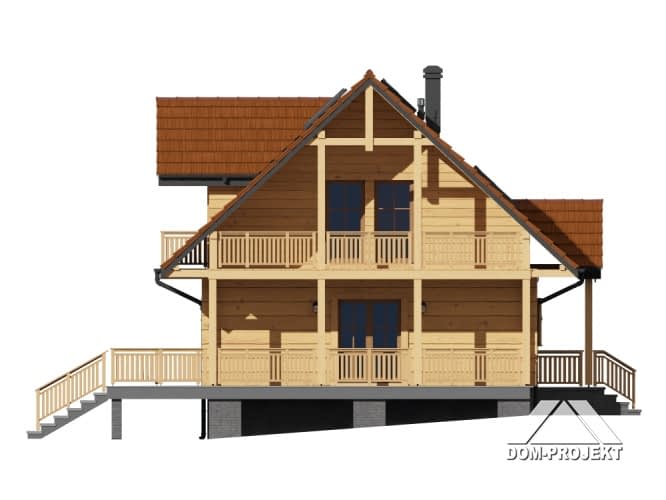 Dom z bali. Na parterze duży salon z aneksem kuchennym, kominkiem, schodami na poddasze i wyjściami na częściowo zadaszony taras, łazienka, wiatrołap. Na poddaszu trzy pokoje, łazienka, komunikacja. Dwa balkony. Zwarta bryła budynku i dach dwuspadowy sprzyjają szybkiej i taniej budowie oraz niskim kosztom eksploatacji.Rzuty