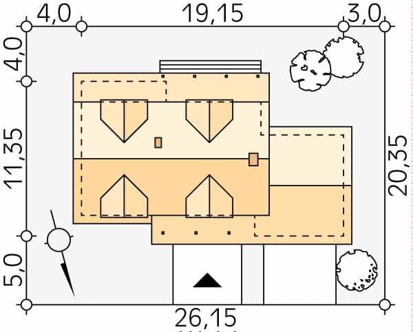 Ściany: 2-warstwowe - POROTHERM 25 PROFI + styropian, Stropy: gęstożebrowe AKERMAN, Dach: dachówka ceramiczna CREATON, kąt nachylenia 45° i 27°Rzuty
