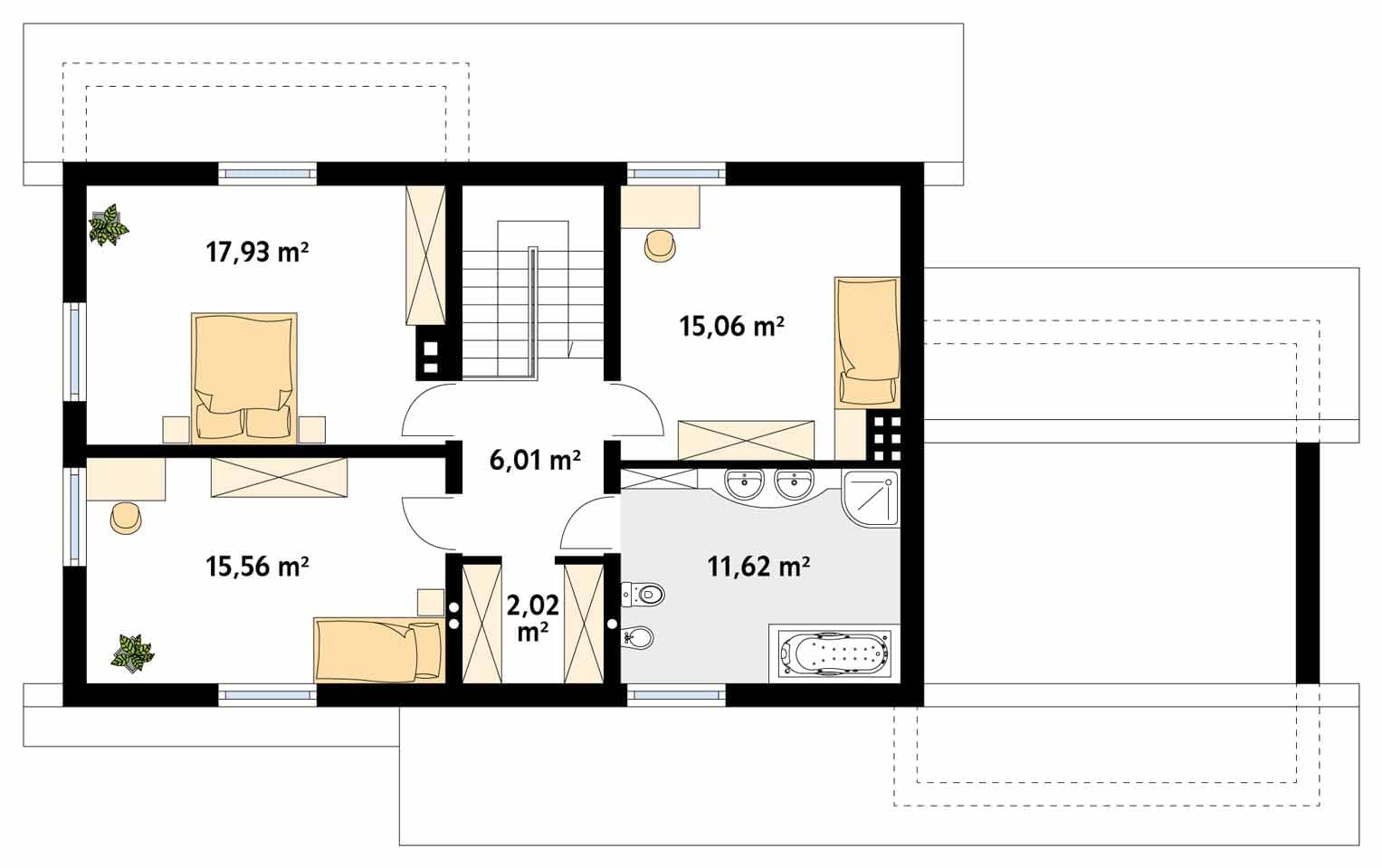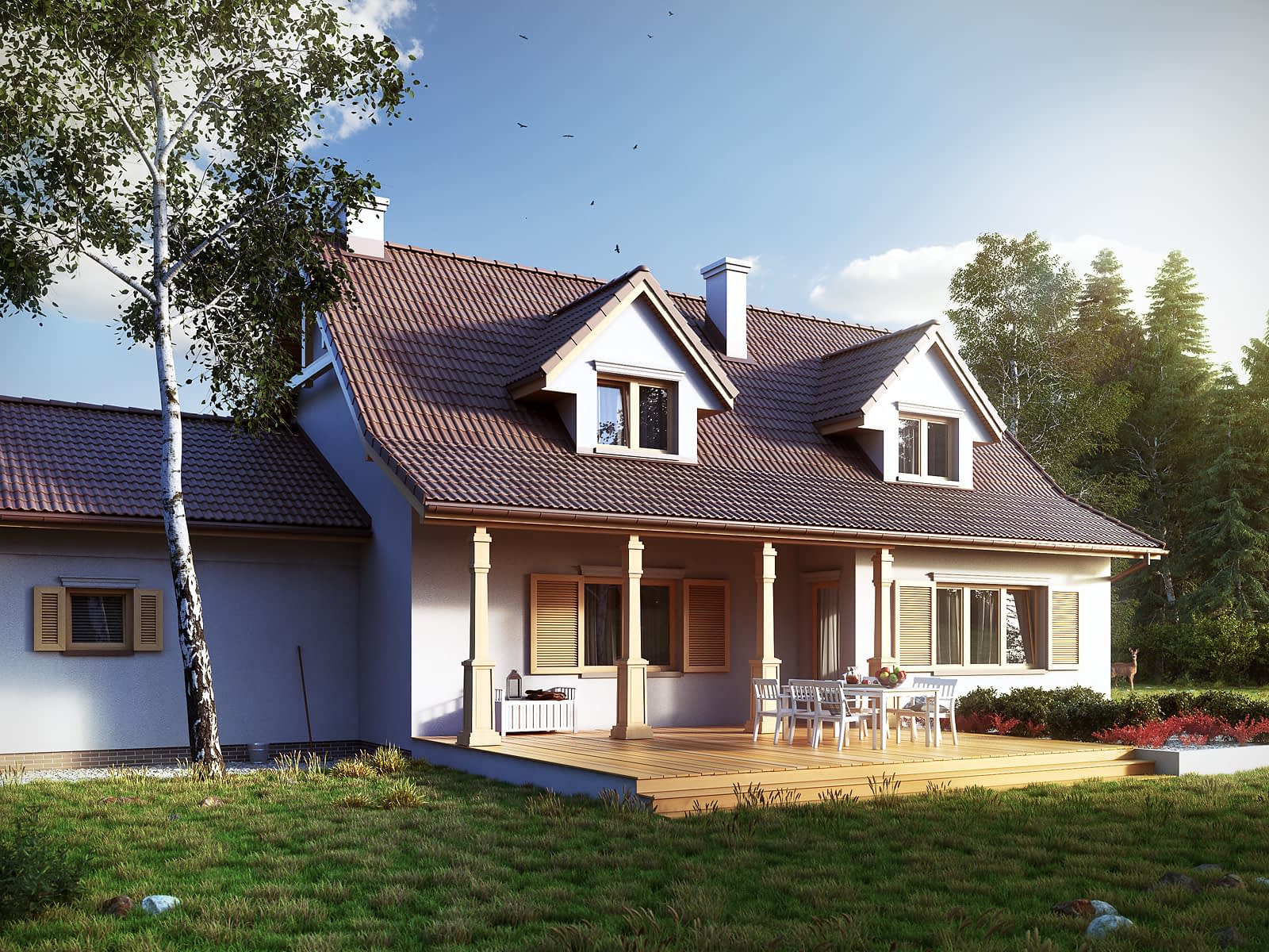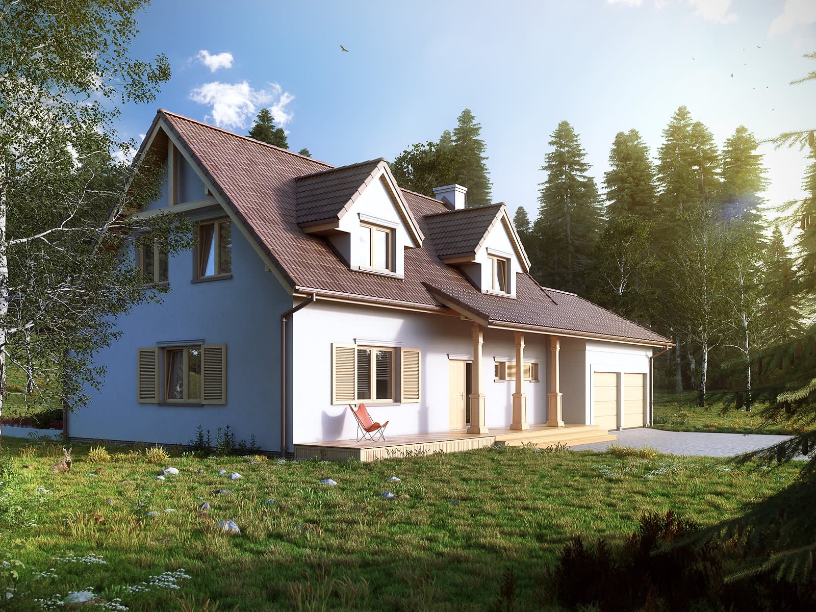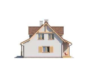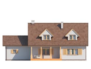 Dom parterowy z użytkowym poddaszem, niepodpiwniczony. Przeznaczony dla 3 – 4-osobowej rodziny. Zaprojektowano zadaszony taras ogrodowy. Na parterze znajduje się dodatkowy pokój. Na poddaszu są trzy sypialnie, garderoba i łazienka.Konstrukcja