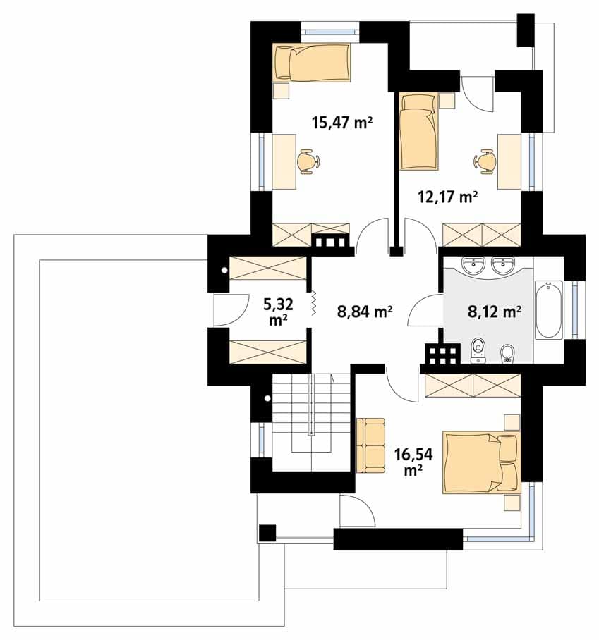 Budynek mieszkalny jednorodzinny, wolnostojący, piętrowy, częściowo podpiwniczony. W piwnicy znajdują sie: kotłownia, pralnia oraz pom. gospodarcze. Na parterze zaprojektowano otwartą przestrzeń dzienną, dodatkowy pokój oraz część gospodarczą. Na piętrze zaprojektowano trzy sypialnie, łazienkę oraz garderobę z wyjściem na taras.Konstrukcja