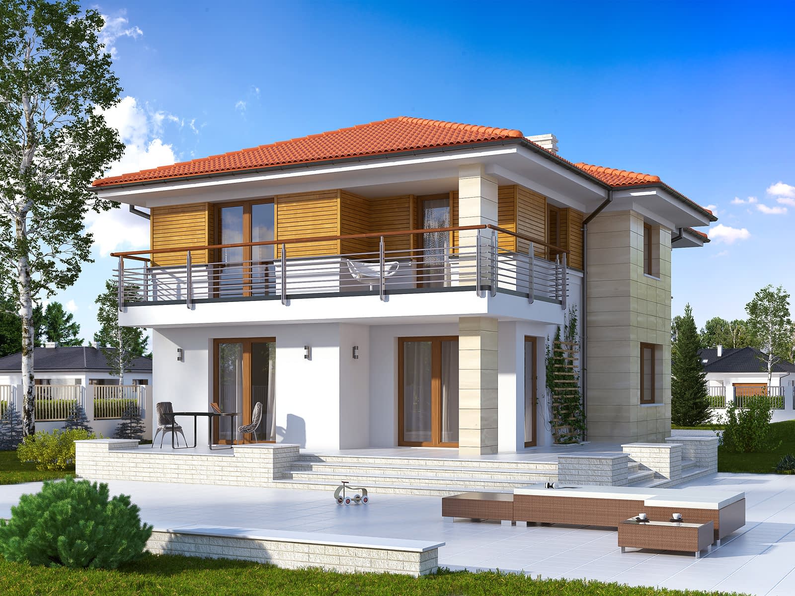 Budynek mieszkalny jednorodzinny w konstrukcji murowanej, wolno stojący, piętrowy, niepodpiwniczony. Na parterze zaprojektowano salon z jadalnią połączony z kuchnią, gabinet, łazienkę, dwustanowiskowy garaż oraz kotłownię. Na piętrze zaprojektowano trzy sypialnie, w tym jedną z łazienką, łazienkę ogólnodostępną oraz garderobę. Bryła budynku przykryta wielospadowym dachem. Praktycznym rozwiązaniem z pewnością okaże się dwustanowiskowy garaż. Wewnątrz domu zaprojektowano trzy sypialnie oraz trzy łazienki. Na uwagę zasługuje garderoba dopełniająca program funkcjonalny domu.Konstrukcja