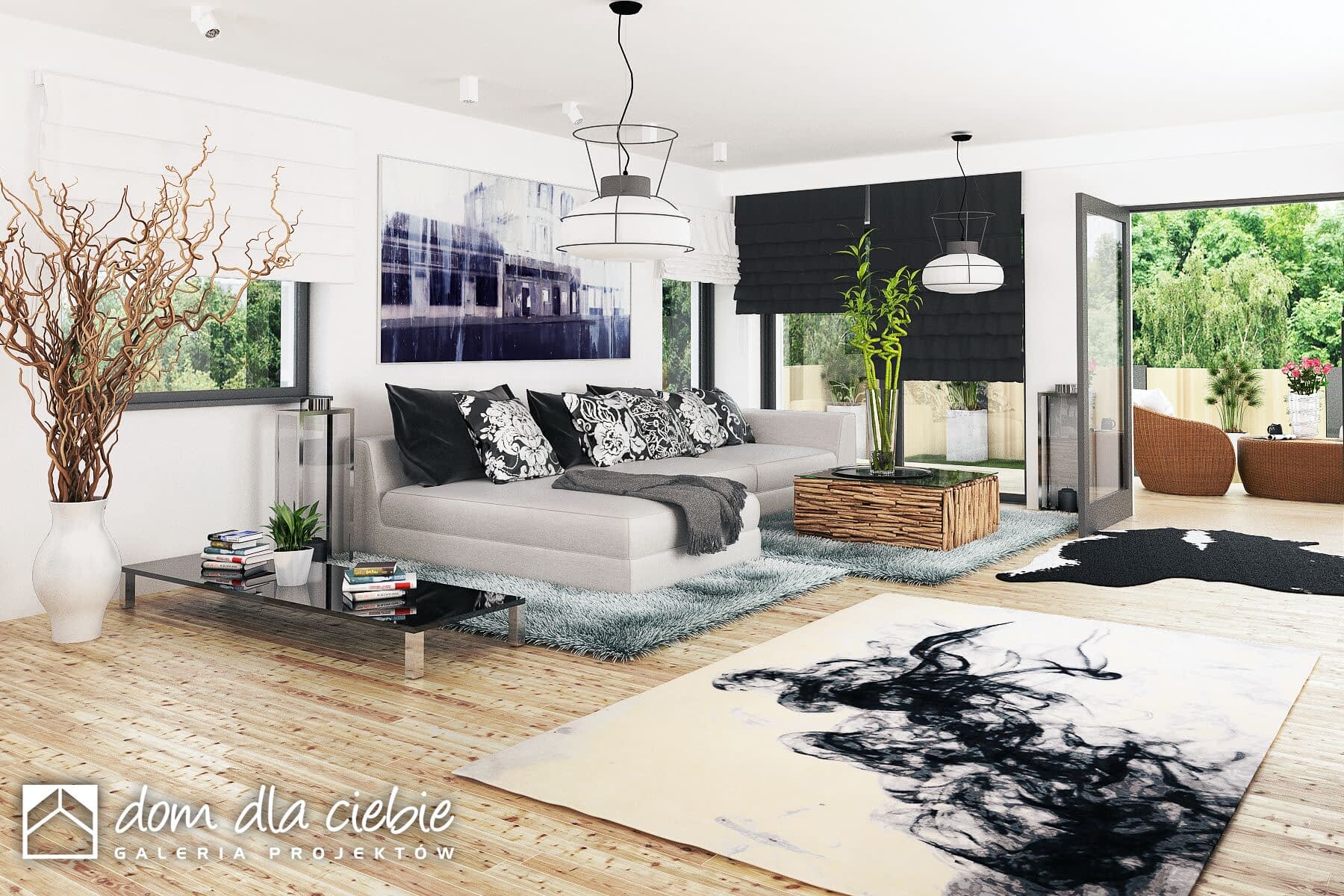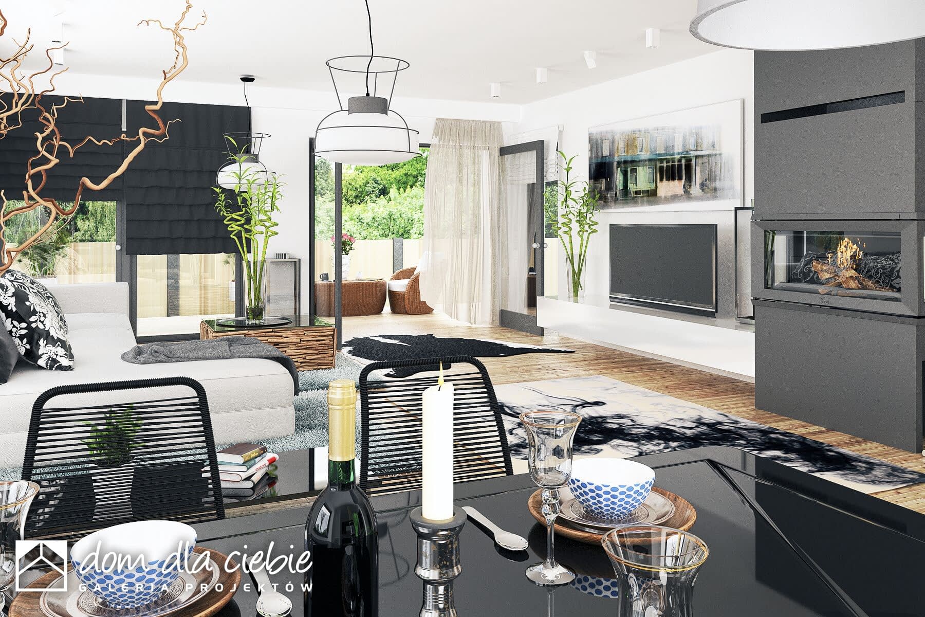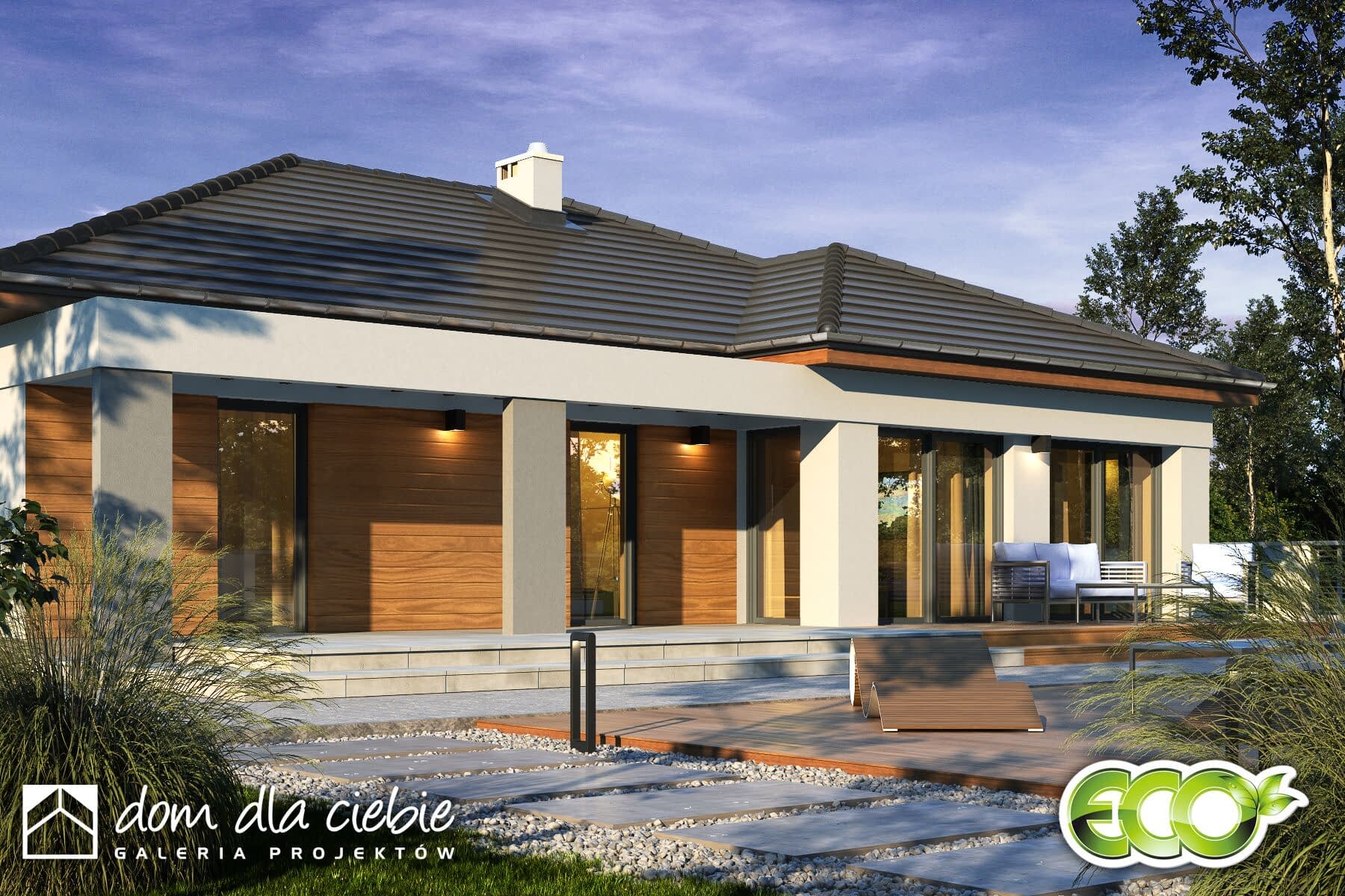 Projekt Cyrus III to propozycja nowoczesnego domu parterowego - to inna wersja popularnego projektu Cyrus, z naszej kolekcji. Cyrus III posiada modne i ciekawe wykończenia elewacji w drewnie i w klinkierze, o ciepłych kolorach. Projekt zaprojektowany został dla 4-osobowej rodziny. Ten wygodny dom posiada przestronny pokój dzienny z kominkiem i "szklaną ścianą" z możliwością wyjścia na ogród, który sąsiaduje z otwartą wygodną kuchnią oraz jadalnią gdzie z powodzeniem zmieści się duży rodzinny stół jadalny. Przy kuchni zaprojektowano wygodną spiżarnię na zapasy.Poprzez funkcjonalny podział pomieszczeń domu na strefy dzienną i nocną zapewnia, całej rodzinie została zapewniona wygoda o poczucie komfortu. W kolejnej części domu, strefie prywatnej, przewidziano trzy wygodne sypialnie, garderobę i dwie łazienki. Jedna z nich dostępna jest z dwuosobowej sypialni. W projekcie - na poddaszu, zaprojektowano miejsce do celów magazynowych. Projekt Cyrus III wyposażony został w przybudowany garaż na dwa samochody, znajdziemy w nim sporo miejsca na rowery, czy kosiarkę. Mały kąt nachylenia dachu podkreśla elegancki i efektowny charakter domu. Nowoczesne podcienie z modnymi ramami na elewacji, podkreślają elegancki wygląd domu.