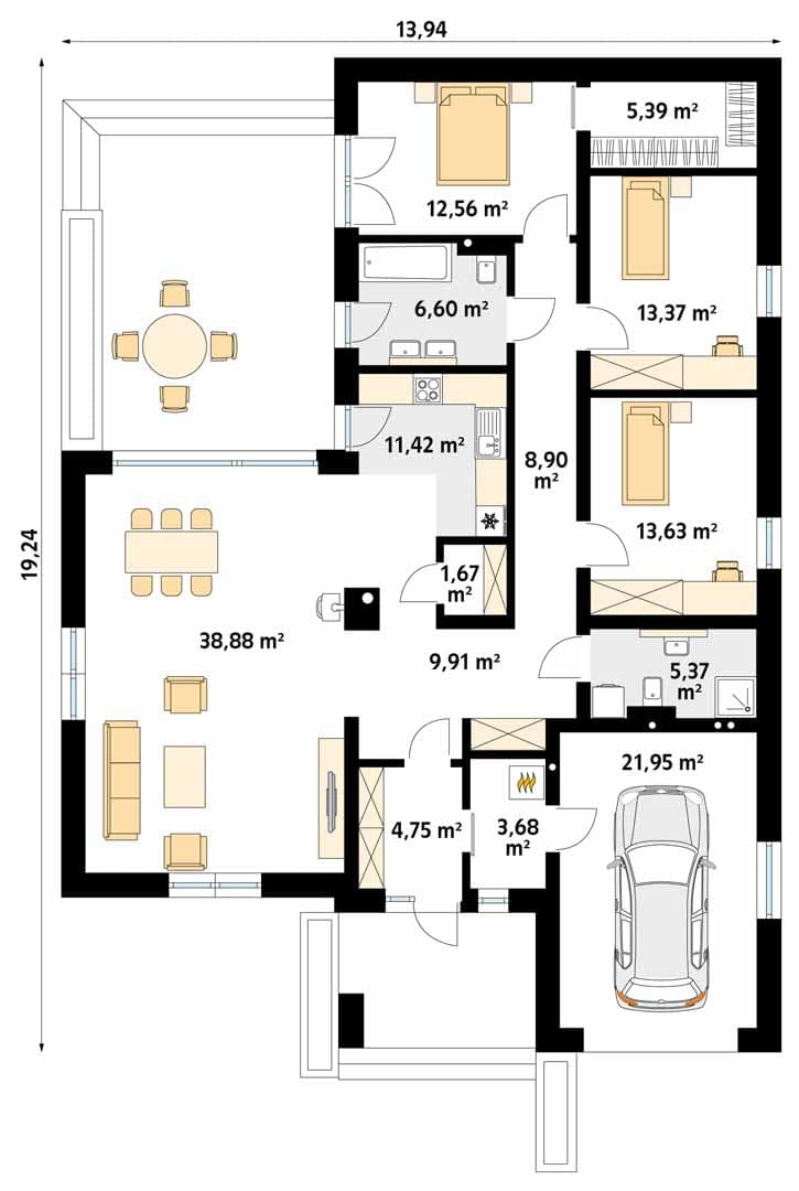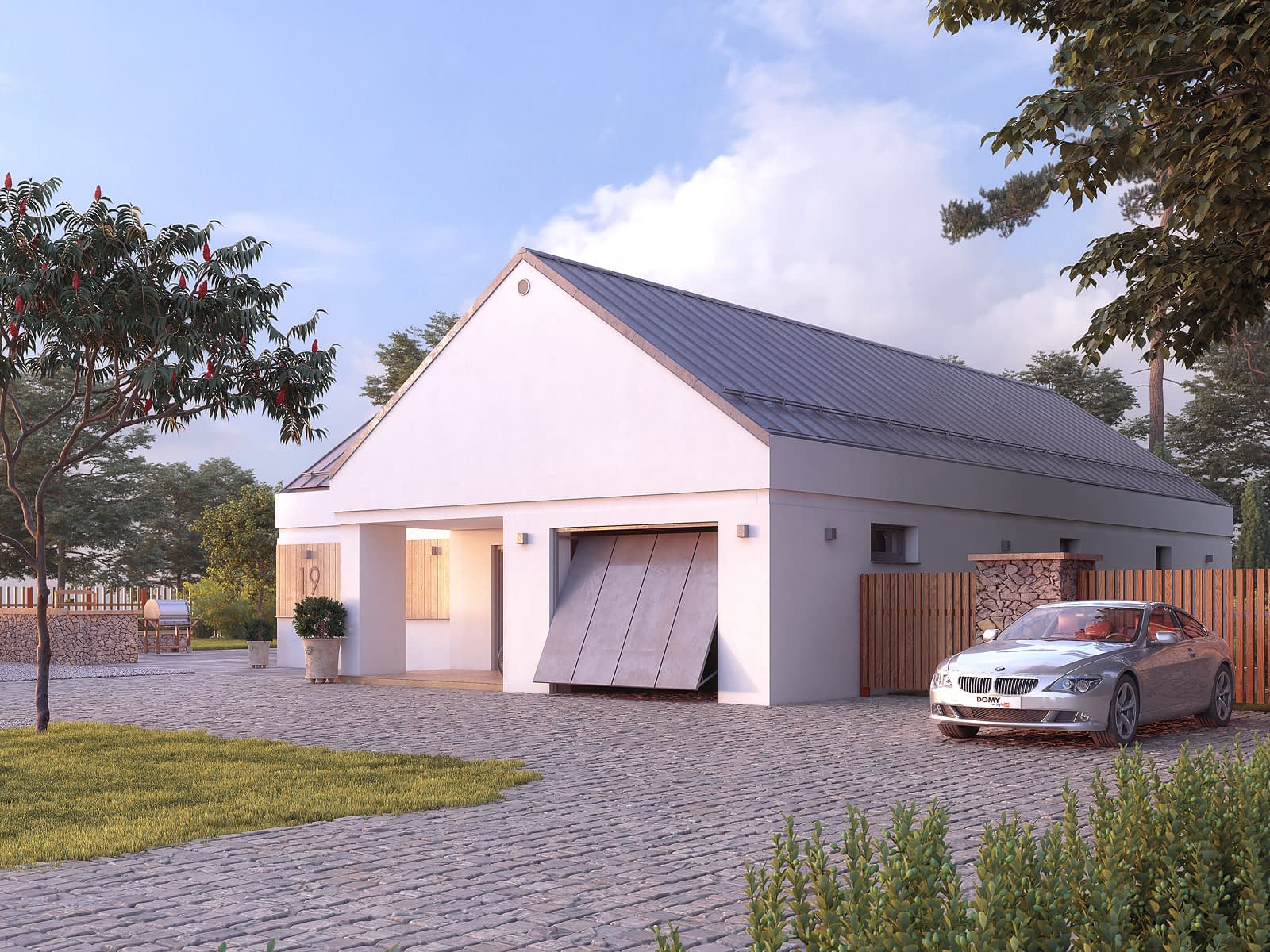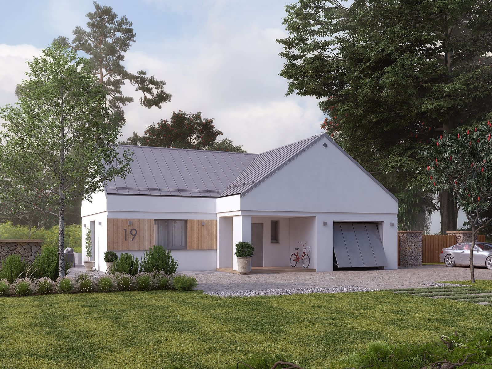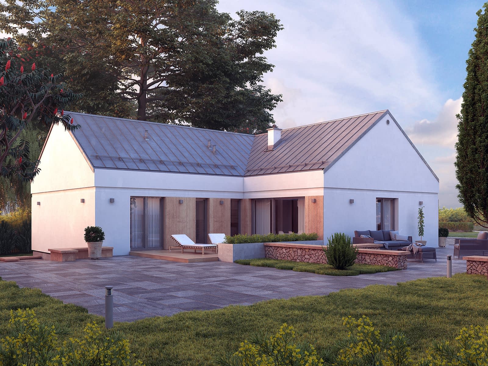 Cytrus 2 to projekt parterowego domu nawiązujący kształtem i proporcjami do tradycyjnego budownictwa domów parterowych z dwuspadowym dachem. Jednocześnie pozbawiona okapów bryła nadaje domowi nowoczesny charakter. Wewnątrz odnajdziemy układ pomieszczeń z wydzieloną strefą dzienną i nocną. Jest to najbardziej klasyczny i sprawdzony funkcjonalnie podział, który pozwoli wszystkim domownikom na niezakłócony wypoczynek. Strefa dzienna to przestronny salon z wydzieloną funkcjonalnie kuchnią. Istotnym elementem jest możliwość bezpośredniego wyjścia z kuchni na taras. Kuchnia poza pełnym programem posiada również wydzieloną spiżarnię. W części nocnej domu zaprojektowano trzy sypialnie oraz dwie łazienki. Główna sypialnia gospodarzy posiada bezpośrednie wyjście na taras.Konstrukcja
