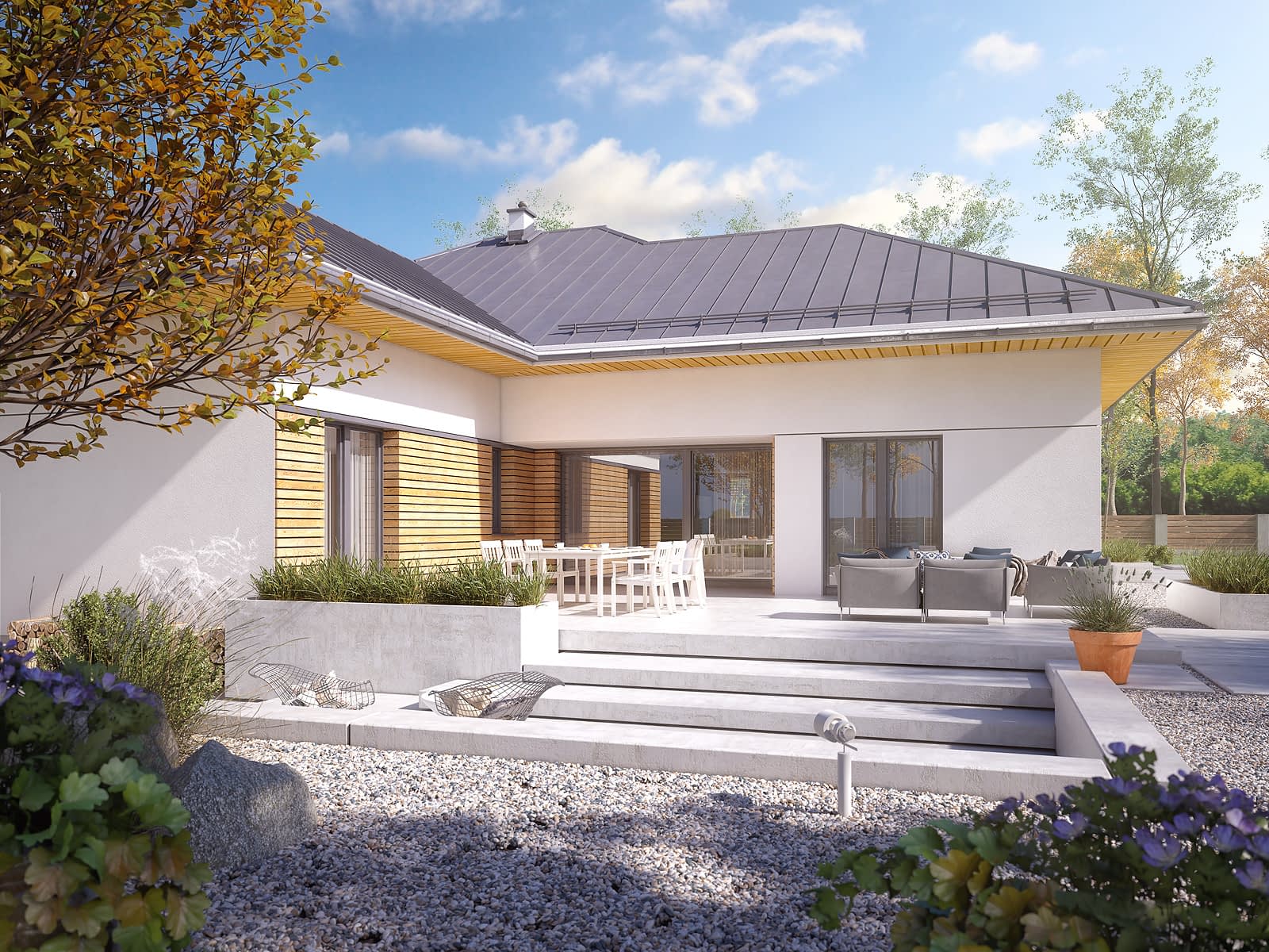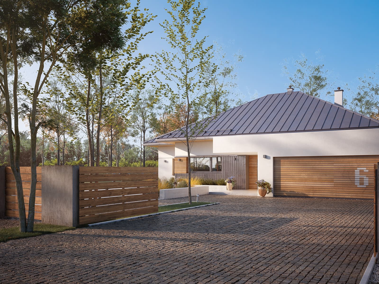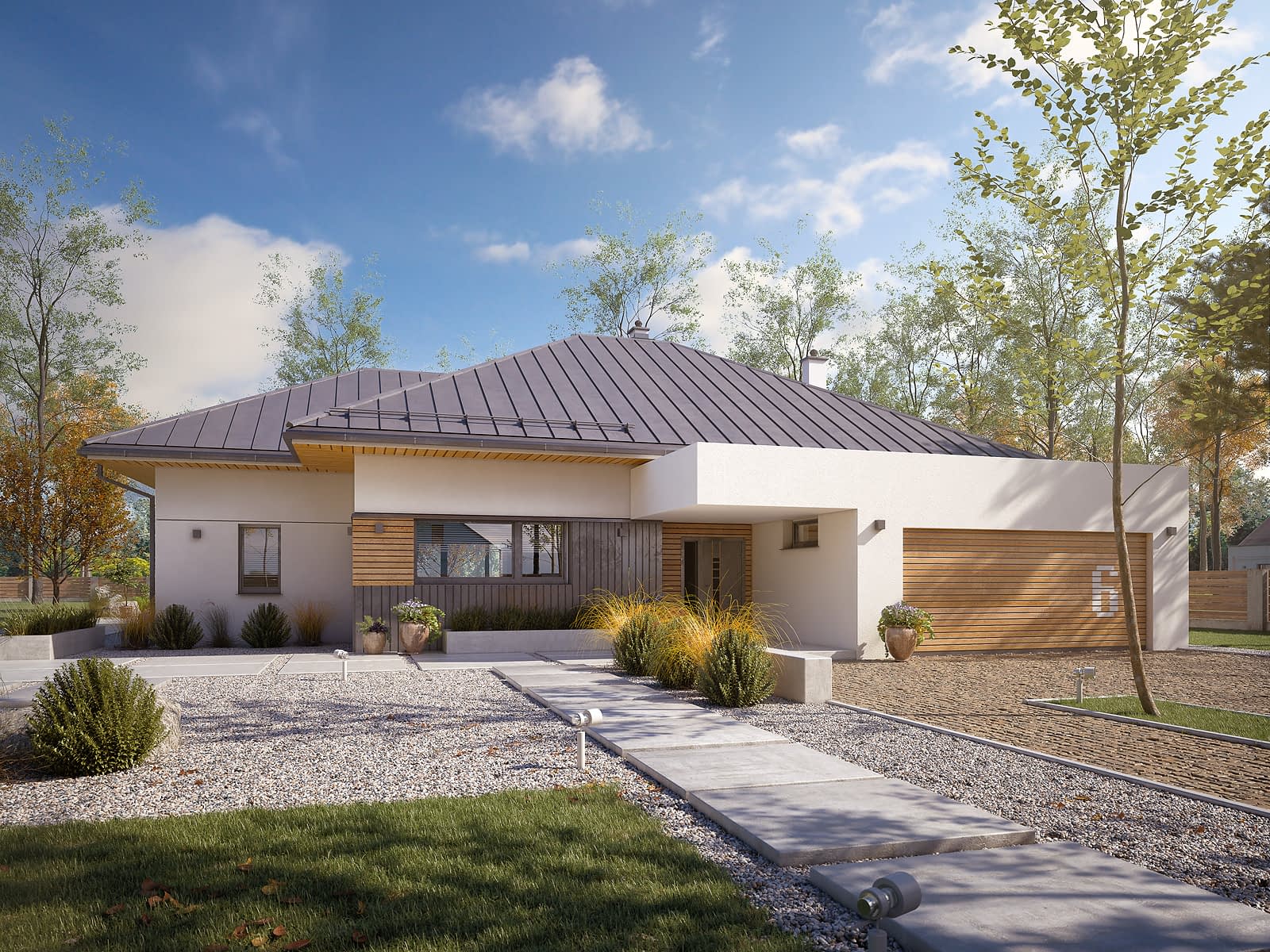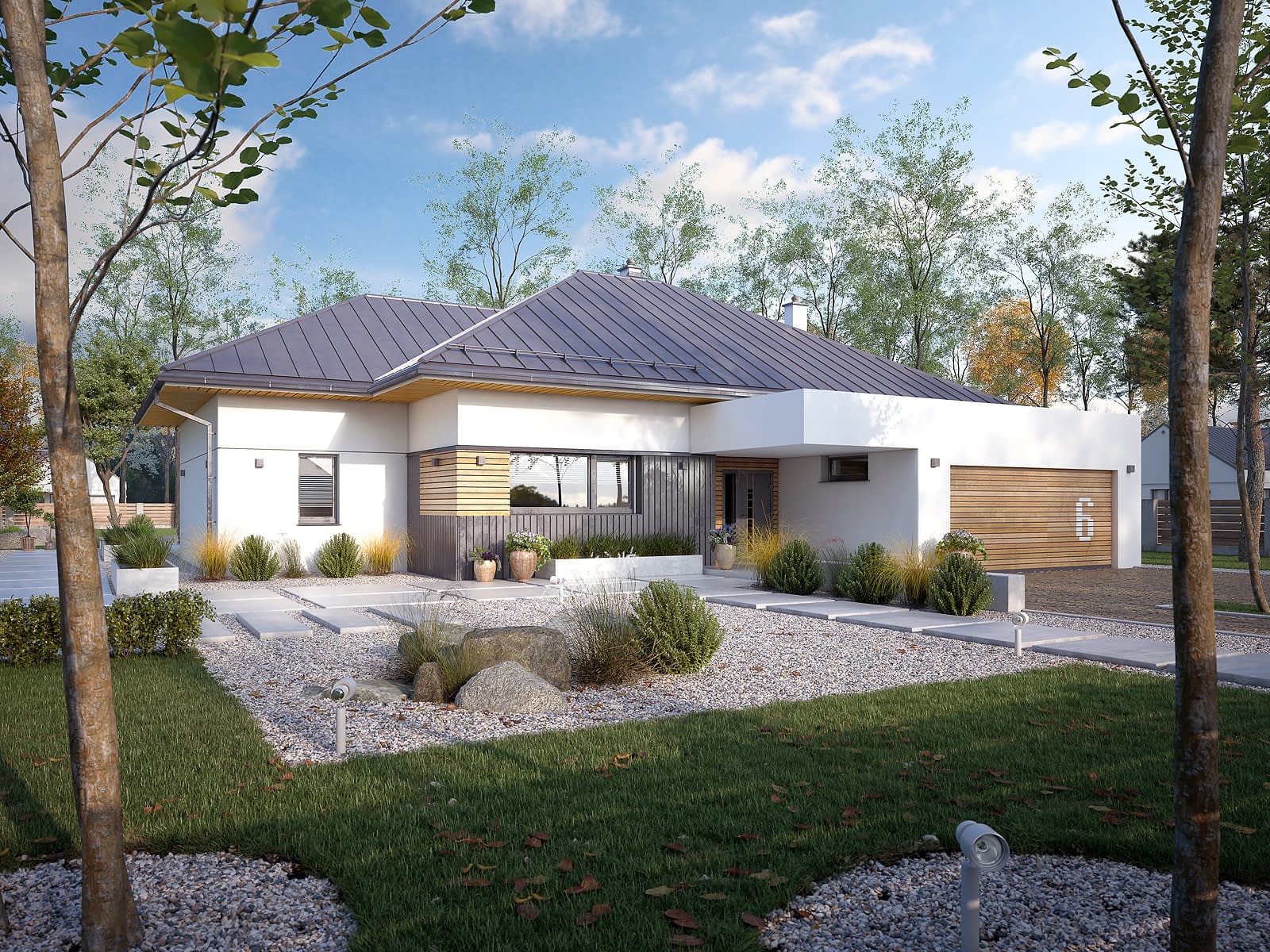 Projekt domu Cytrus 6 to projekt domu parterowego z dużymi możliwościami. Nowoczesny charakter bryły budynku powoduje, że na długo zapada w pamięć. Ten projekt domu jest wręcz stworzony dla 5-6cioosobowej rodziny. Na szczególną uwagę zasługuje podział części nocnej w tym projekcie. Główna sypialnia rodziców została zaprojektowana w oddzielnej części domu niż pozostałe 3 sypialnie. Dzięki takiemu rozwiązaniu, każdy z mieszkańców domu, może cieszyć się ciszą i spokojem. Piękny przestronny salon z miejscem na duży wspólny stół, w ciepłe dni można dodatkowo powiększyć otwierając drzwi na taras. Dla miłośników gotowania na pewno przypadnie do gustu kuchnia, która posiada niezliczoną liczbę blatów do kulinarnych eksperymentów. Szeroki dwustanowiskowy garaż pomieści również nie jeden rower lub kajak.Konstrukcja