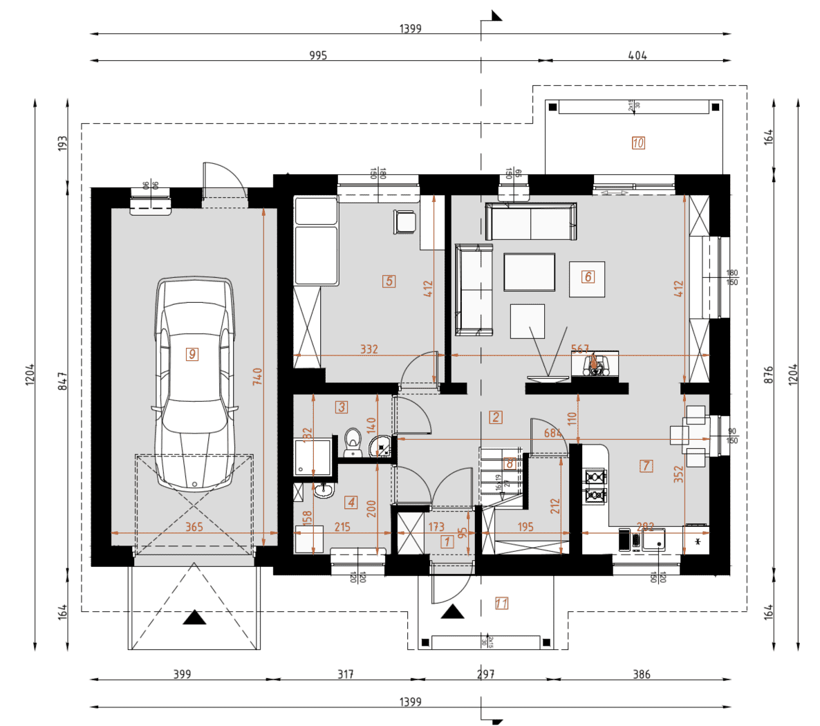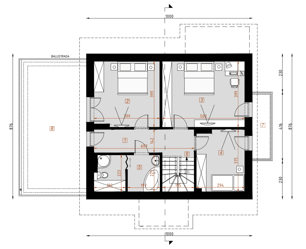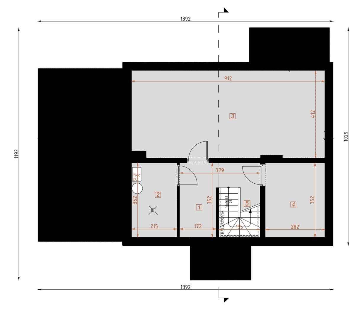 - rzuty wszystkich kondygnacji (np. parter, piwnica, piętro) – rozmieszczenie i wymiary wszystkich pomieszczeń, rozmieszczenie i wielkość otworów okiennych i drzwiowych, rozmieszczenie kominów, sugerowana aranżacja wnętrz.