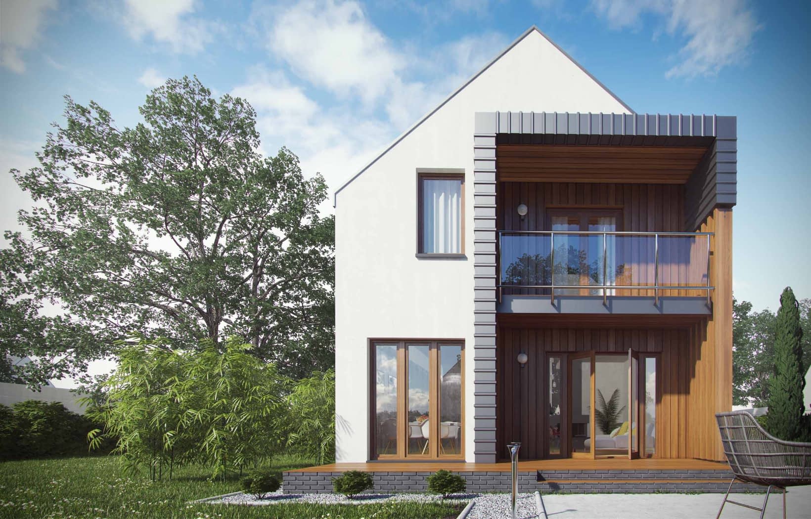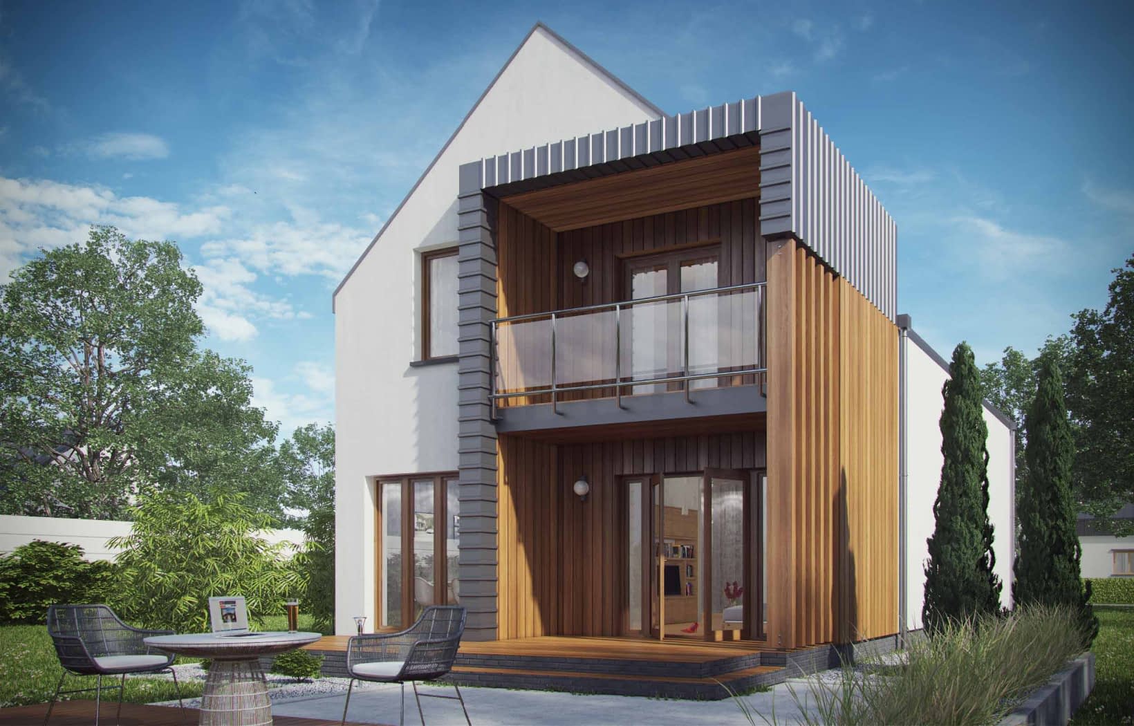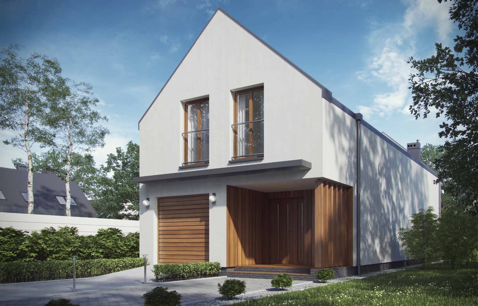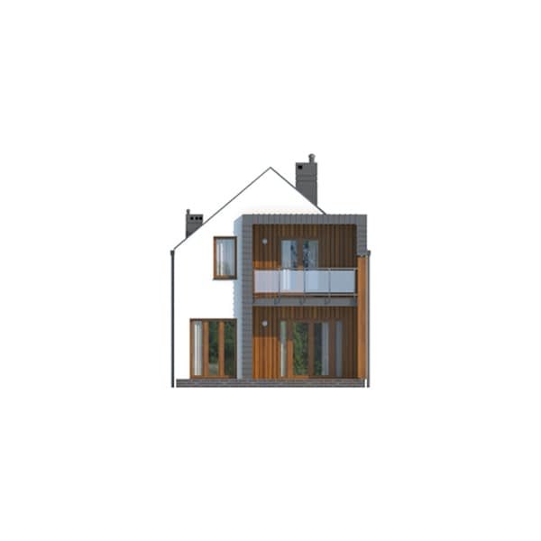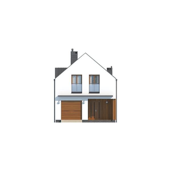 Gotowy projekt D102A to nowoczesny dom jednorodzinny z poddaszem przeznaczony dla czteroosobowej rodziny. Dom idealny na wąska działkę. Prosta forma o nieskomplikowanej konstrukcji zaprojektowana na planie prostokąta zwieńczona dwuspadowym dachem pozwoli na szybką i ekonomiczną budowę oraz późniejszą eksploatację. Białą kolorystykę urozmaicają drewniane wykończenia elewacji. Zadaszony taras wraz z balkonem stanowią ciekawy i nowoczesny element bryły budynku. Projekt domu jednorodzinnego D102A jest doskonałą propozycją dla rodzin preferujących rozkład pomieszczeń podzielony na cześć dzienną i nocną, które cenią funkcjonalność, ale także elegancję i nowoczesność.Konstrukcja
