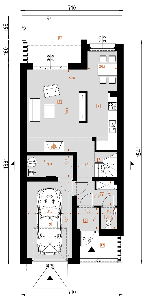 - rzuty wszystkich kondygnacji (np. parter, piwnica, piętro) – rozmieszczenie i wymiary wszystkich pomieszczeń, rozmieszczenie i wielkość otworów okiennych i drzwiowych, rozmieszczenie kominów, sugerowana aranżacja wnętrz.