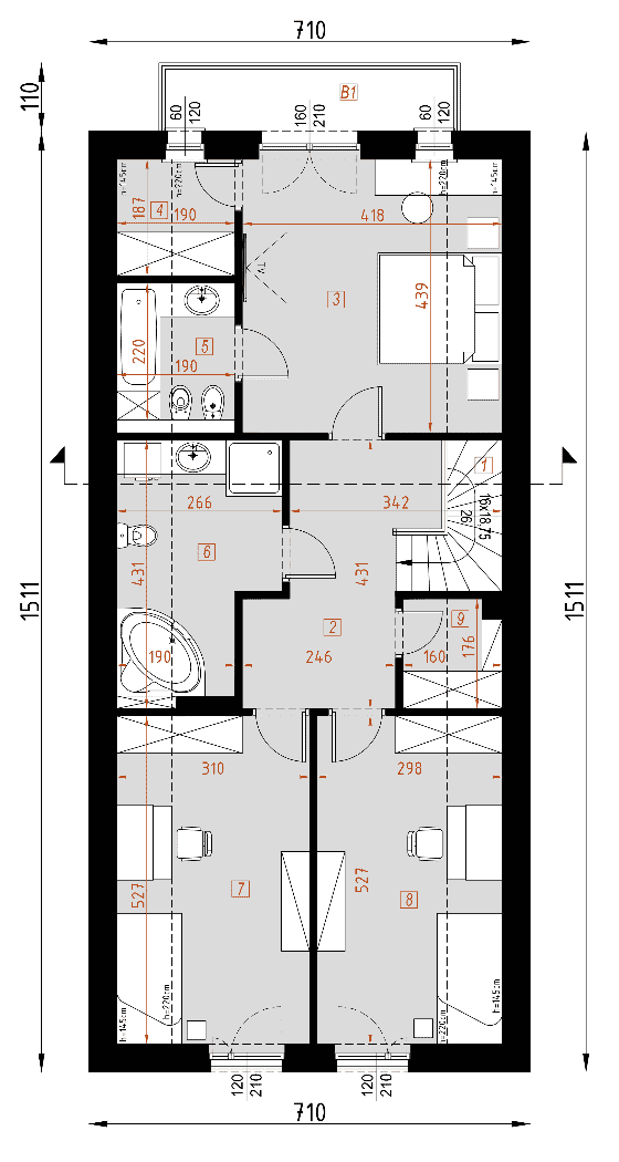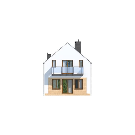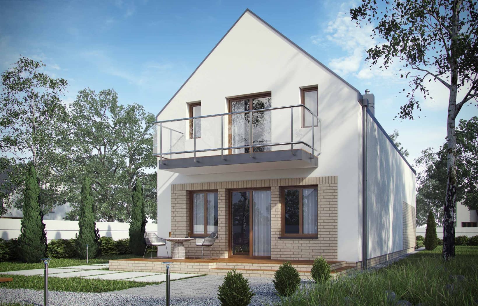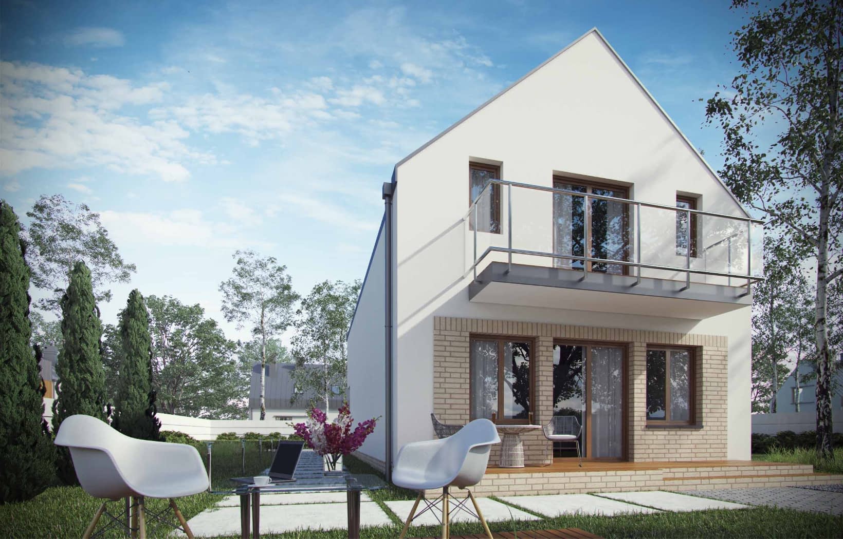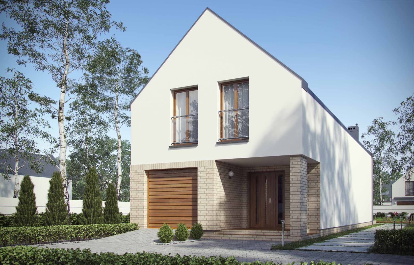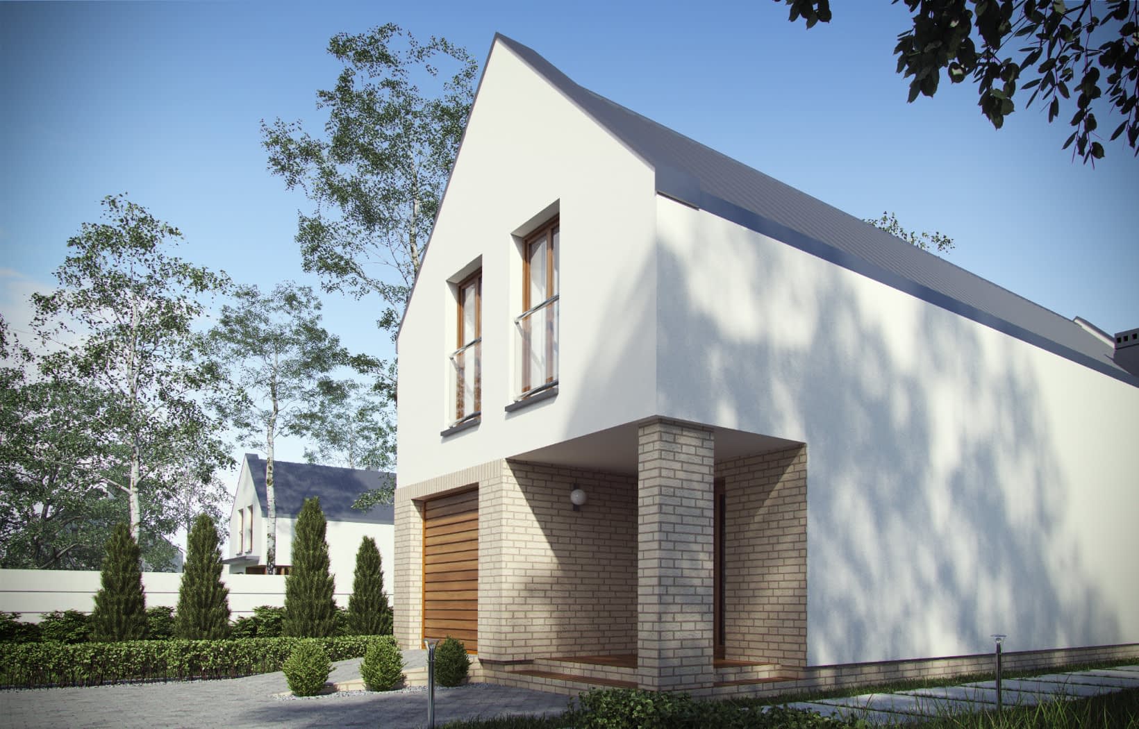 Gotowy projekt D102B to nowoczesny dom jednorodzinny z poddaszem przeznaczony dla czteroosobowej rodziny. Dom idealny na wąska działkę. Prosta forma o nieskomplikowanej konstrukcji zaprojektowana na planie prostokąta zwieńczona dwuspadowym dachem pozwoli na szybką i ekonomiczną budowę oraz późniejszą eksploatację. Białą kolorystykę urozmaicają drewniane wykończenia elewacji. Zadaszony taras wraz z balkonem stanowią ciekawy i nowoczesny element bryły budynku. Projekt domu jednorodzinnego D102B jest doskonałą propozycją dla rodzin preferujących rozkład pomieszczeń podzielony na cześć dzienną i nocną, które cenią funkcjonalność, ale także elegancję i nowoczesność.Konstrukcja