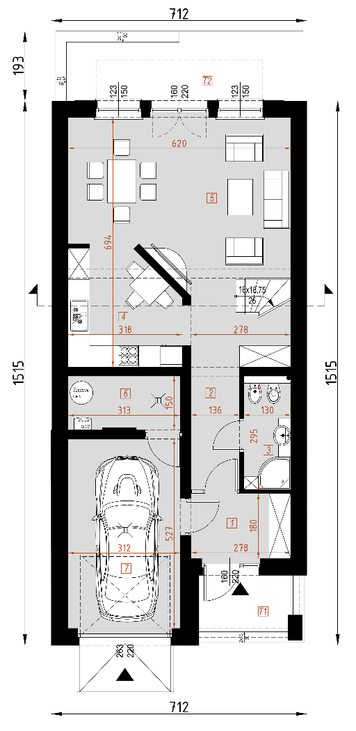 - rzuty wszystkich kondygnacji (np. parter, piwnica, piętro) – rozmieszczenie i wymiary wszystkich pomieszczeń, rozmieszczenie i wielkość otworów okiennych i drzwiowych, rozmieszczenie kominów, sugerowana aranżacja wnętrz.