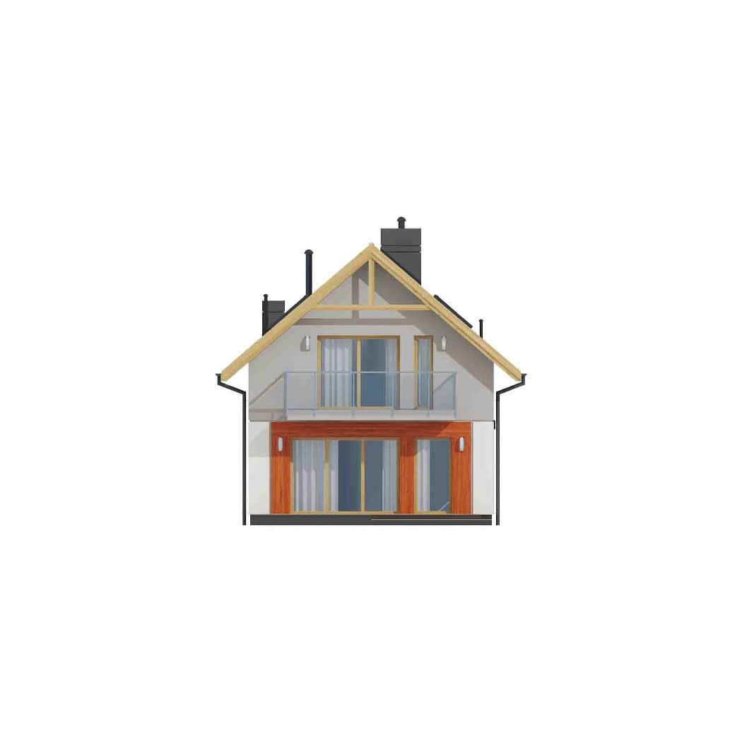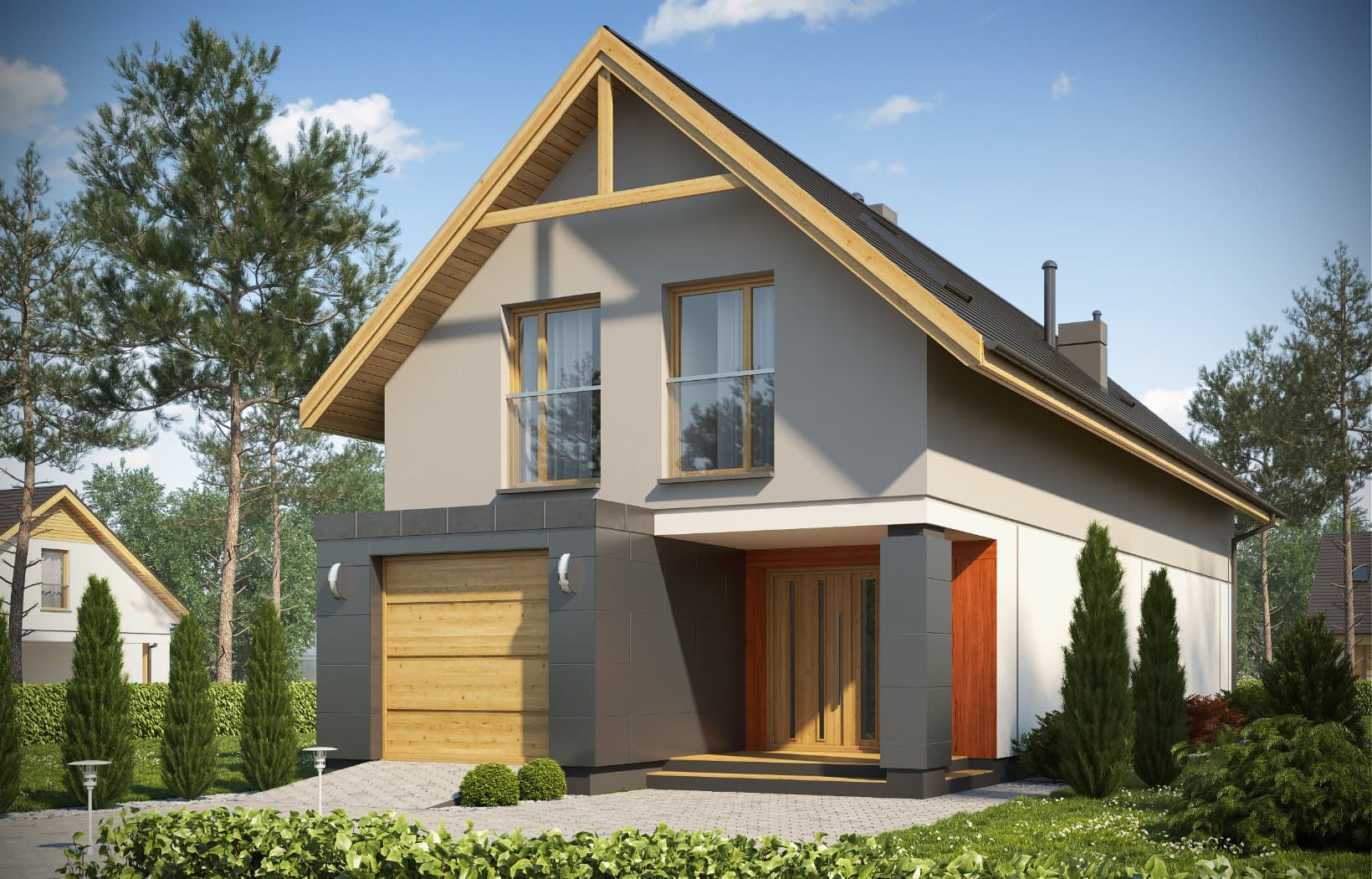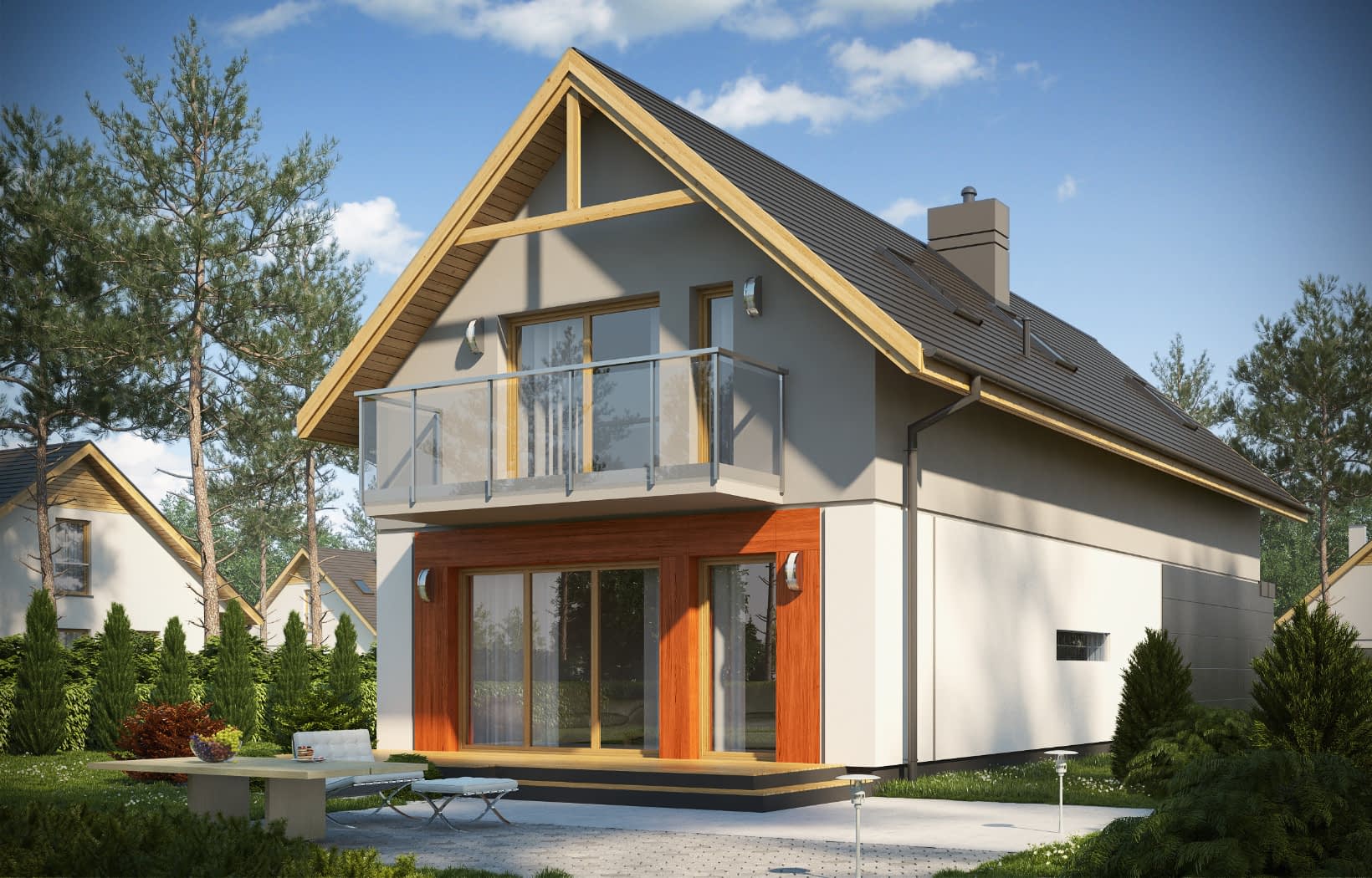 Gotowy projekt D102C to nowoczesny dom jednorodzinny z poddaszem przeznaczony dla czteroosobowej rodziny. Dom idealny na wąska działkę. Prosta forma o nieskomplikowanej konstrukcji zaprojektowana na planie prostokąta zwieńczona dwuspadowym dachem pozwoli na szybką i ekonomiczną budowę oraz późniejszą eksploatację. Białą kolorystykę urozmaicają drewniane wykończenia elewacji. Zadaszony taras wraz z balkonem stanowią ciekawy i nowoczesny element bryły budynku. Projekt domu jednorodzinnego D102A jest doskonałą propozycją dla rodzin preferujących rozkład pomieszczeń podzielony na cześć dzienną i nocną, które cenią funkcjonalność, ale także elegancję i nowoczesność.Konstrukcja