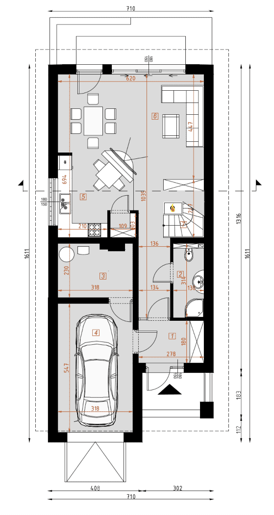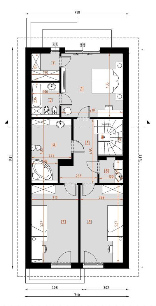 - rzuty wszystkich kondygnacji (np. parter, piwnica, piętro) – rozmieszczenie i wymiary wszystkich pomieszczeń, rozmieszczenie i wielkość otworów okiennych i drzwiowych, rozmieszczenie kominów, sugerowana aranżacja wnętrz.