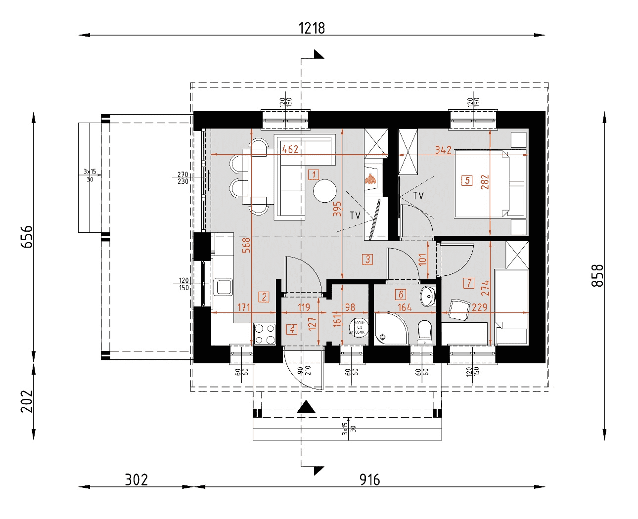 - rzuty wszystkich kondygnacji (np. parter, piwnica, piętro) – rozmieszczenie i wymiary wszystkich pomieszczeń, rozmieszczenie i wielkość otworów okiennych i drzwiowych, rozmieszczenie kominów, sugerowana aranżacja wnętrz.