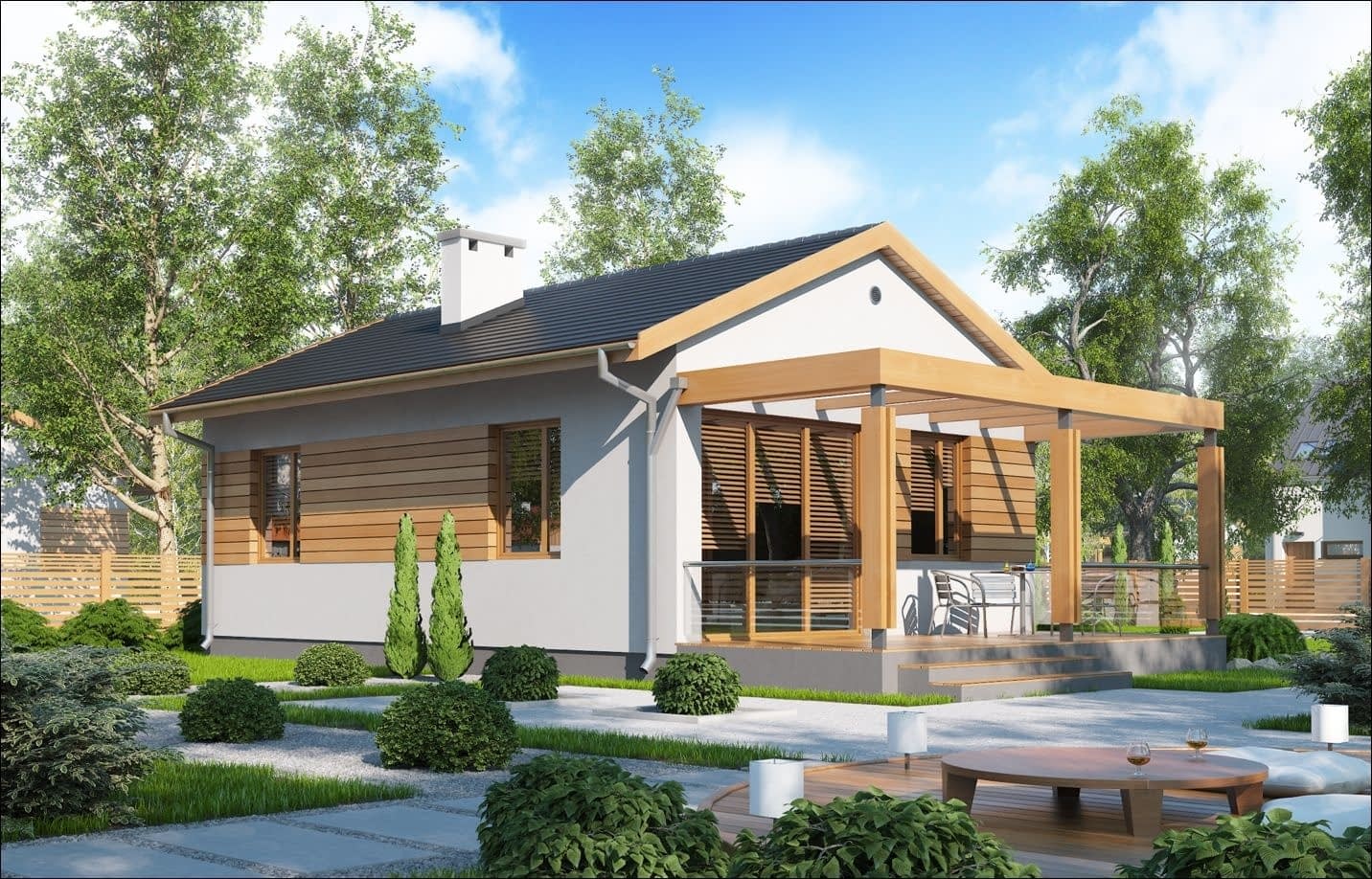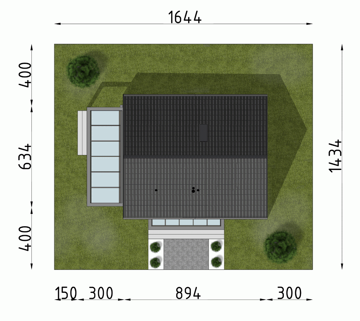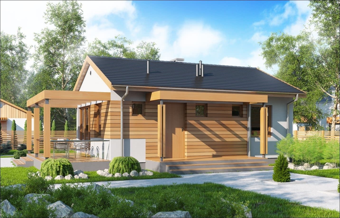 - elewacje (frontowa, dwie elewacje boczne, ogrodowa) – dokładny wygląd domu z każdej strony.