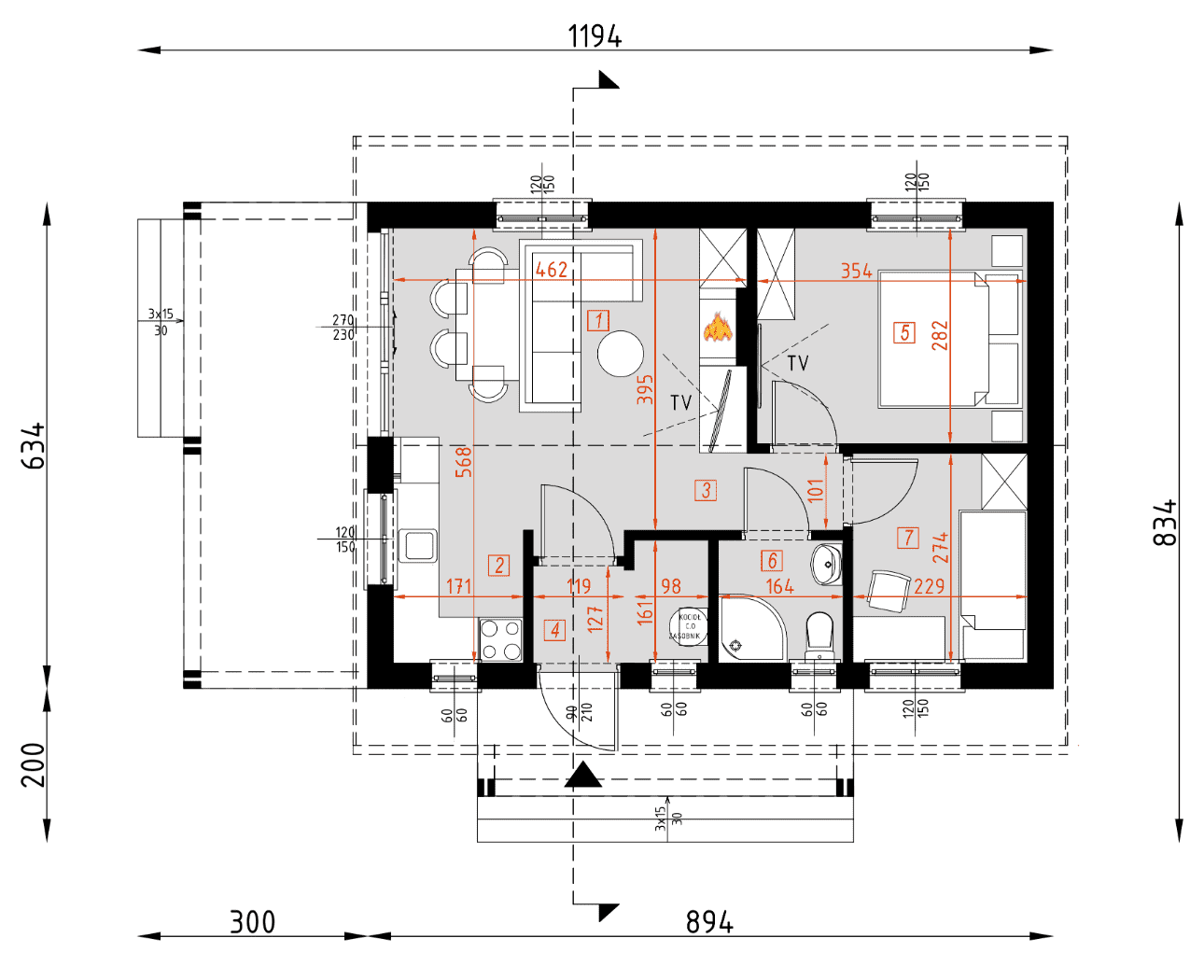 Materiały: Ściany zewnętrzne: drewniane z ociepleniem. strop: dźwigar dachowy konstrukcja dachu: drewniany: dźwigar dachowy pokrycie dachu: blachodachówka elewacja: tynk cienkowarstwowy, na fragmentach ścian deski. ogrzewanie - kocioł gazowy EP70 kWh/m2.rok Projekt zgodny z Wt2021 wentylacja grawitacyjnaRzuty