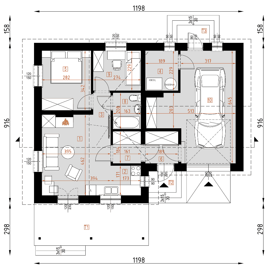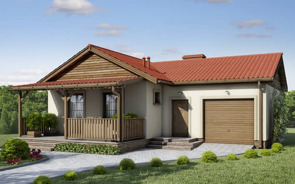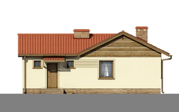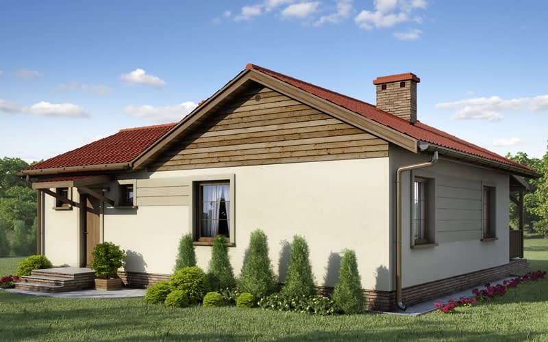 Dom parterowy wolnostojący. W układzie domu wyraźny podział na część mieszkalną i techniczną z garażem i kotłownią. Po wejściu do domu znajdujemy się w przedsionku, z którego możemy dostać się do garażu lub do głównej, mieszkalnej części domu. Po minięciu garderoby znajdujemy się w pokoju dziennym połączonym z otwartą kuchnią lub korytarzem możemy dostać się do dwóch sypialni i łazienki.Konstrukcja