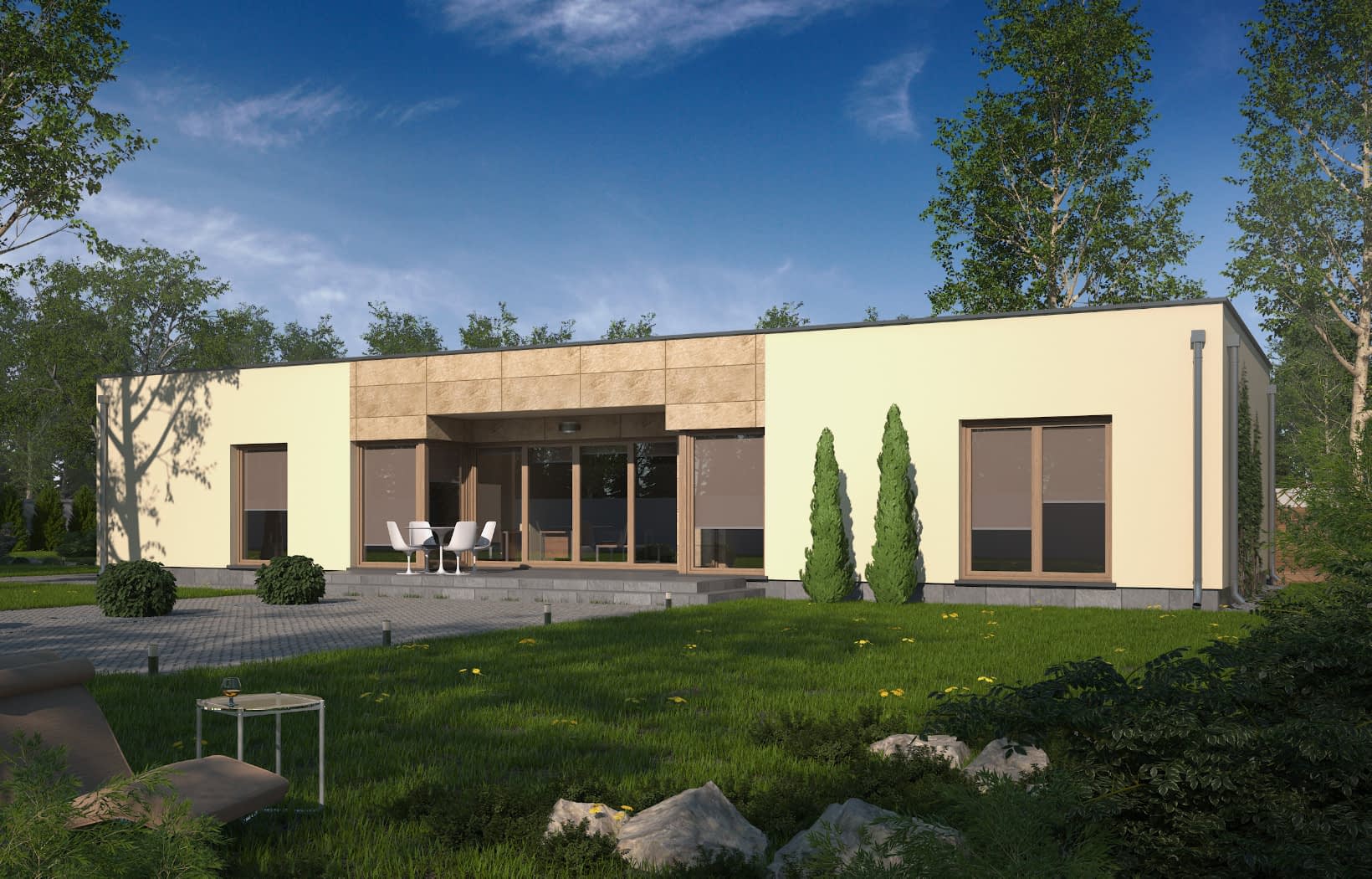 Dom D114 to przykład nowoczesnej parterowej willi miejskiej . Prosta, czysta bryła oraz harmonijny podział w elewacjach czynią ten dom prostym i eleganckim. Dzięki temu koszty poniesione na budowę zostały mocno zredukowane. Dodatkowym założeniem przyjętym przy projekcie budynku było harmonijne wpisanie się zarówno w naturalny krajobraz jak również w krajobraz miejski. Jest to budynek parterowy kryty dachem płaskim. W elewacji budynku poprzez materiał zaakcentowano wyraźnie, strefę wejściową. W bryle budynku oddzielono także funkcję mieszkalną dzienną od nocnej, jak również strefę mieszkalną od strefy gospodarczej.Konstrukcja