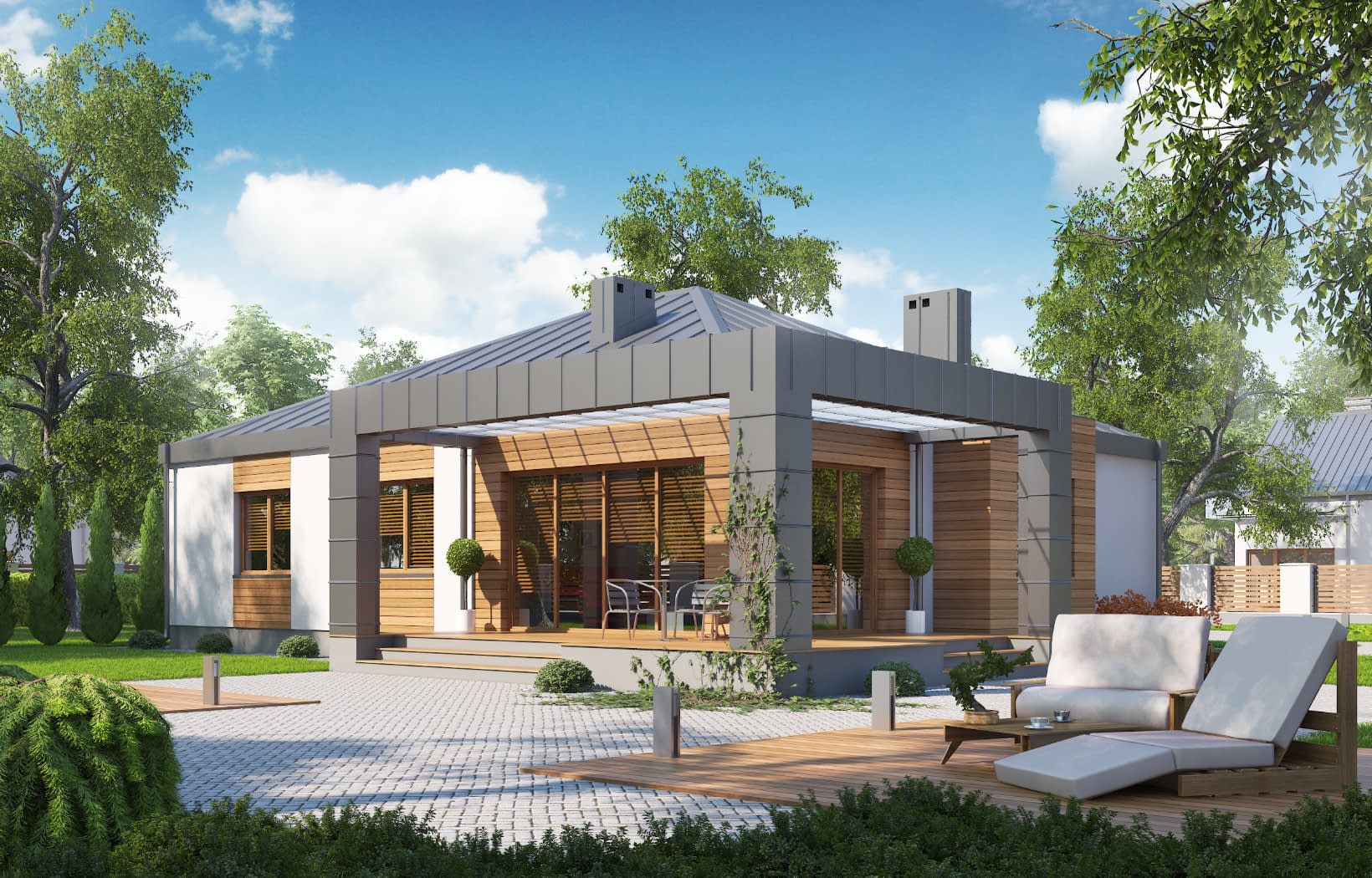 Dom D123 Zbyszek to nowoczesna forma, czytelny i funkcjonalny układ. Prosta, czysta bryła oraz harmonijny podział w elewacjach czynią ten dom prostym i eleganckim. Dodatkowym założeniem przyjętym przy projekcie budynku było harmonijne wpisanie się zarówno w naturalny krajobraz jak również w krajobraz miejski. Jest to budynek parterowy kryty czterospadowym dachem. W elewacji budynku poprzez materiał zaakcentowano wyraźnie, strefę wejściową. Od strony południowej zaprojektowano salon i jadalnię, od strony północnej sypialnie i pokój gościnny. Wejście znajduje się po wschodniej stronie budynku. Na tą stronę wychodzą także okna kuchni. Strefa dzienna składa się z hall’u, kuchni, salonu połączonego z jadalnią. Strefa prywatna składa się z trzech pokoi i łazienki, spiżarnia z piecem CO i termą CW. Funkcję komunikacyjną pełni hall.Konstrukcja