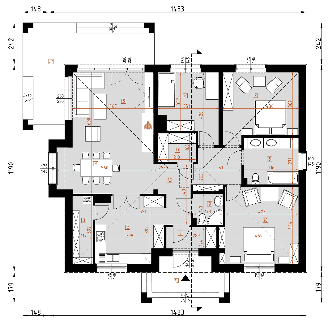 - rzuty wszystkich kondygnacji (np. parter, piwnica, piętro) – rozmieszczenie i wymiary wszystkich pomieszczeń, rozmieszczenie i wielkość otworów okiennych i drzwiowych, rozmieszczenie kominów, sugerowana aranżacja wnętrz.