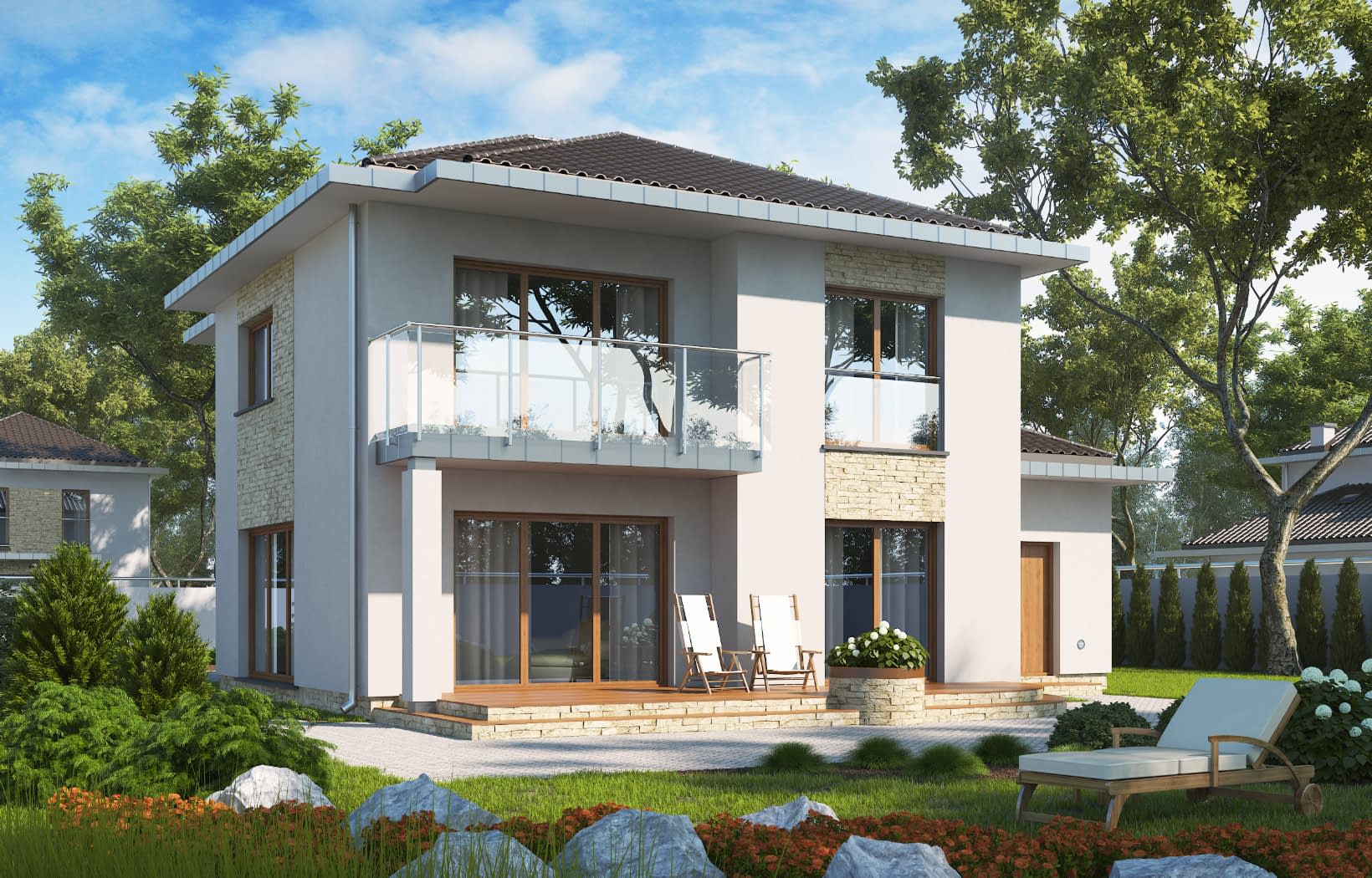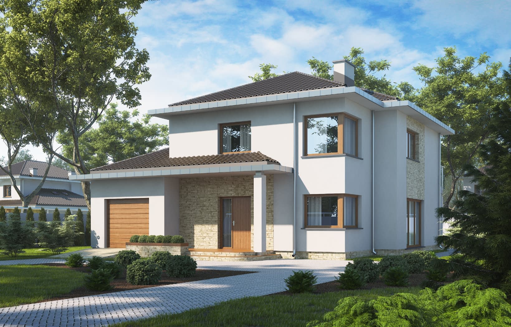 - elewacje (frontowa, dwie elewacje boczne, ogrodowa) – dokładny wygląd domu z każdej strony.