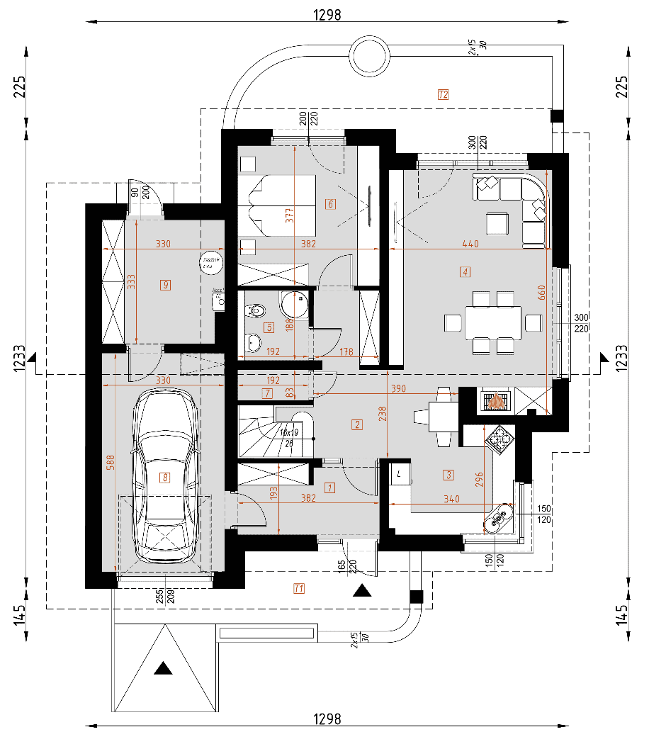 Dom D132 jest odpowiedzią na potrzeby naszych klientów, szukających nowoczesnej willi miejskiej z garażem. Prosta, czysta bryła oraz harmonijny podział w elewacjach czynią ten dom klasycznie eleganckim. Podstawowym założeniem przyjętym przy projekcie budynku było harmonijne wpisanie się w miejski krajobraz. Jest to budynek piętrowy kryty kopertowym dachem. W elewacji budynku poprzez materiał zaakcentowano wyraźnie, strefę wejściową. W bryle budynku oddzielono także funkcję mieszkalną dzienną od nocnej, jak również strefę mieszkalną od garażu i strefy gospodarczej. Projekt ten zdobył I miejsce w konkursie "Najlepiej Sprzedawane Projekty Domów – Projekt Roku 2013” Publikatora w kategorii Domy Piętrowe.Konstrukcja