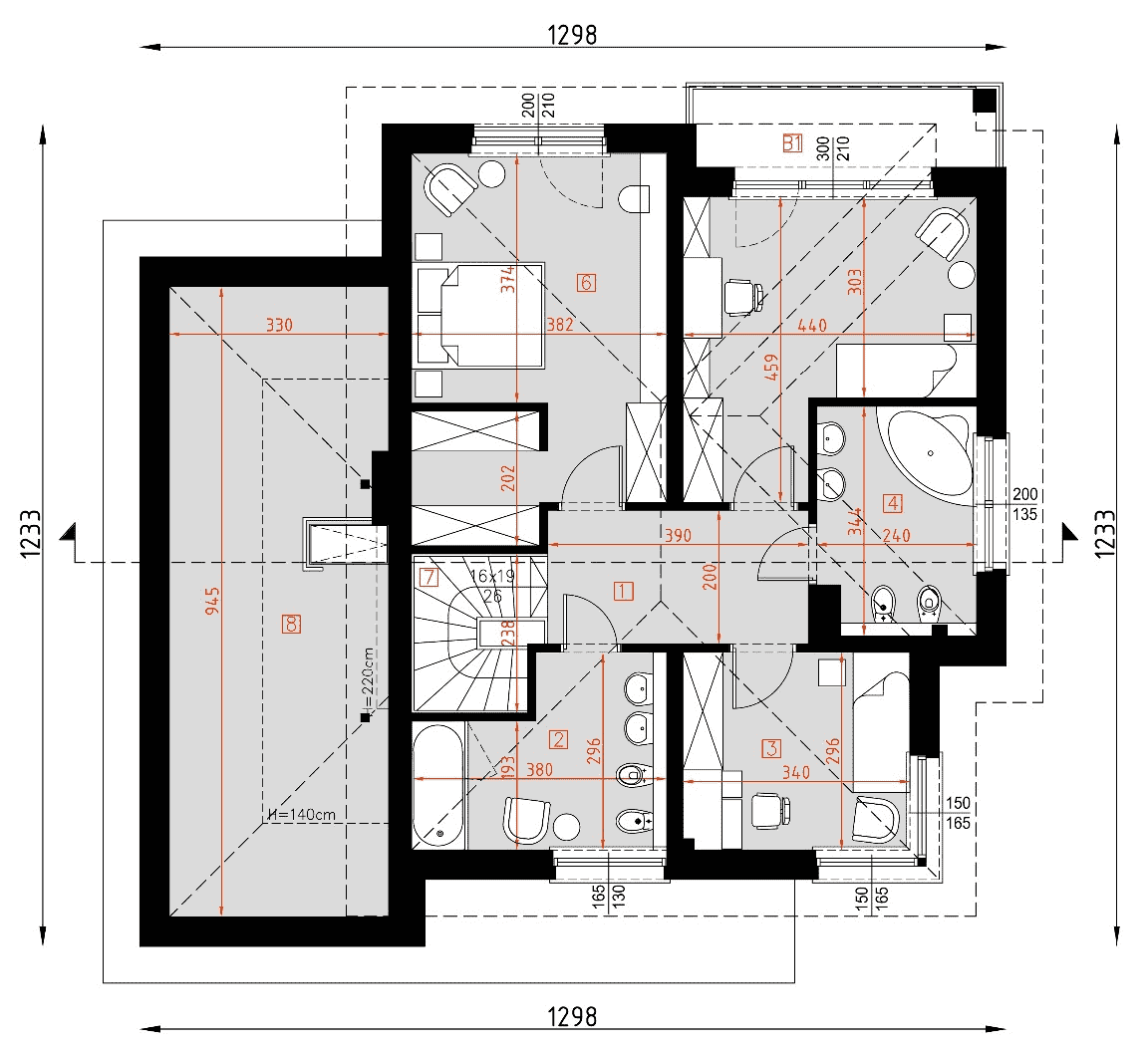 - rzut dachu – wymiary dachu, kąt nachylenia wszystkich połaci dachu, rozmieszczenie okien połaciowych, lukarn, kominów.